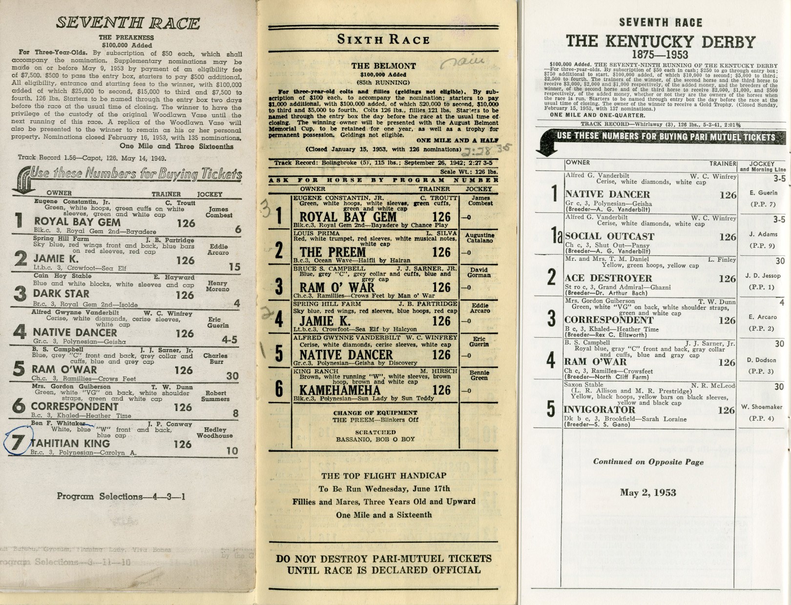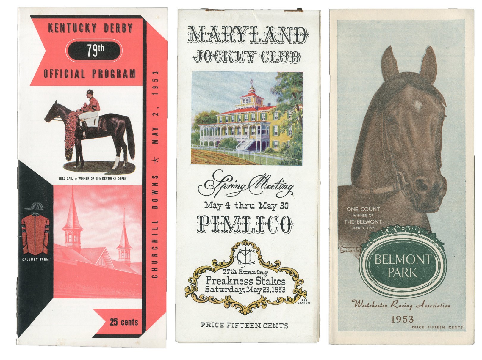 A complete set of programs from legendary Native Dancer’s Triple Crown races with the only blemish of his entire career being a narrow loss in the Kentucky Derby. This set of programs is very difficult to complete as the Preakness and Belmont are extremely elusive. The Derby program is pristine while the Pimlico program has some writing with only one number circled on the Preakness page. The only notations on the Belmont program are to identify the first three finishers as 1-2-3 in the Stakes.
