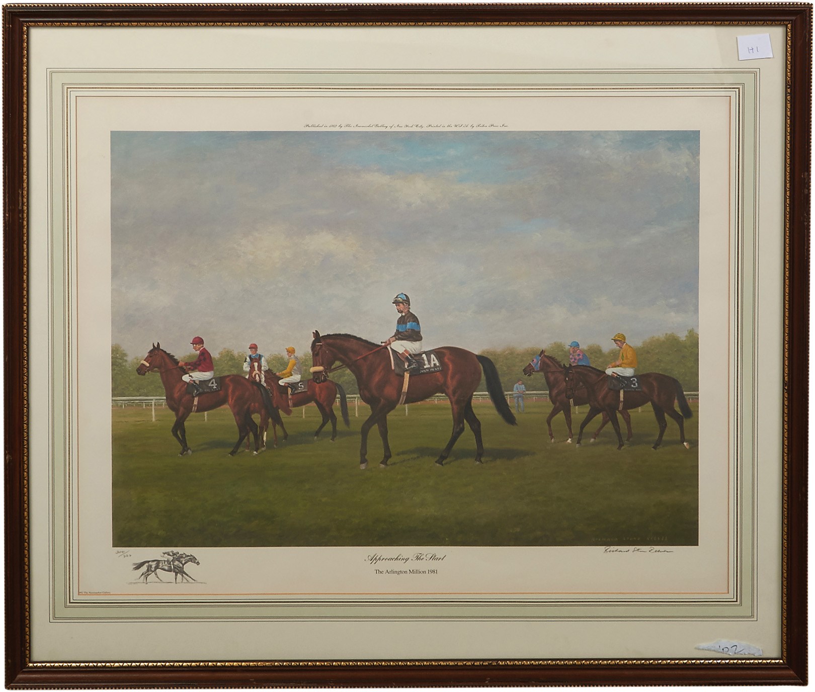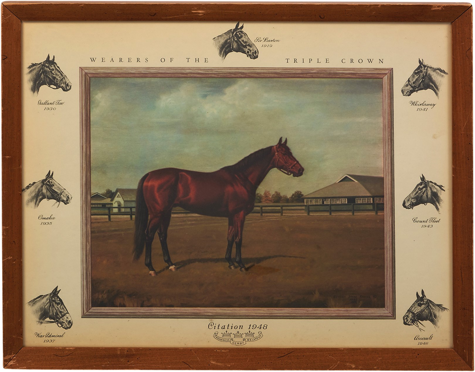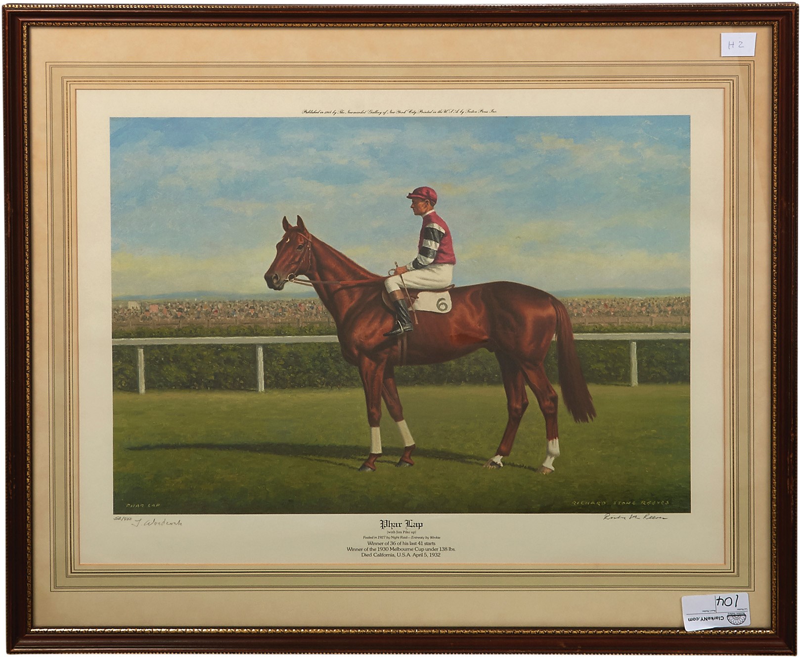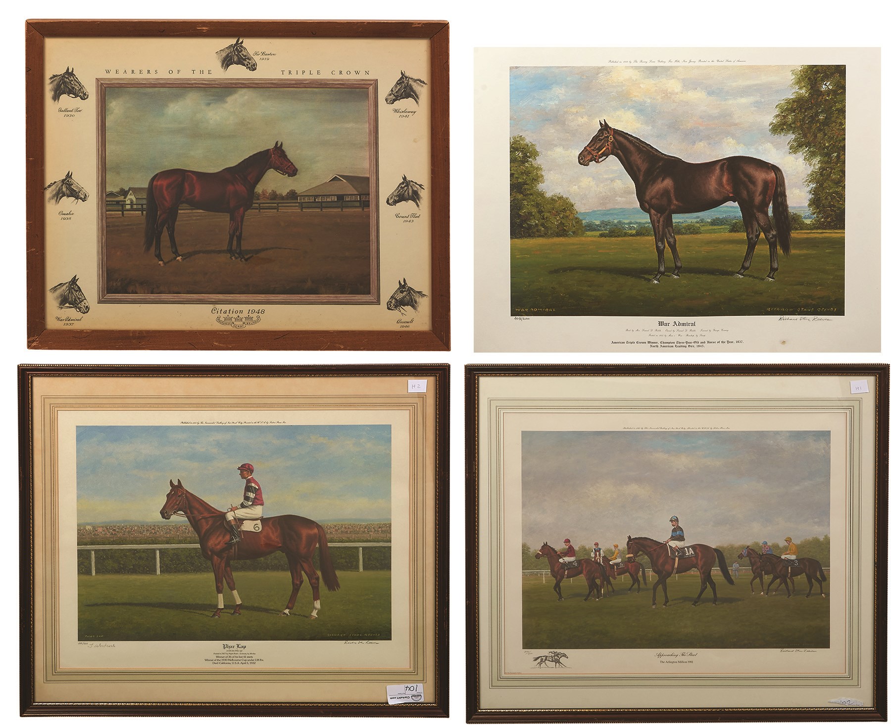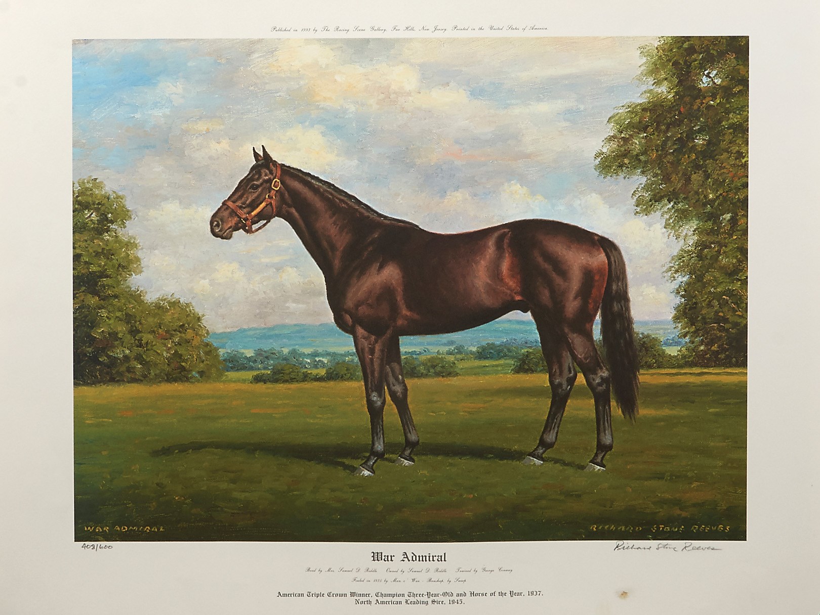 Offered are four examples by Richard Reeves whom The Blood-Horse stated was possibly the greatest of the modern-day equine painters. The racehorses depicted are some of the greats in the sport: 1) Phar Lap, the Australian champion was also signed in pencil by its trainer, Tommy Woodcock. 2) Approaching the start, the Arlington Million 1981 (won by John Henry). Also included is the unmarked actual race program. 3). War Admiral. 4) Citation standing right surrounded by, at the time, heads of all seven previous winners of the Triple Crown. Each of the first three prints was also signed and numbered by Richard Stone Reeves. All with the exception of War Admiral are beautifully framed. NM or better.