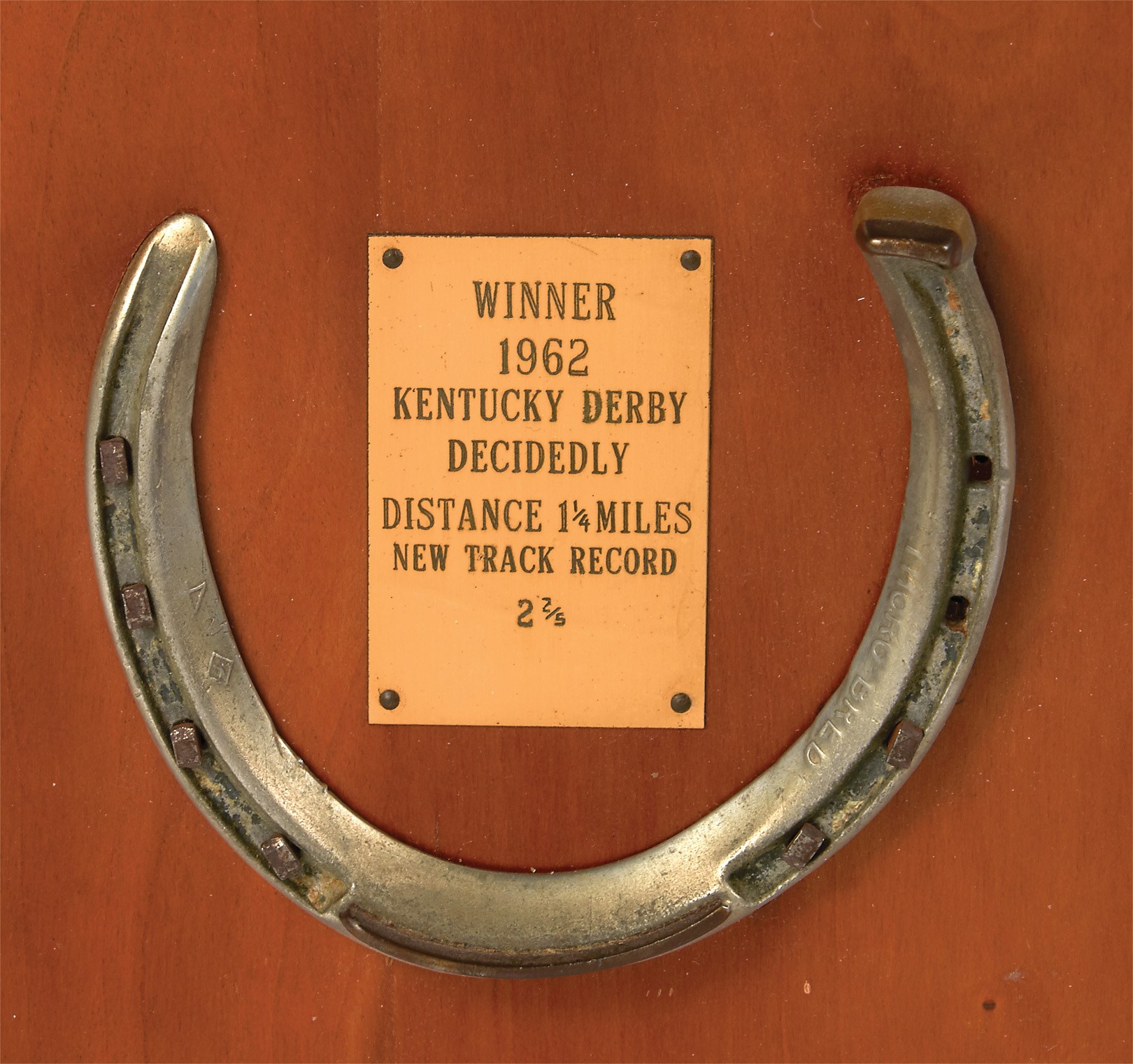 This handsome plaque has that early 1960s Danish Modern vintage appeal, beautifully constructed, with a brass plate incised, "Winner 1962 Kentucky Derby Decidedly Distance 1 1/4 Miles New Track Record 2 2/3." Made by Thoroughbred, the horseshoe shows use and was worn by Decidedly in the 1962 Derby, and is attached to the plaque. Decidedly was the fifth-fastest winner in the history of the Derby. He was sired by Determine who also won in 1954. This was a very important horse, and only a few horses ran the Kentucky Derby faster. Measures 11.5x8x.75", condition is beautiful NM as is the presentation. Incredible find was one of two discovered at a recent estate in Woodstock, Georgia.
