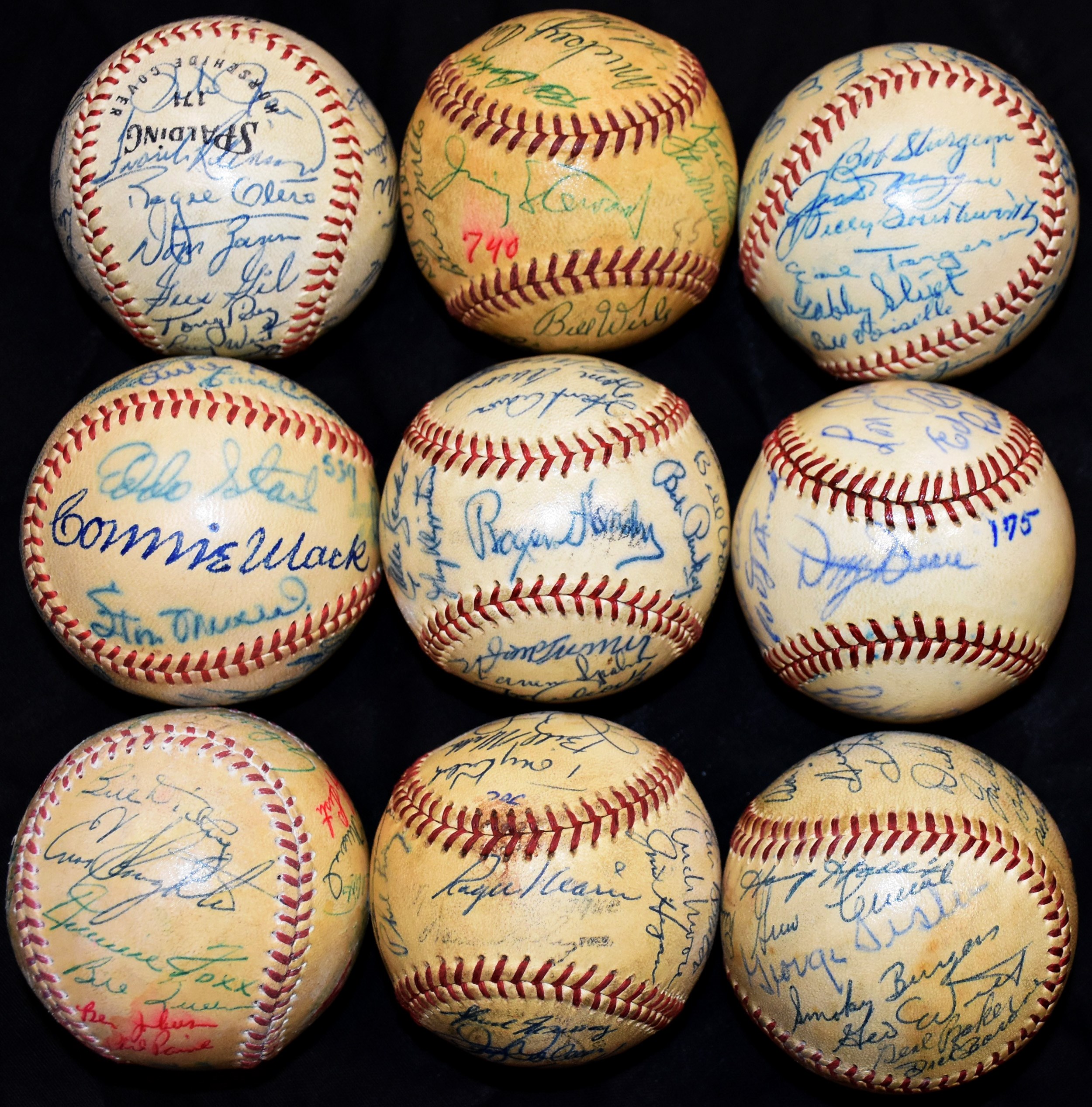 The balance of the John O'Connor collection, this treasure trove of baseball memorabilia contains more than 225 team-signed baseballs and over 4,000 signatures! The mostly OAL and ONL period balls from the 1940s-60s average 20+ signatures per ball, with World Series teams, rookie era signatures, and a little bit of everything. The Yankees, Dodgers, Phillies, Red Sox, White Sox, Athletics, Pirates, Orioles, Tigers, Twins, Cardinals, Senators, Braves, Mets all appear on multi team-signed balls. The notable signatures include Jimmie Foxx, Rogers Hornsby, Casey Stengel, Connie Mack, Roger Maris, Dizzy Dean, Joe DiMaggio, Hank Aaron, Yogi Berra, Heine Manush, George Sisler, Gabby Hartnett, Jimmy Stewart (actor), Bill McKechnie, Billy Martin, Stan Musial, Bill Dickey, Joe Gordon, Grantland Rice, Pete Rose (rookie era), Bennie Bengough, Steve O'Neill, Earle Combs, Harvey Haddix, Edd Roush, Leo Durocher, Don Hoak, Steve O'Neill, Al Kaline, Brooks Robinson, Nellie Fox, Cal Hubbard, Walt Alston, Richie Ashburn, Eddie Mathews, Mel Allen, Pee Wee Reese, Harry Caray, Elston Howard, Willie Stargell, Danny Murtaugh, George "Sparky" Anderson, Harmon Killebrew, with many multiples. Another highlight is the inclusion of six 1963 Dodges & Yankees dual team-signed balls with Durocher, Alston, Dressen, Gilliam, Ford and more. The sigs average 6.5/10, while the balls are overall EX and some are NM (as you would expect in a collection so vast, it's bit of a mixed bag). The balls come with original Spalding ball bags and handwritten inventory numbers on them from O'Connor.