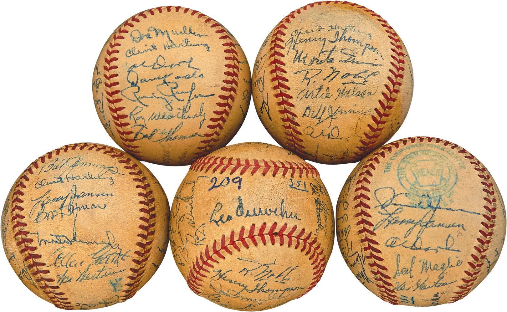They rode Bobby Thomson's "Shot Heard Round the World" to the National League Pennant before losing the World Series to the hated crosstown rival Yankees. The 1951 Giants remain one of the most memorable baseball clubs, and these five team-signed balls come directly from the NL Champs. They average 20 signatures each, and are nearly identical. Notable names include: Leo Durocher, Bobby Thomson, Monte Irvin, Wes Westrum, Bill Rigney, Sal Maglie and more. Artie Wilson appears on all five. The overall condition of the balls averages 5.0, with signatures averaging 6.5. The Official American League (Harridge) or Official National League (Frick) balls come with their original Spalding ball bags, and there are handwritten inventory numbers on the balls, which originate from the collection of John O'Connor.