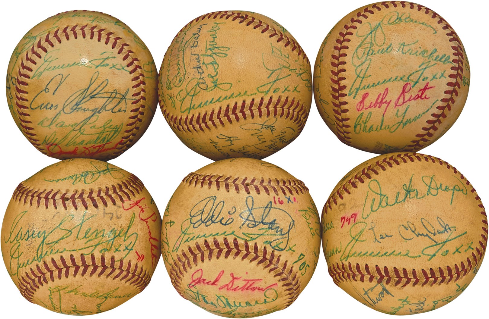 Hall of Fame slugger Jimmie Foxx is well-represented on these six multi-signed baseballs, having signed each on Official National League (Frick or Giles) and Official American League (Harridge) baseballs. Each ball boasts 20+ signatures on average, several of which are signed in multiple colors such as green, blue and red. Here's the roster rundown: Foxx (6), Casey Stengel (4), Henry Aaron, Stan Musial (3), Heinie Manush, Dan Topping, Bill Dickey, Red Barber, Eddie Mathews, Jim Bunning, Lefty Gomez, Augie Donatelli, Phil Rizzuto and more. There are some New York News, Newark News and Cincinnati Post members included as well. Conditions of the balls average 5.0 while the signatures are roughly 7.0. There are handwritten inventory numbers on the balls, which come directly from the collection of John O'Connor. The balls come with original Spalding ball bags.