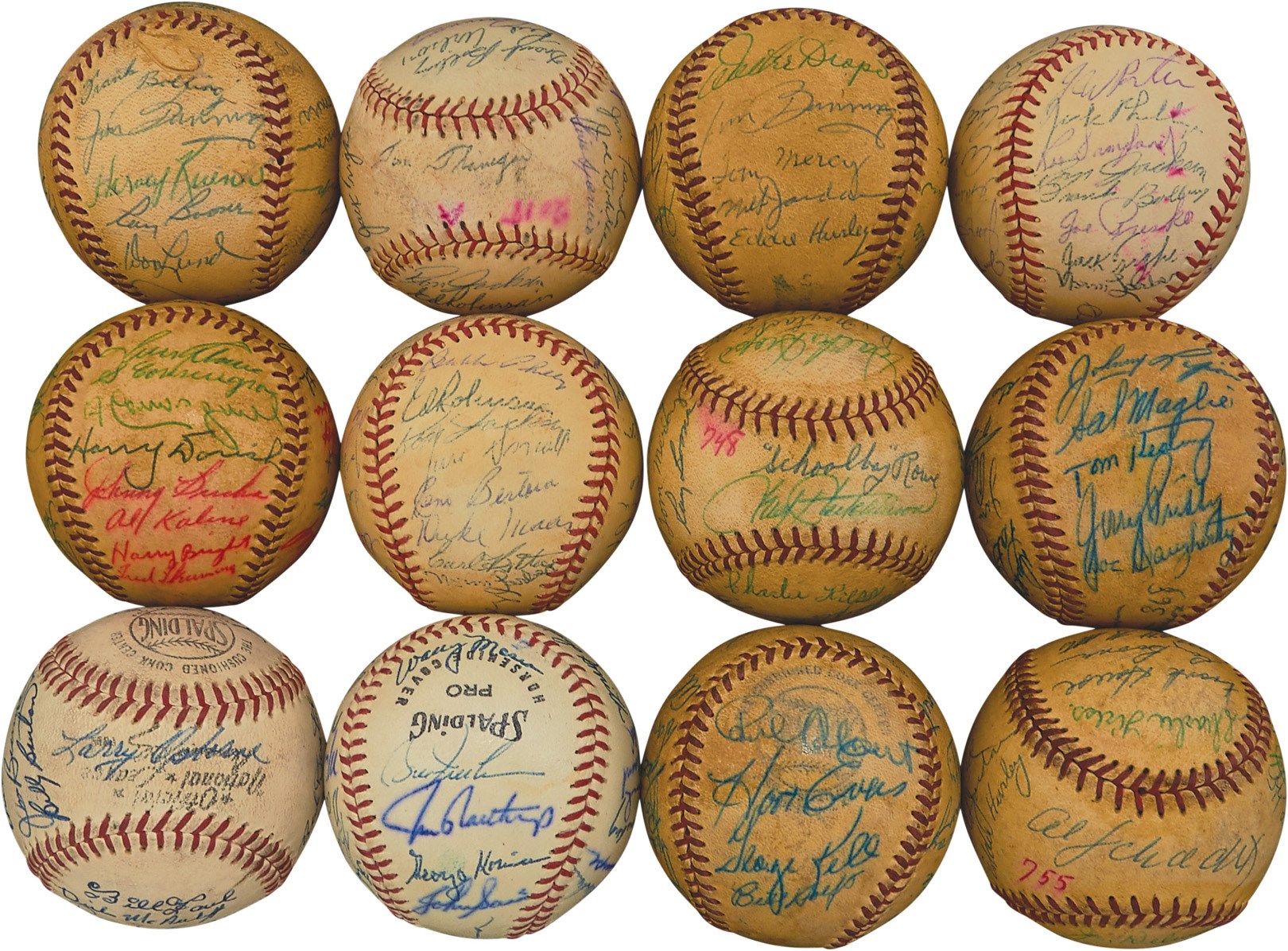 Twelve Tigers team-signed baseballs circa 1951-67 highlight this awesome lot. Here's the breakdown: 1951, 1952, c. 1953, 1954 (3), 1955, 1957 with White Sox (3), 1962, 1963 . There are an average of 20+ signatures per ball, including Al Kaline (rookie era), George Kell, Harvey Kuenn, Jim Bunning, Fred Hutchinson, Hoot Evers, Red Wilson, Red Rolfe and many more. The signatures from the Chisox include Luis Aparicio, Al Lopez (ss), Duke Maas and more. Most are Official American League period baseballs in original Spalding bags with handwritten inventory numbers on the balls from the collection of John O'Connor. The conditions average 5.0, with signatures averaging 7.0.