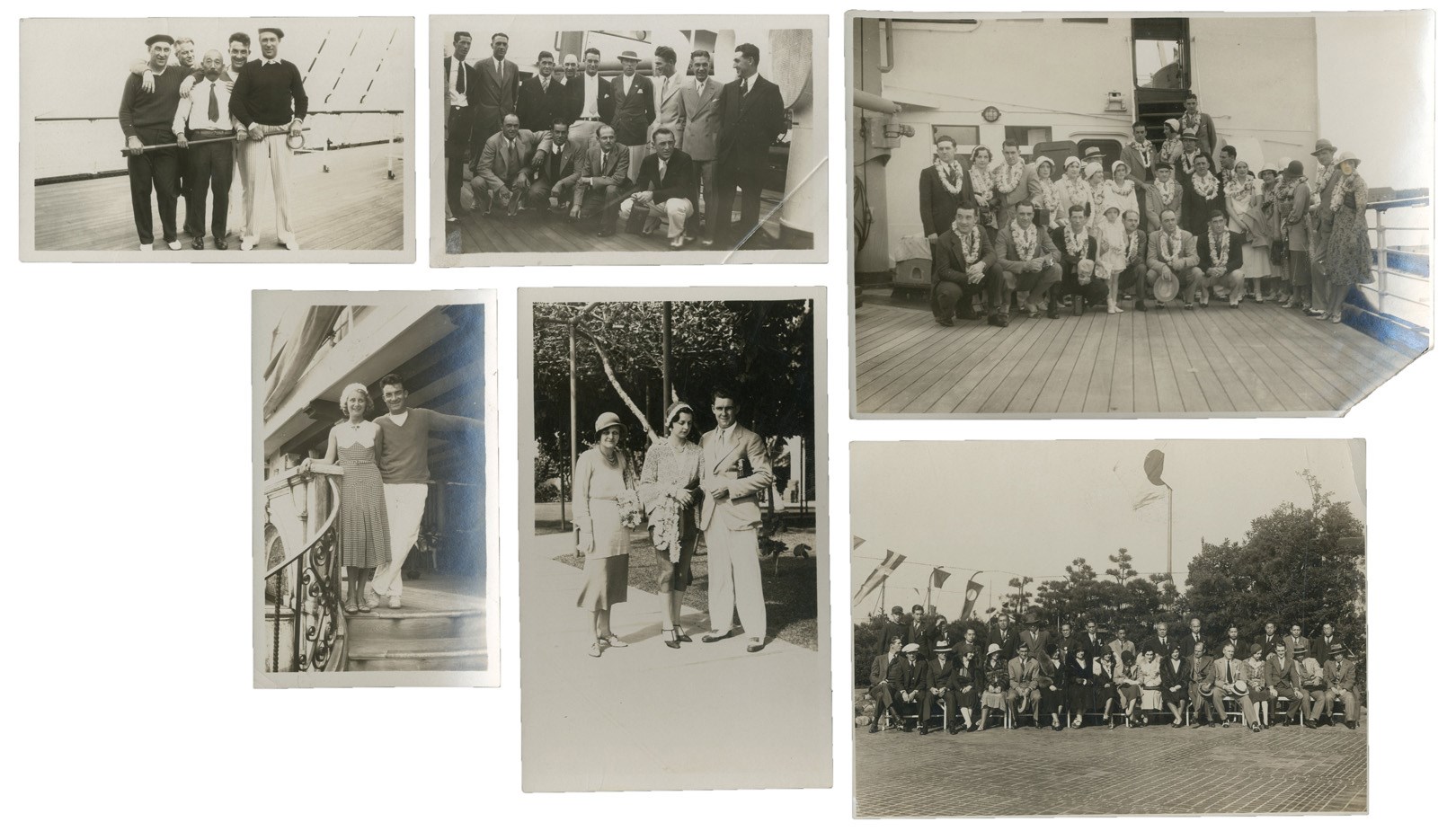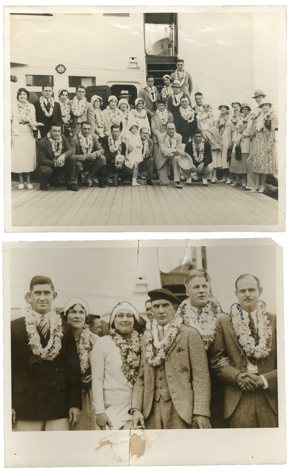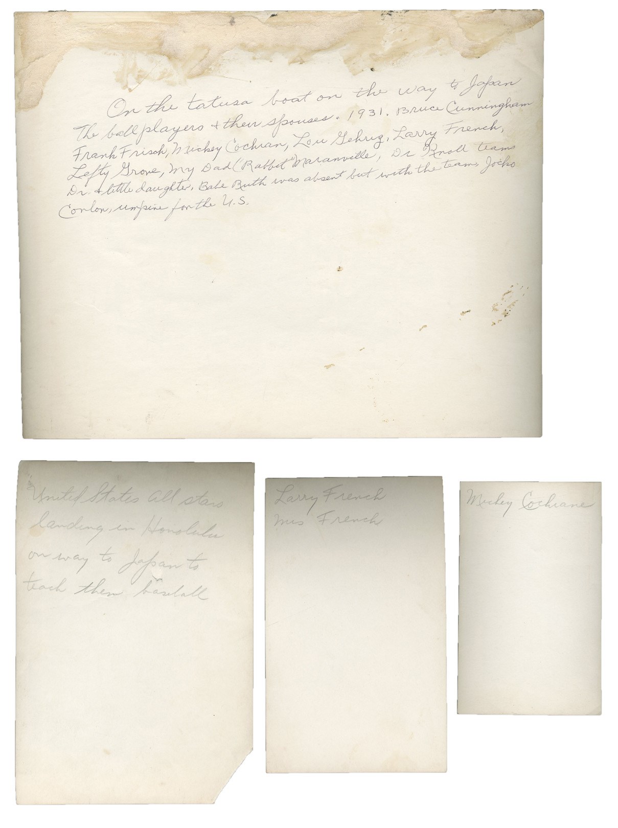 Fantastic compilation of eight photographs of the 1931 Tour of Japan from one of the trip's ambassadors' - Rabbit Maranville's - personal collection. The photos were taken when the team landed in Honolulu en route to Japan. The set includes four team photos, featuring Lou Gehrig, Maranville, Mickey Cochrane, Frank Frisch, Lefty Grove, Larry French, Jocko Conlan and more. They range in size from 2.625x4.25" to 8x10". On the back of an 8x10" team photo, there is a handwritten roster that reads "my dad (Rabbit) Maranville." One photo has large tears, while the rest have minor creasing and are otherwise VG-EX.