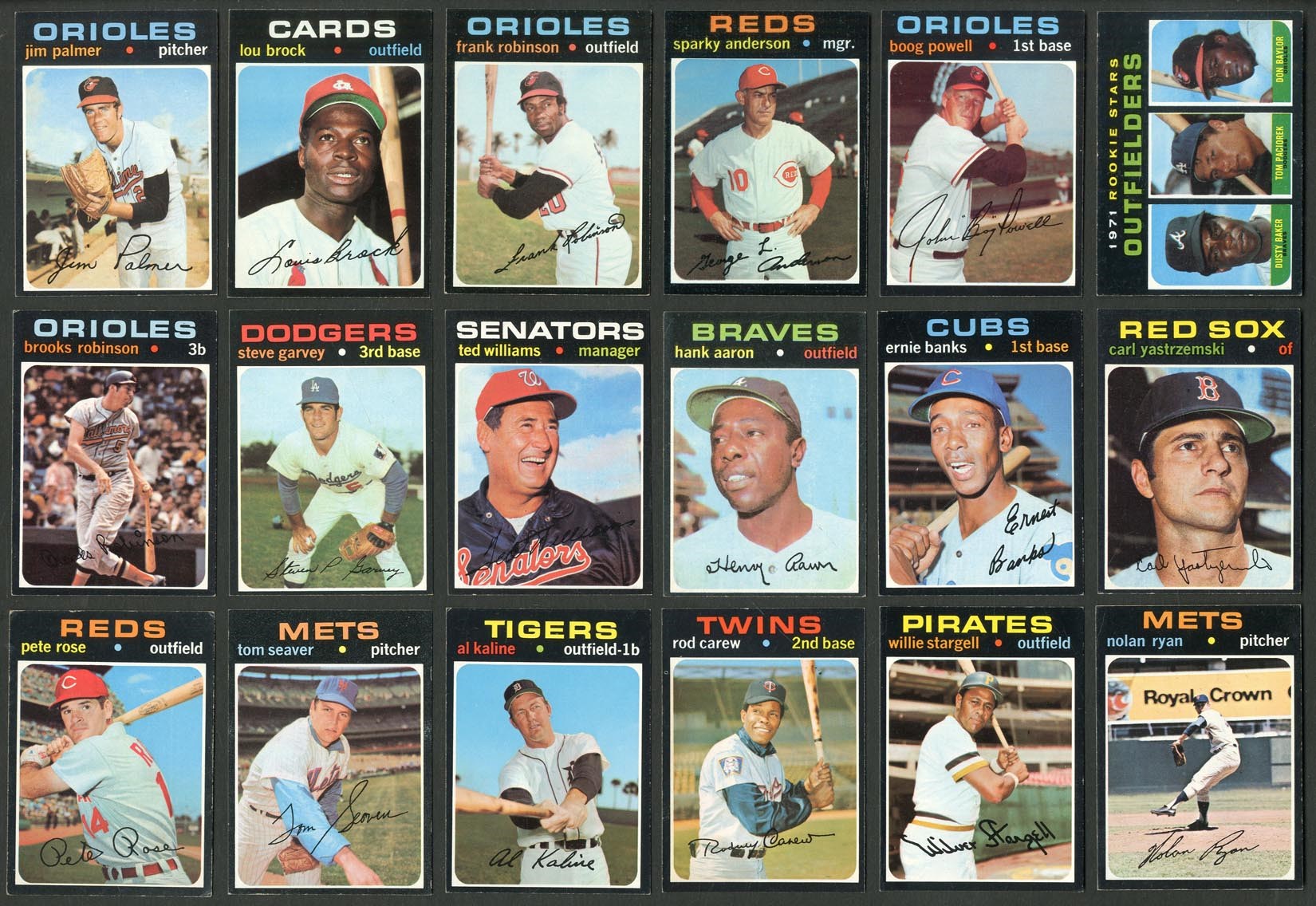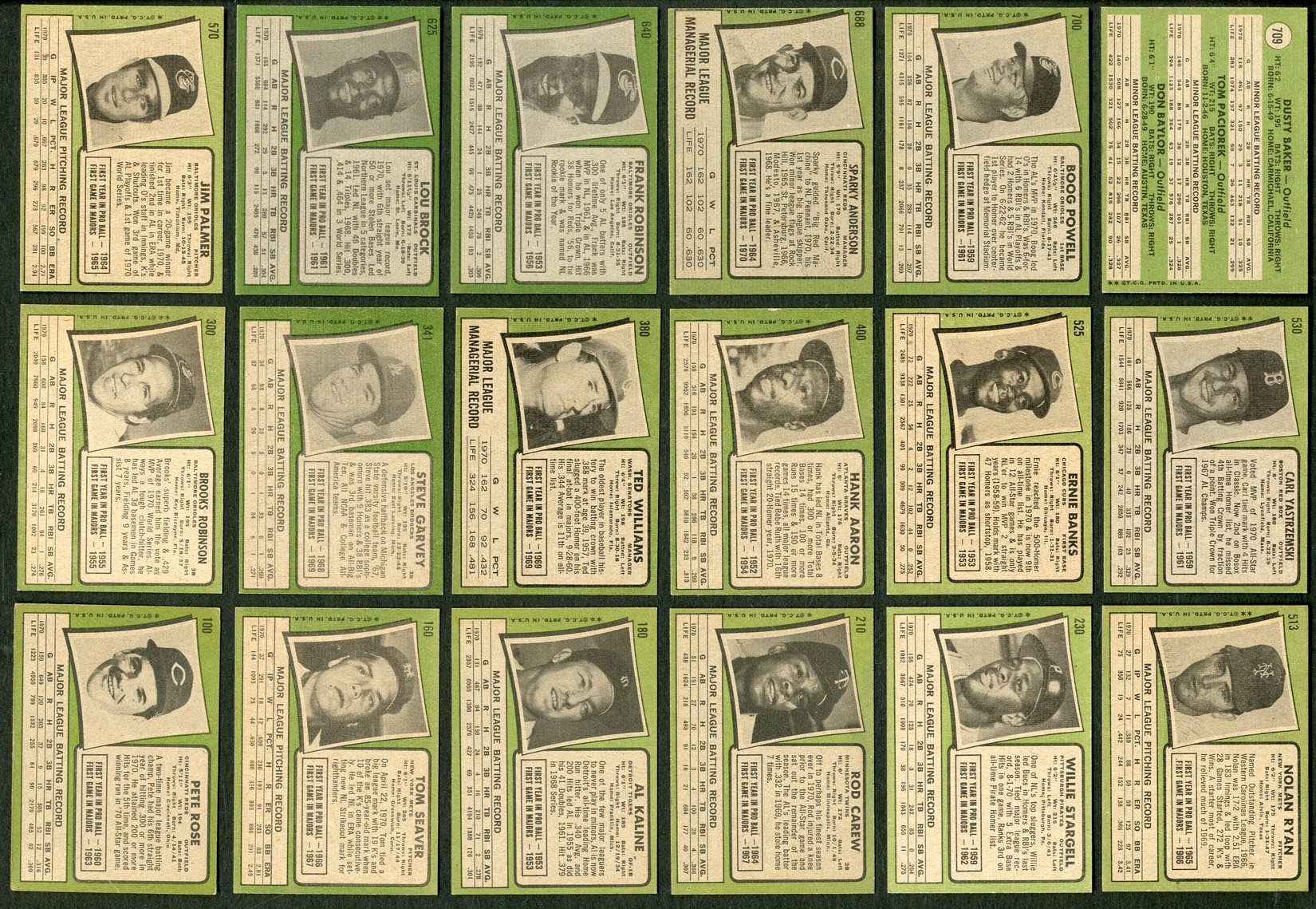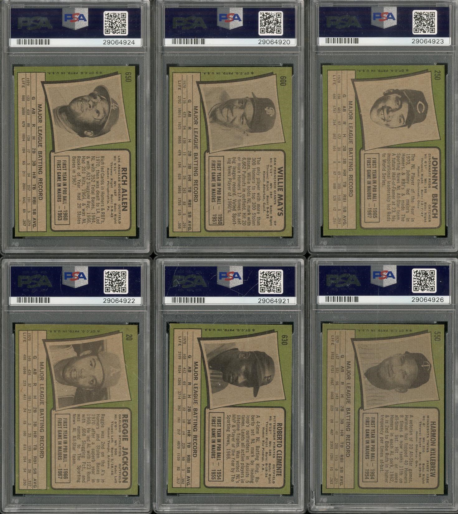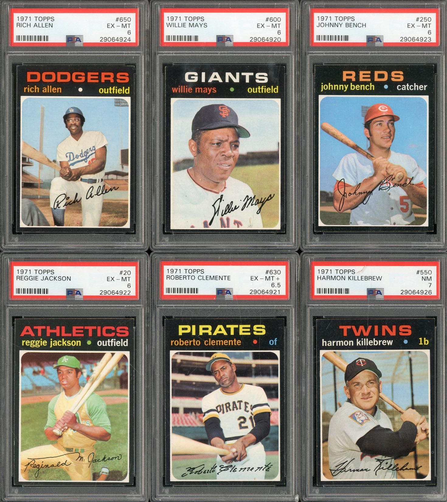 Very nice 1971 Topps set from the same consignor who owned all those wonderful sets in our Masters auction from March 2017. Includes: Graded Cards (6) - PSA NM 7: 1 card, #550 Killebrew. PSA EX-MT+ 6.5: 1 card, #630 Clemente. PSA EX-MT 6: 4 cards w/#20 Jackson, 250 Bench, 600 Mays and 650 Allen. Ungraded Cards - #5 Munson (EX/MT), 20 Jackson (NM), 55 Carlton (NM), 100 Rose (VG), 160 Seaver (EX/MT), 180 Kaline (EX/MT), 210 Carew (NM), 300 B. Robinson (EX), 341 Garvey RC (NM), 400 Aaron (EX/MT), 513 Ryan (EX/MT), 525 Banks (EX/MT), 530 Yastrzemski (EX/MT), 570 Palmer (NM), 625 Brock (NM), 640 F. Robinson (EX/MT), 688 Anderson SP (NM), 700 Powell SP (NM) and 709 Baylor/Baker RC (EX). Grades 35% NM or better, 55% EX to EX/MT, 10% lesser.