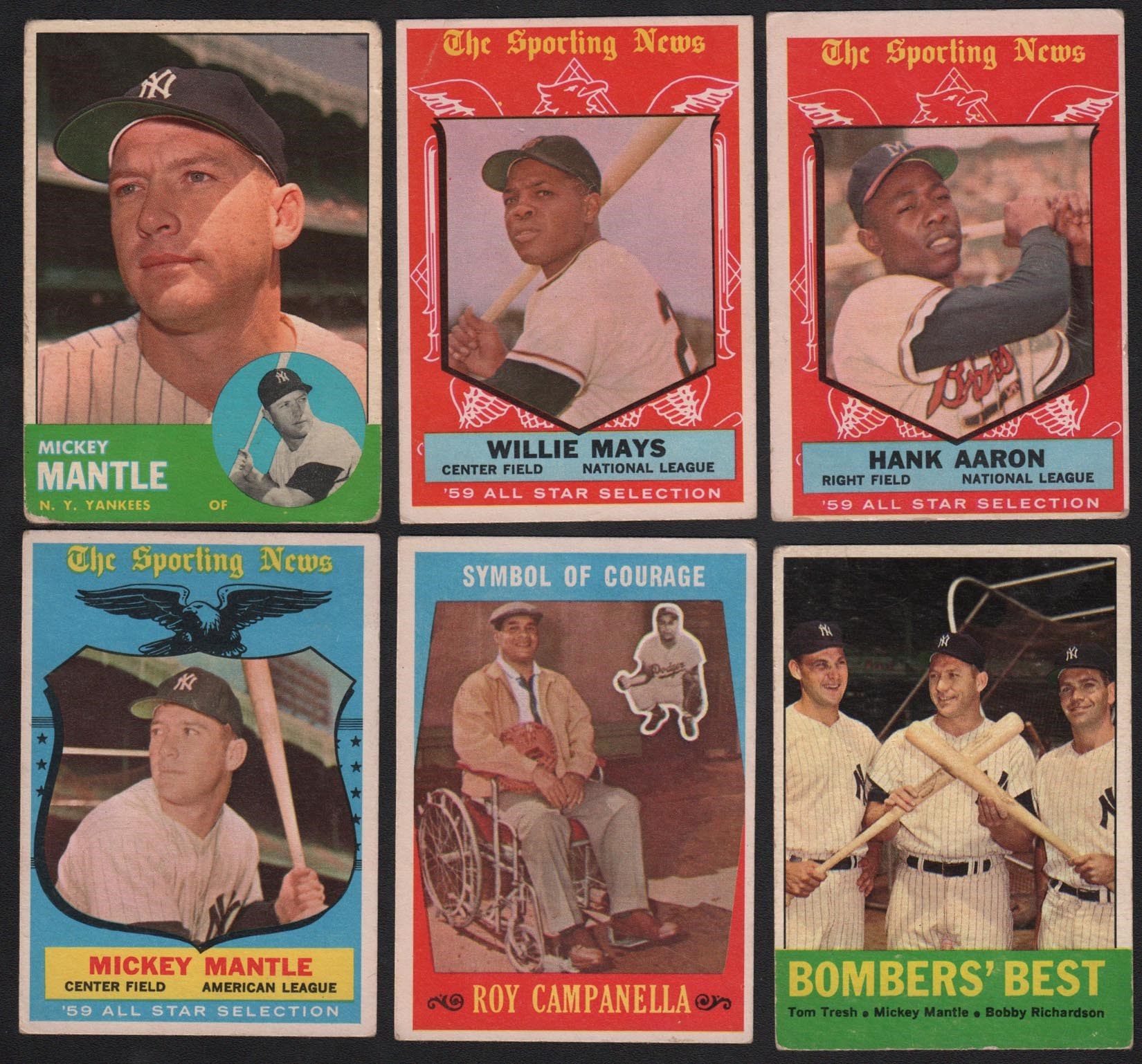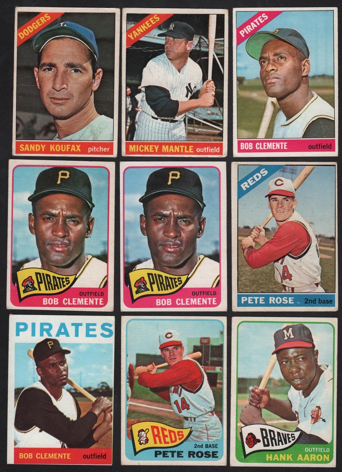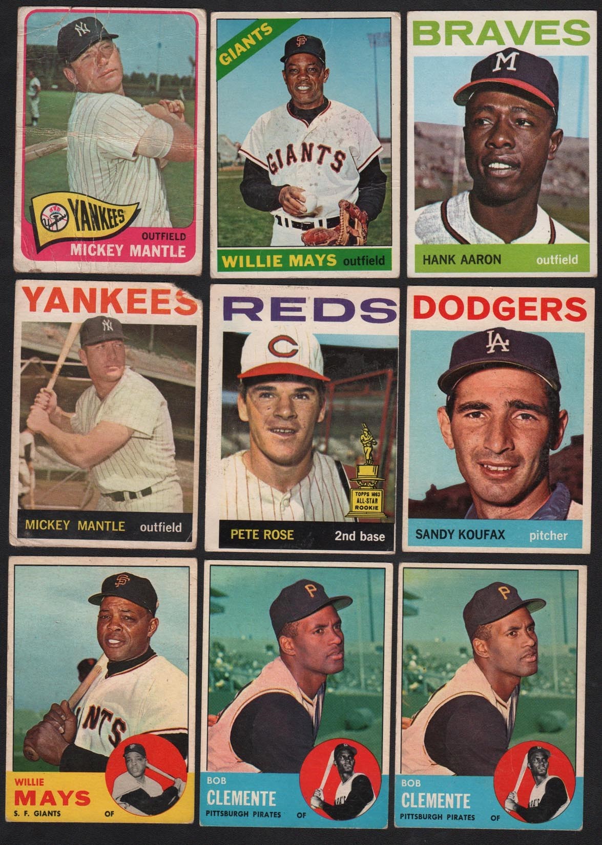 Offered is a fresh collection of over 130+ Topps Hall of Fame and superstar cards, with the following players represented with quantities: Mickey Mantle (11), Roberto Clemente (9), Hank Aaron (3), Sandy Koufax (7) and Willie Mays (9). Includes: 1959 - 24 cards w/#435 Robinson, 450 Mathews, 455 Doby (3), 515 Killebrew (3), 543 Corsair Trio, 550 Campanella, 552, 559 Banks AS (4), 561 Aaron AS (VG), 562 Kaline AS (2), 563 Mays AS (VG), 564 Mantle AS (VG/EX) and 571 Spahn AS (4). 1961 - 1 card, #517 McCovey. 1963 - 14 cards w/#115 Yaz, 120 Maris, 173 Bombers' Best, 200 Mantle (VG), 252 Santo, 275 Mathews, 300 Mays (VG), 360 Drysdale, 400 Robinson, 415 Gibson, 472 Brock, 540 Clemente (2, both VG/EX) and 550 Snider. 1964 - 33 cards w/#35 Mathews, 50 Mantle (PR), 101, 120 Drysdale, 125 Rose (GD/VG), 136 Koufax WS (2), 155 Snider, 175 Williams, 177 Killebrew (3), 200 Koufax (VG/EX), 210 Yaz, 230 Robinson, 300 Aaron (VG/EX), 306 Mays/Cepeda (2), 324, 342 Stargell, 350 McCovey (4), 393, 400 Spahn, 440 Clemente (GD/VG), 460 Gibson (4), 547 Hodges and 570 Mazeroski. 1965 - 29 cards w/#2 LL, 3 Mantle LL (VG/EX), 4, 6, 8 Koufax LL, 110 Santo, 120 Robinson (2), 130 Kaline, 134 Mantle WS (4, all VG), 160 Clemente (2, 1 VG/EX & 1 VG), 170 Aaron (VG), 176 McCovey, 187, 205 Spahn, 207 Rose (VG), 217, 260 Drysdale, 320 Gibson, 350 Mantle (PR), 360 Cepeda, 400 Killebrew, 450, 500 Mathews and 510 Banks (VG). 1966 - 28 cards w/#1 Mays (GD/VG), 30 Rose (GD/VG), 36 Hunter, 50 Mantle (FR/GD), 70 Yaz, 72 Perez, 100 Koufax (GD), 110 Banks, 120 Killebrew (2), 125 Brock, 160 Ford (5), 210 Mazeroski, 215 Clemente/Aaron/Mays LL, 217 LL, 221 LL, 225 LL, 255 Stargell (3), 300 Clemente (EX), 310 Robinson, 320 Gibson and 365 Maris. 1968 (3) - 3 cards w/#100 Gibson, 130 Perez and 472. Others - 1 card, 1963 Post Willie Mays.
