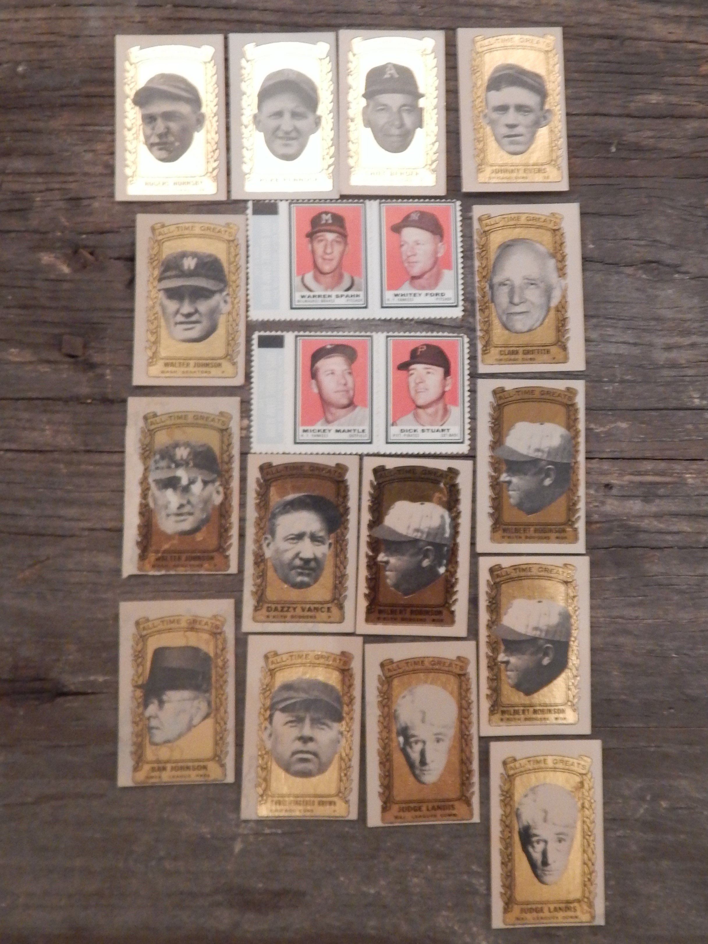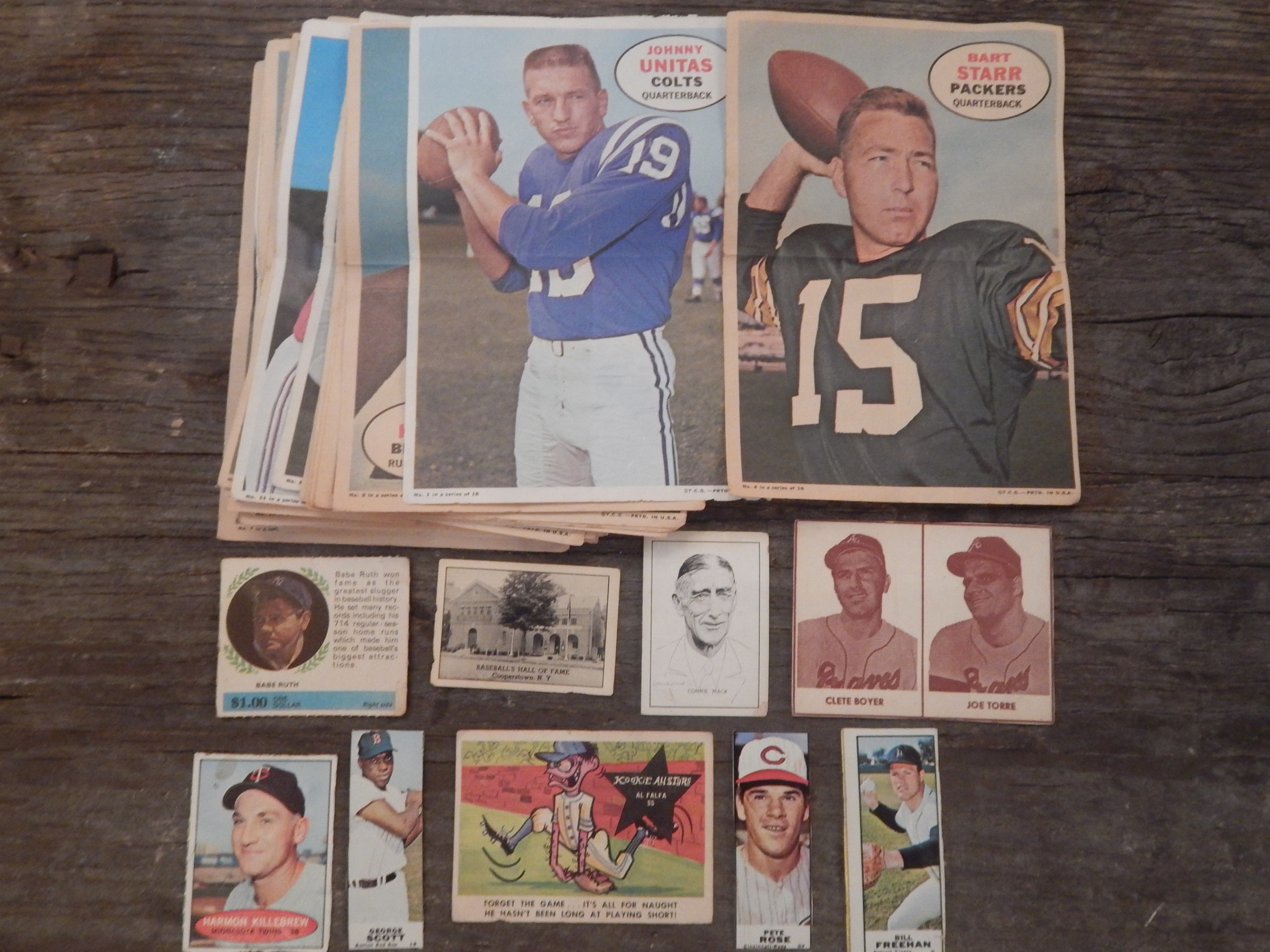Lots of great stuff here with many scarcities: 1) 1968 Topps Football Posters w/many stars (25). 2) 1967 & 1970 Topps Baseball Posters with Aaron & McCovey. 3) Three 1971 Topps Coins (Clemente, Rose, Carew). 4) Several Baseball stamps & other Topps inserts. 5) 1963 Bazooka All-Time Greats (tough!). High grade, overall EX-MT with many NM or better (Walter Johnson). 6) 1962 Topps baseball stamps with high grade "double" stamps of Mantle/Stuart and Spahn/Ford. 7) Various unusual issues with Post Cereal, Transogram, Bazooka, Golden Press, and large group of Atlantic Stars cards with Clemente & more. 100+ pieces.
