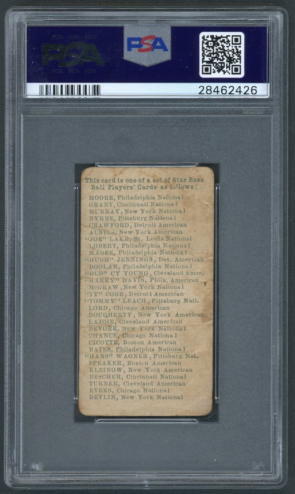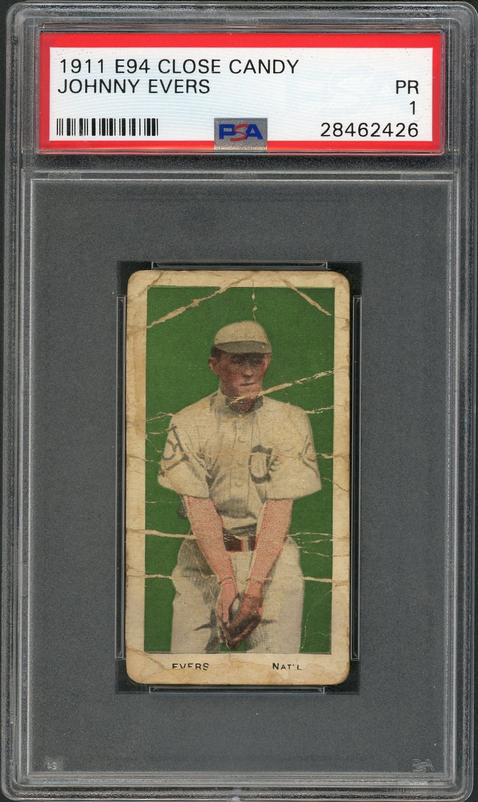 Graded by PSA PR 1. Extremely rare cards issued by the George Close Candy Company of Cambridge, MA. Each of the 30 cards in this rare set were issued with different colors, and with up to 11 different back stamps. This is the green background with no back stamp of Johnny Evers, Chicago Cubs HOFer.