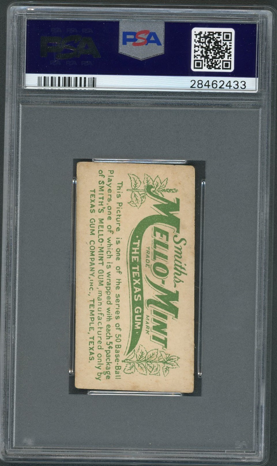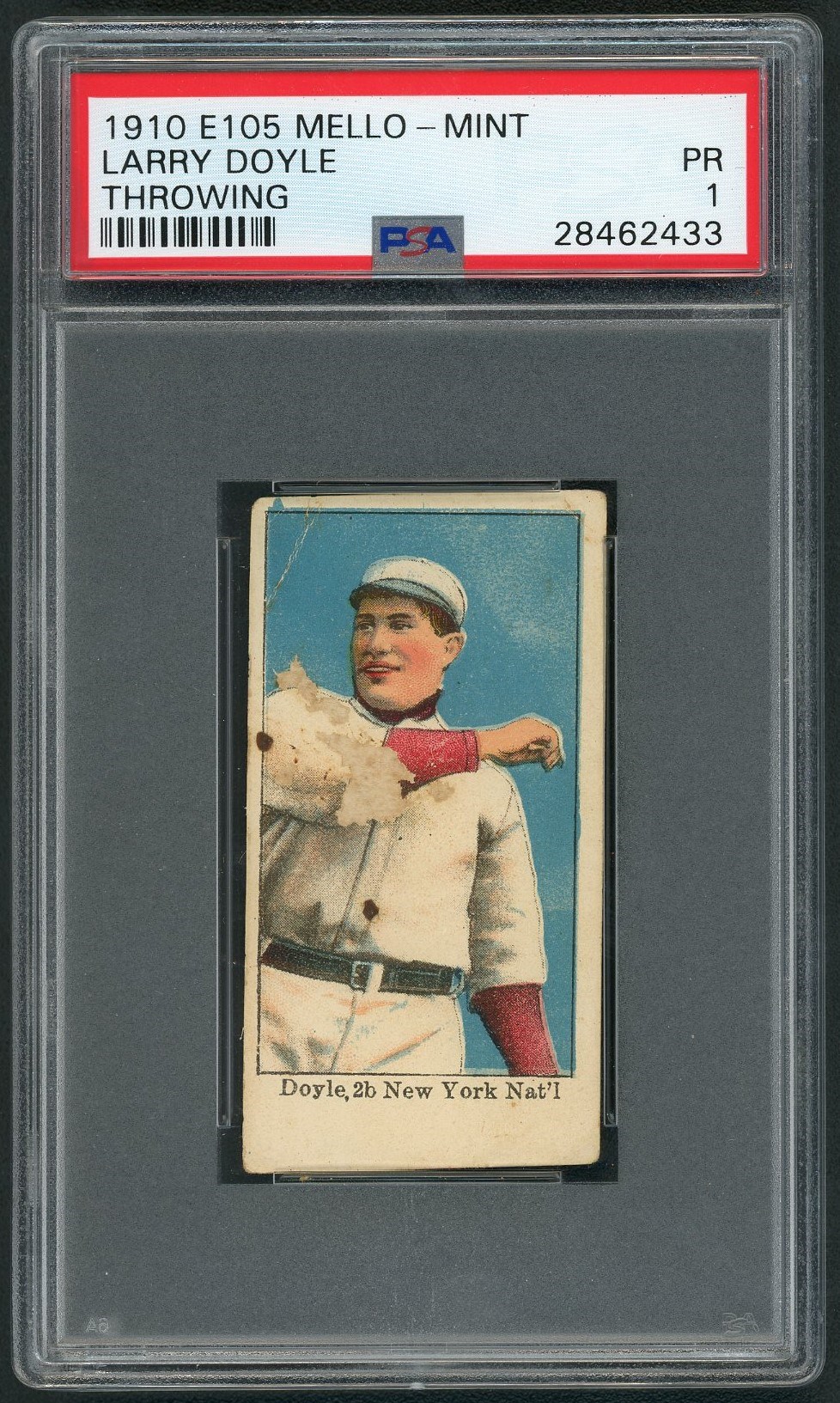 Graded by PSA PR 1. Popular candy card of Larry Doyle, throwing variation. The bright green print on the reverse adds status to the very highly scarce Mello-Mint card, issued during the candy and tobacco cards height of popularity. Bold blue color, solid print on reverse. Light creasing, with moderate paper loss on obverse.