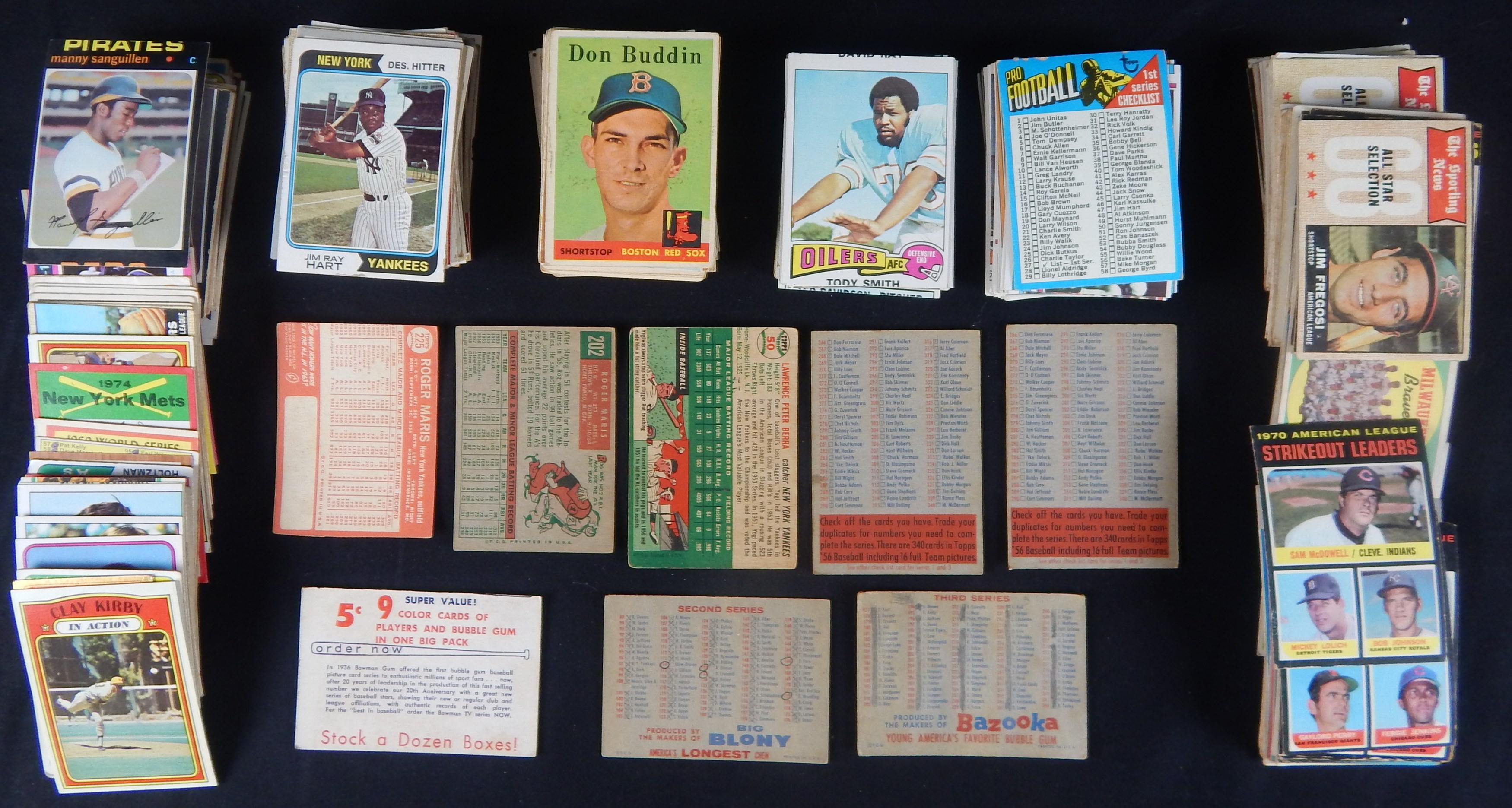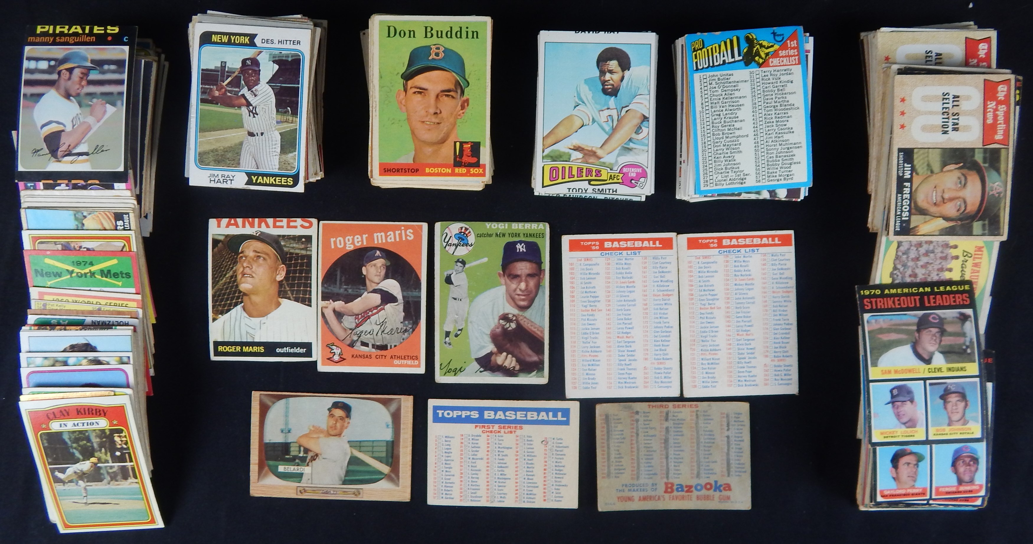 Conglomeration of 350+ cards, mostly baseball but some football. Mixed condition which run the gamut of PR-EX, with many of the FB cards being miscut. Includes a couple marked checklists from 1956 (2) and 1957 (2), plus a couple low grade Yogi Berra and Roger Maris cards.