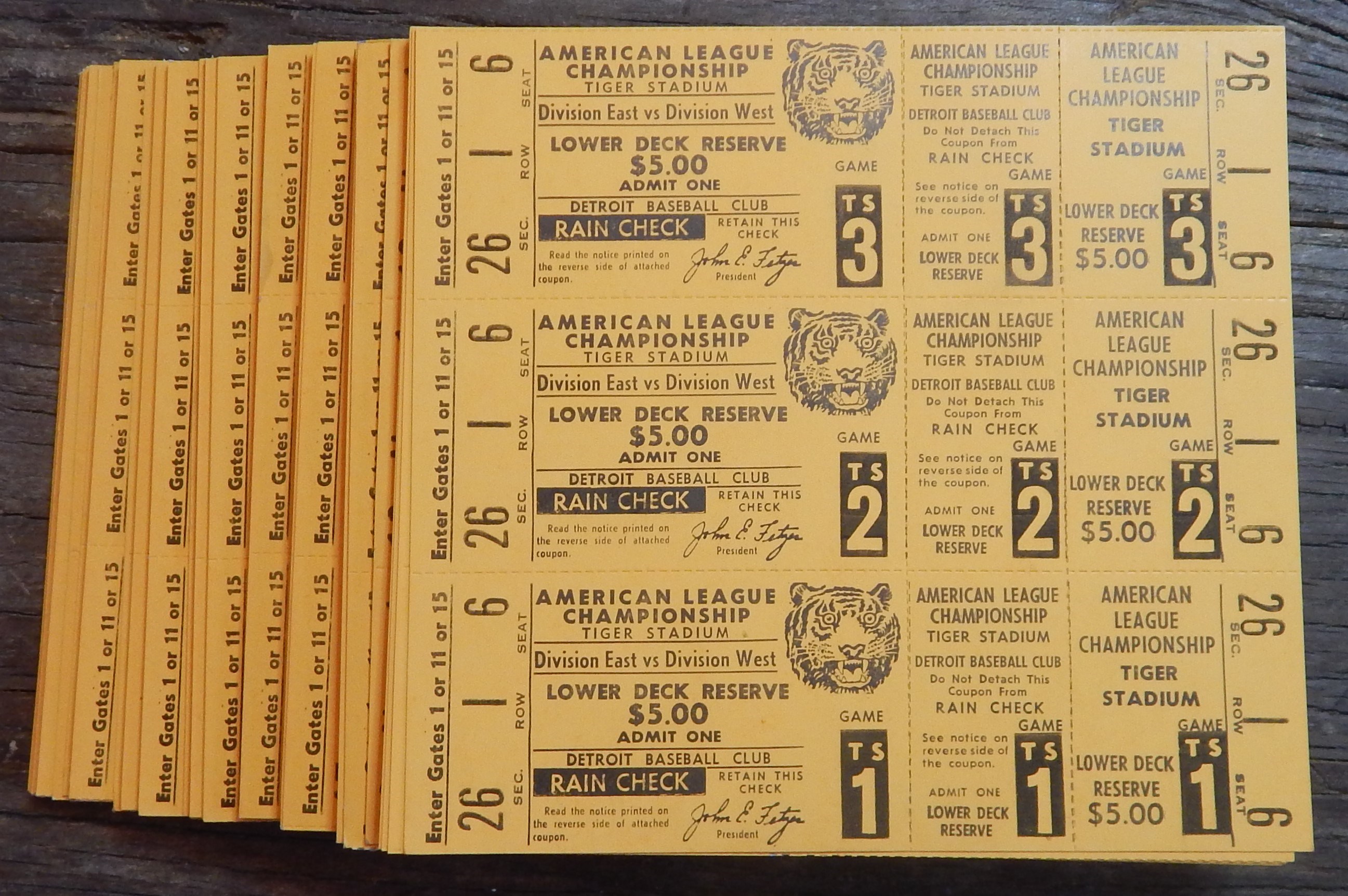 These beauties were issued in 1972 and were to be used for the ALCS. However, the schedule was changed and Games 1-2 were moved to Oakland. There for they had to scrap them and print new tickets reflecting the new schedule. There are three tickets on each perforated and untorn sheet (Games 1 to 3), there are 100 sheets for a total of 300 tickets. These are NOT proofs; they are the REAL THING with real consecutive seat numbers!