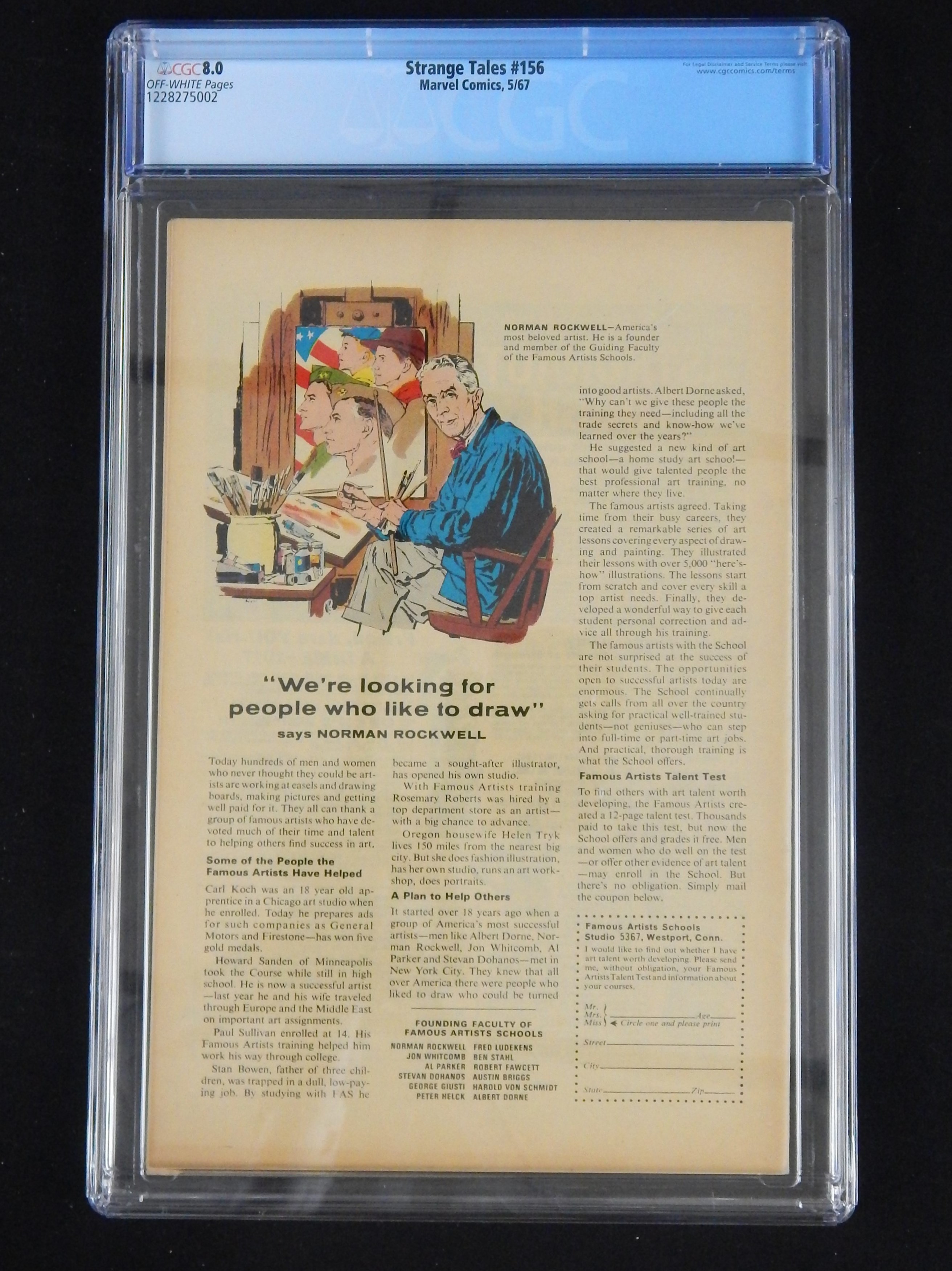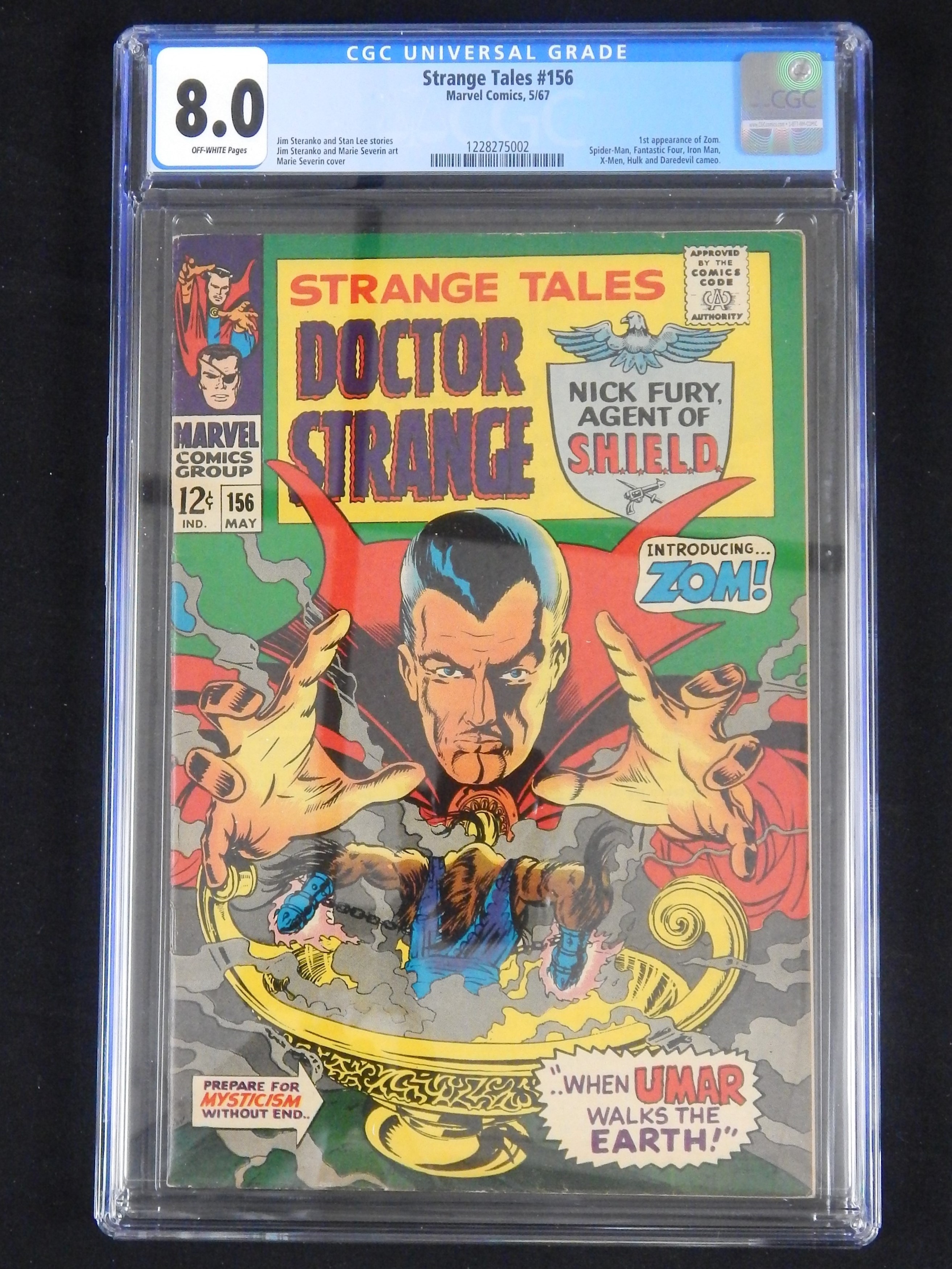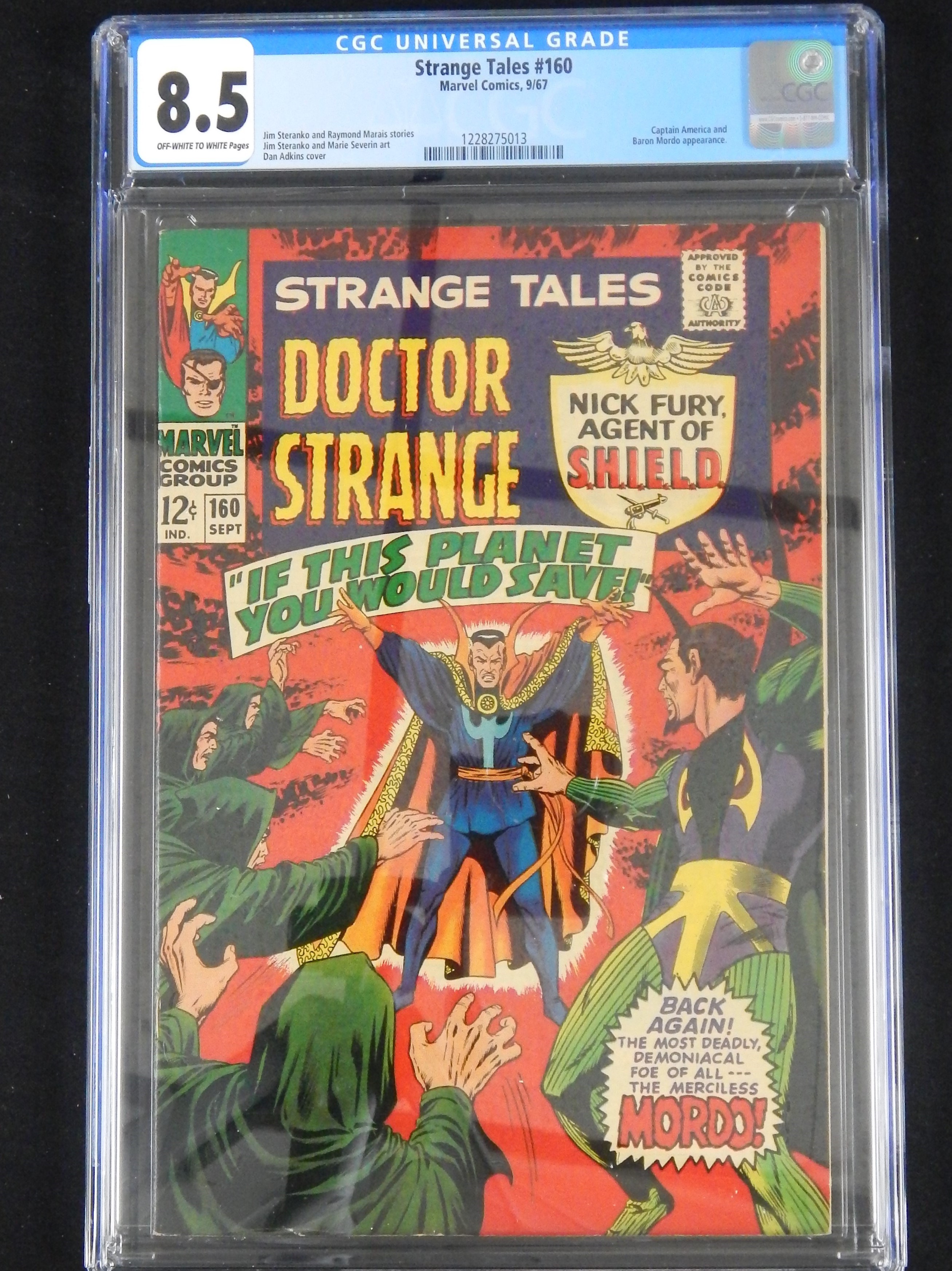 Superlative work by the great Jim Steranko: Strange Tales 156 CGC 8.0, Strange Tales 157 CGC 7.0, Strange Tales 160 CGC 8.5, Strange Tales 161 CGC 8.0, Strange Tales 163 CGC 8.5, Strange Tales 165 CGC 8.5.