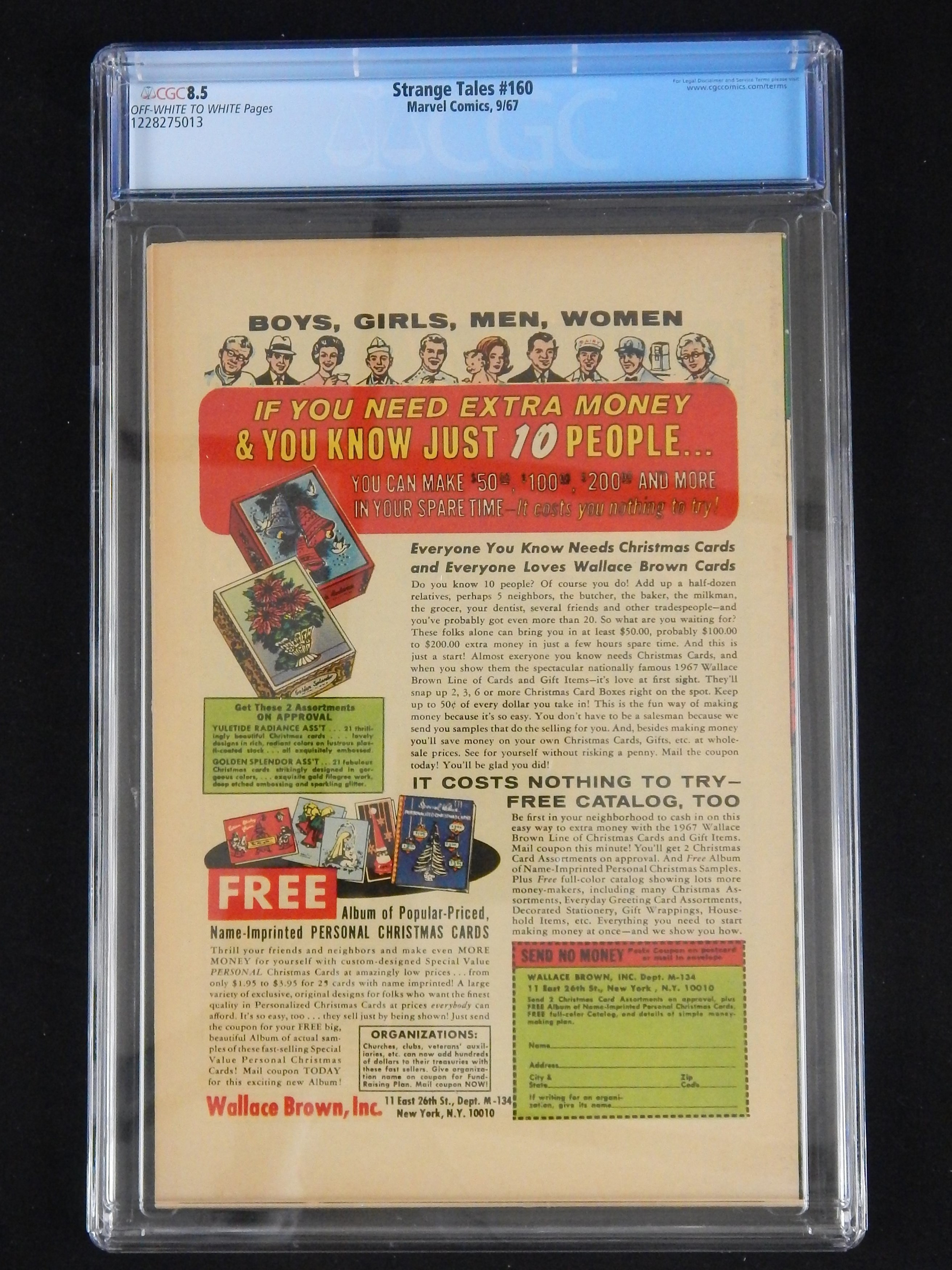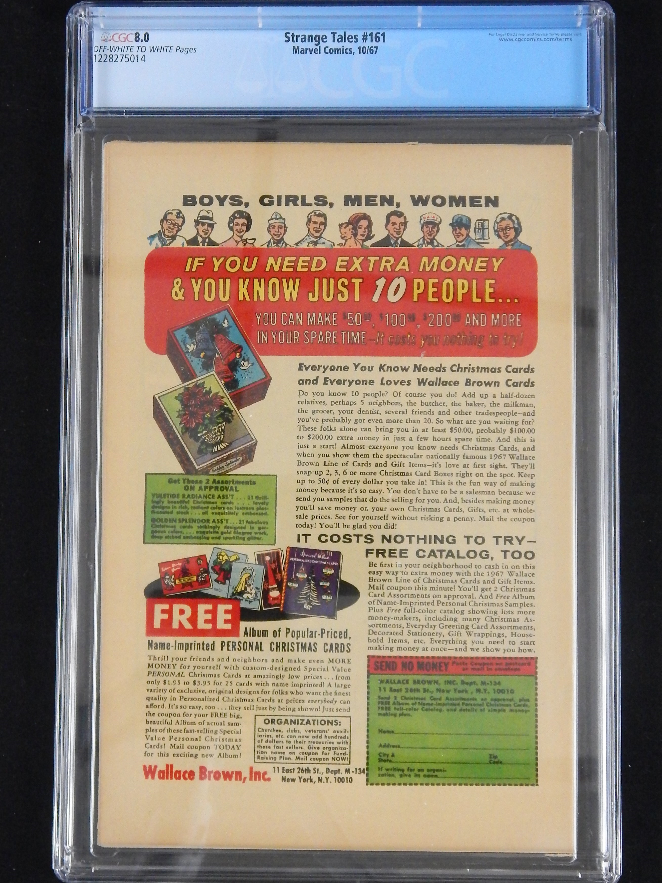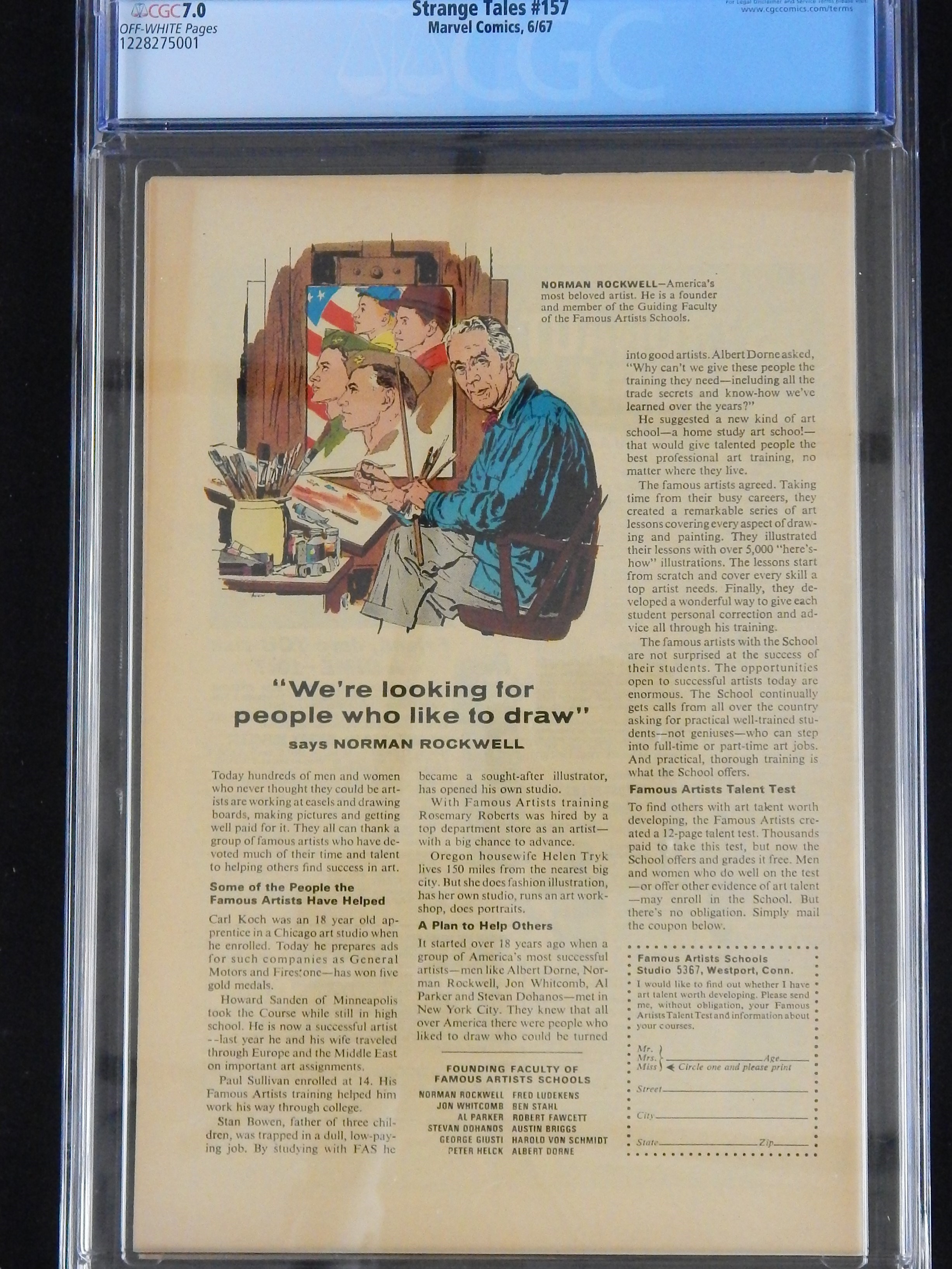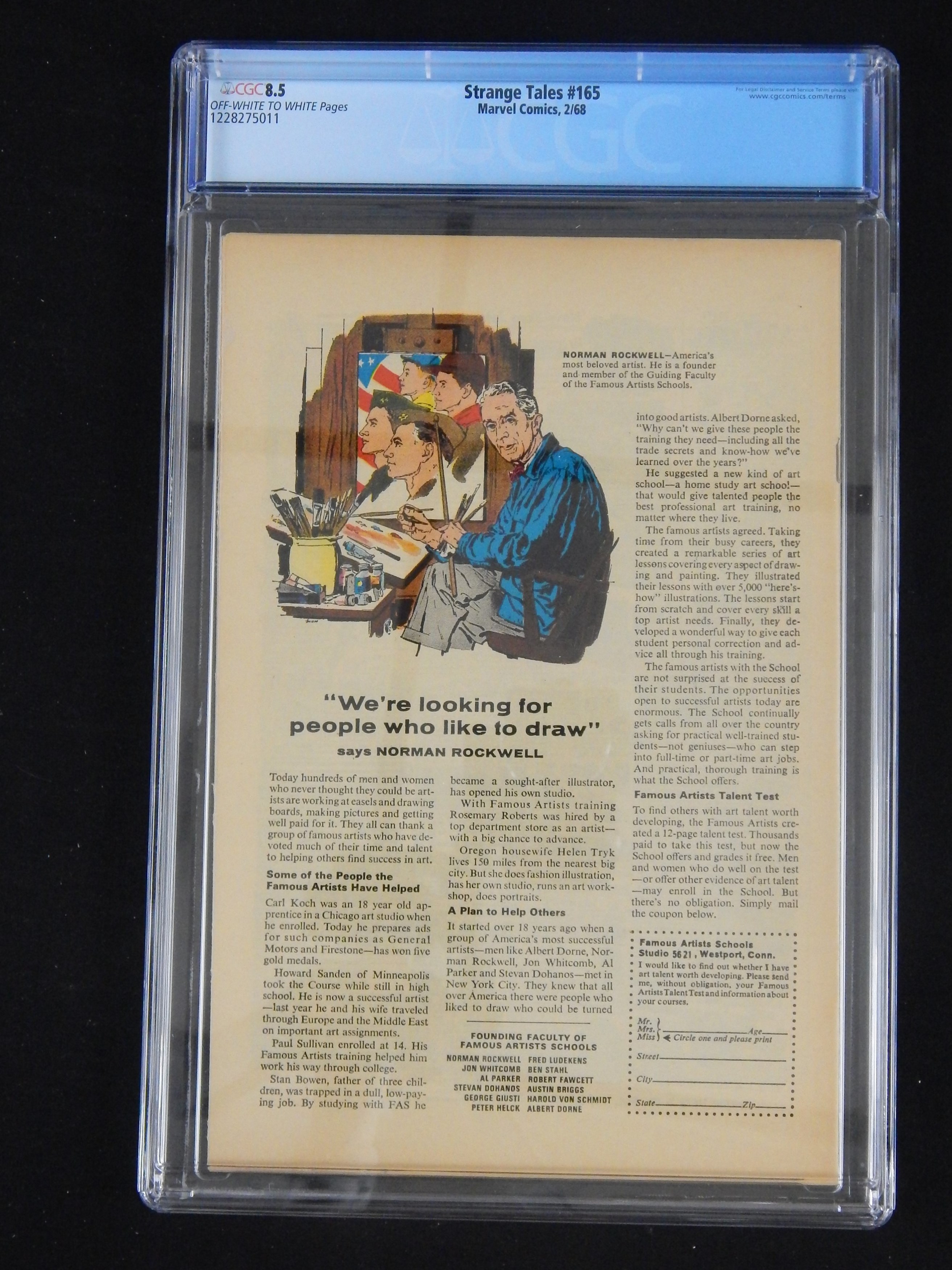 Superlative work by the great Jim Steranko: Strange Tales 156 CGC 8.0, Strange Tales 157 CGC 7.0, Strange Tales 160 CGC 8.5, Strange Tales 161 CGC 8.0, Strange Tales 163 CGC 8.5, Strange Tales 165 CGC 8.5.