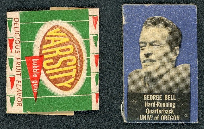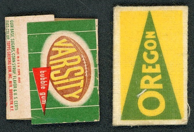Offered is a very nice conditioned "pack" of the 1950 Topps Felt Back issue, with card included. While the pack appears opened, the "Varsity Brand" gum wrapper is extremely nice and the card of George Bell/Oregon pennant is high grade.
