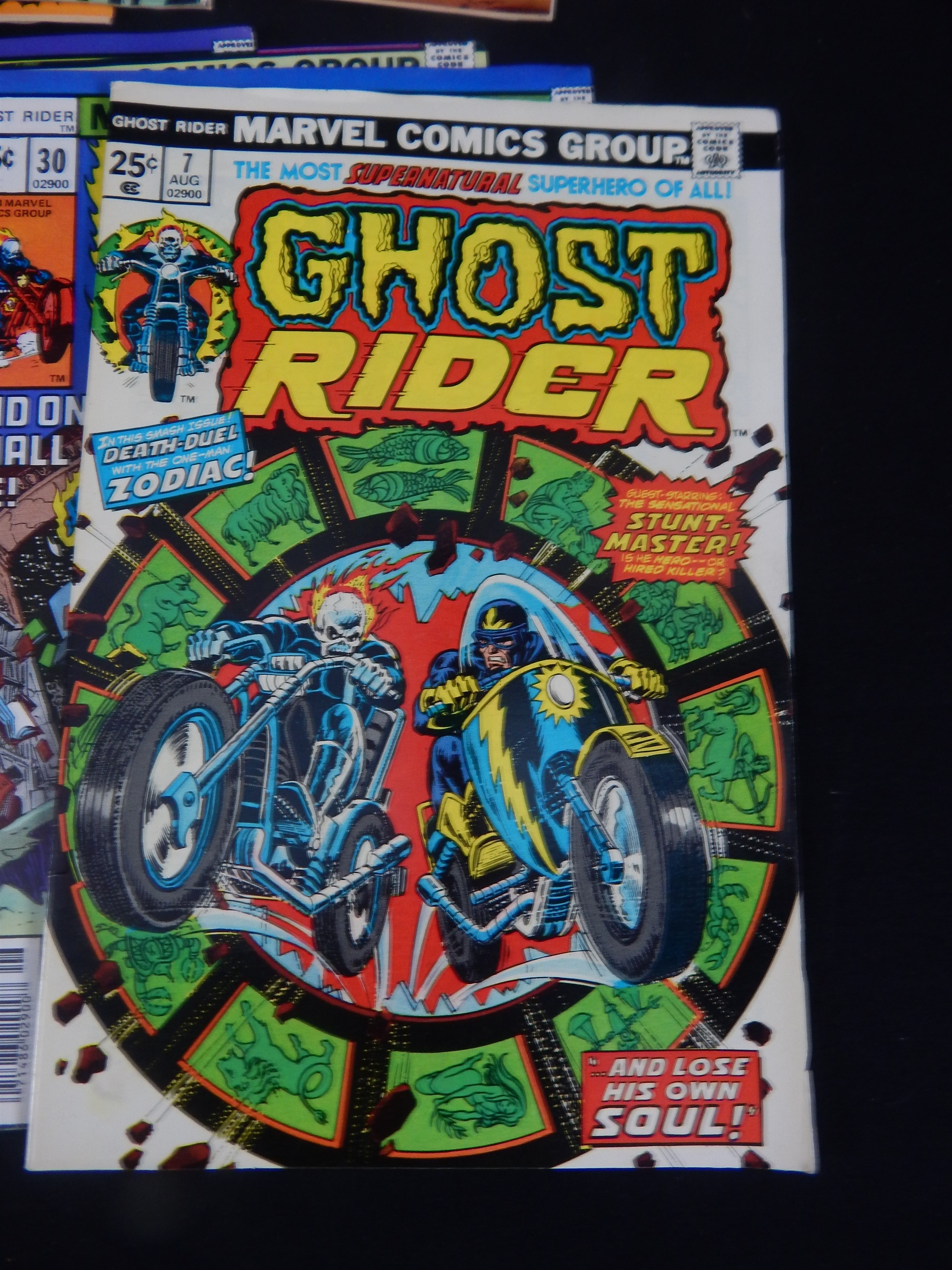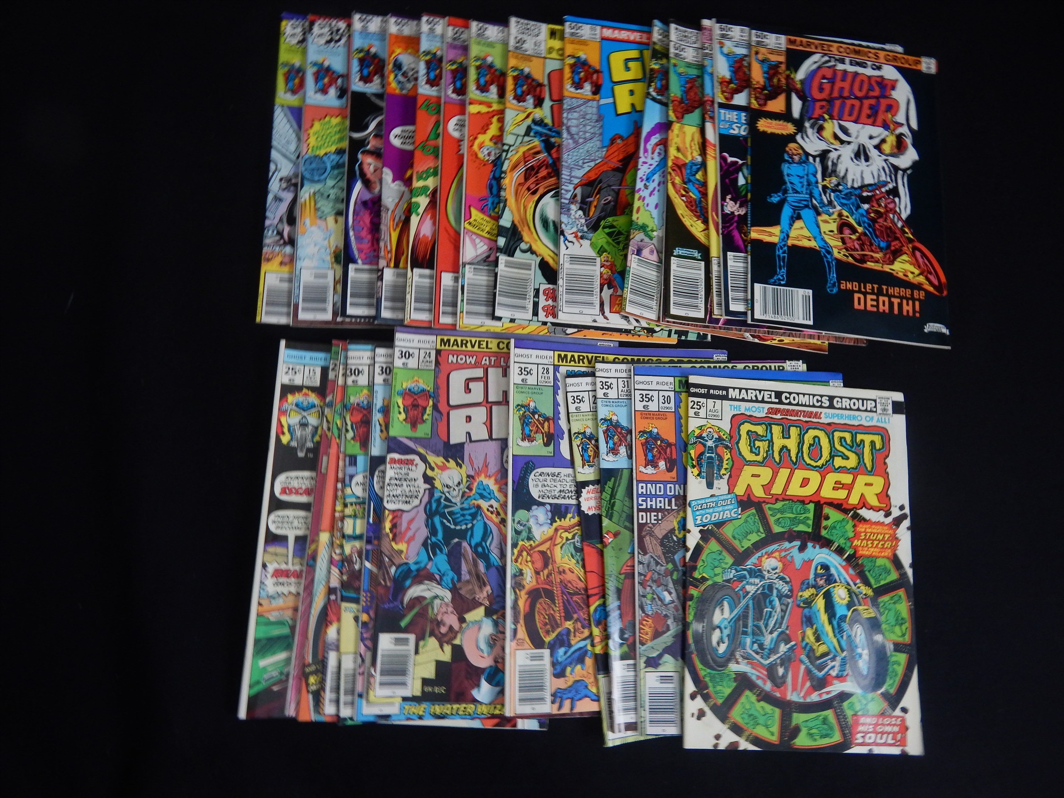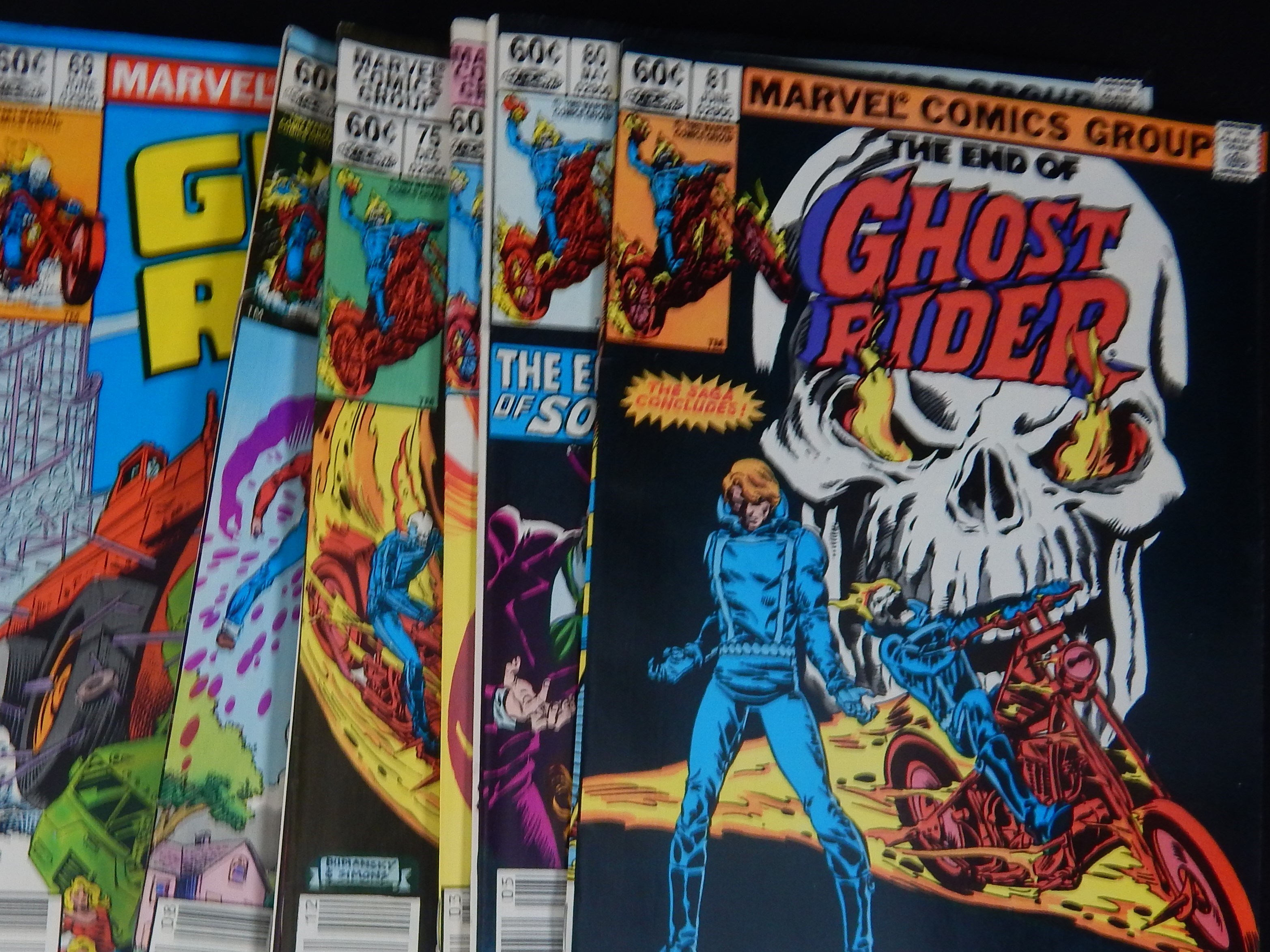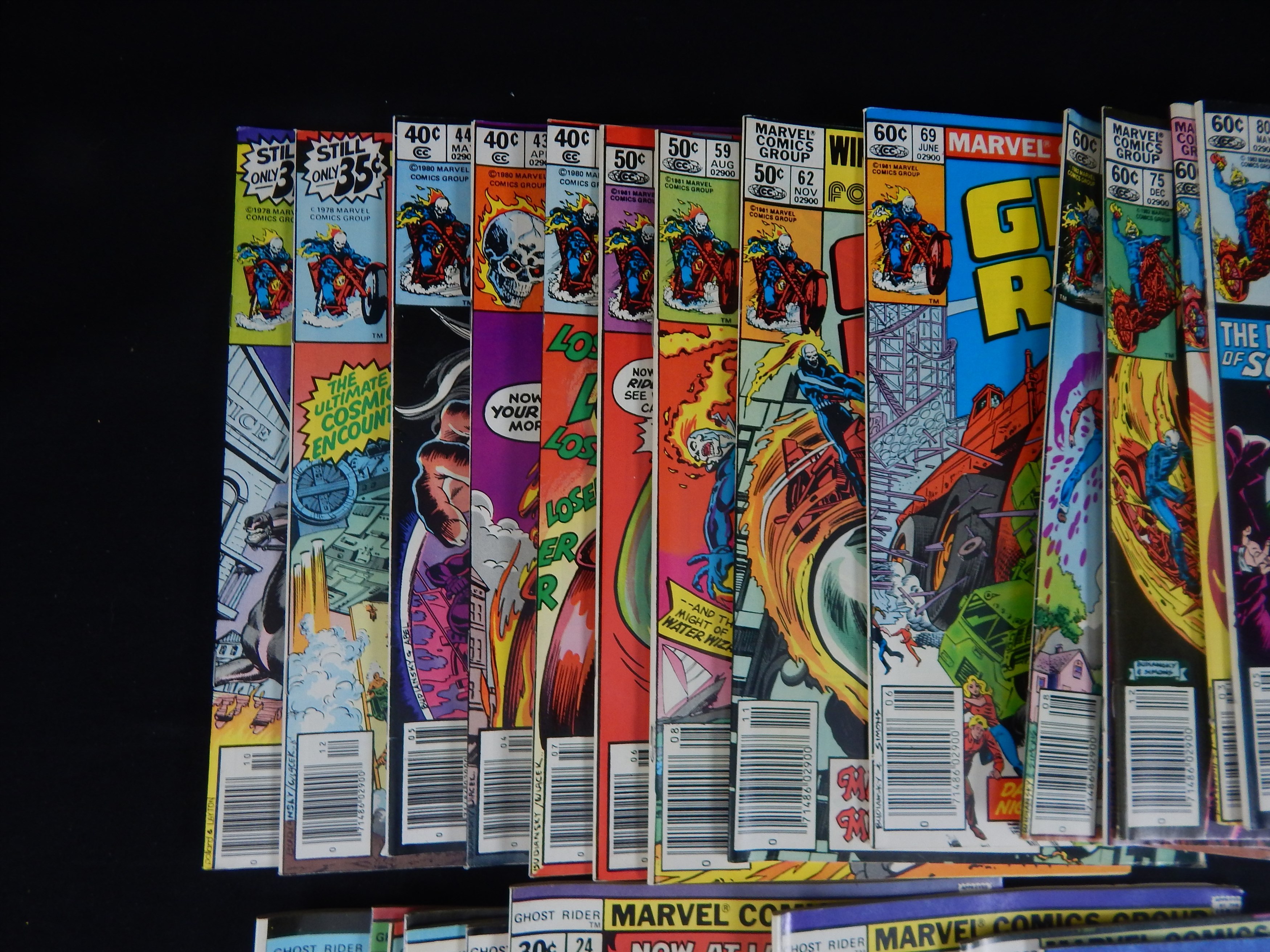 GHOST RIDER: #5, 6, 7 FN, 9, 10, 12-16, 18, 19, 21-24, 28-33, 39, 40, 43, 44, 46, 51, 57-59, 62, 65, 66, 69, 71, 73, 75, 78, 80, 81, 91. Overall VF-NM with many 9.0 or better. MARVEL TEAM-UP: #15 (Ghost Rider).
