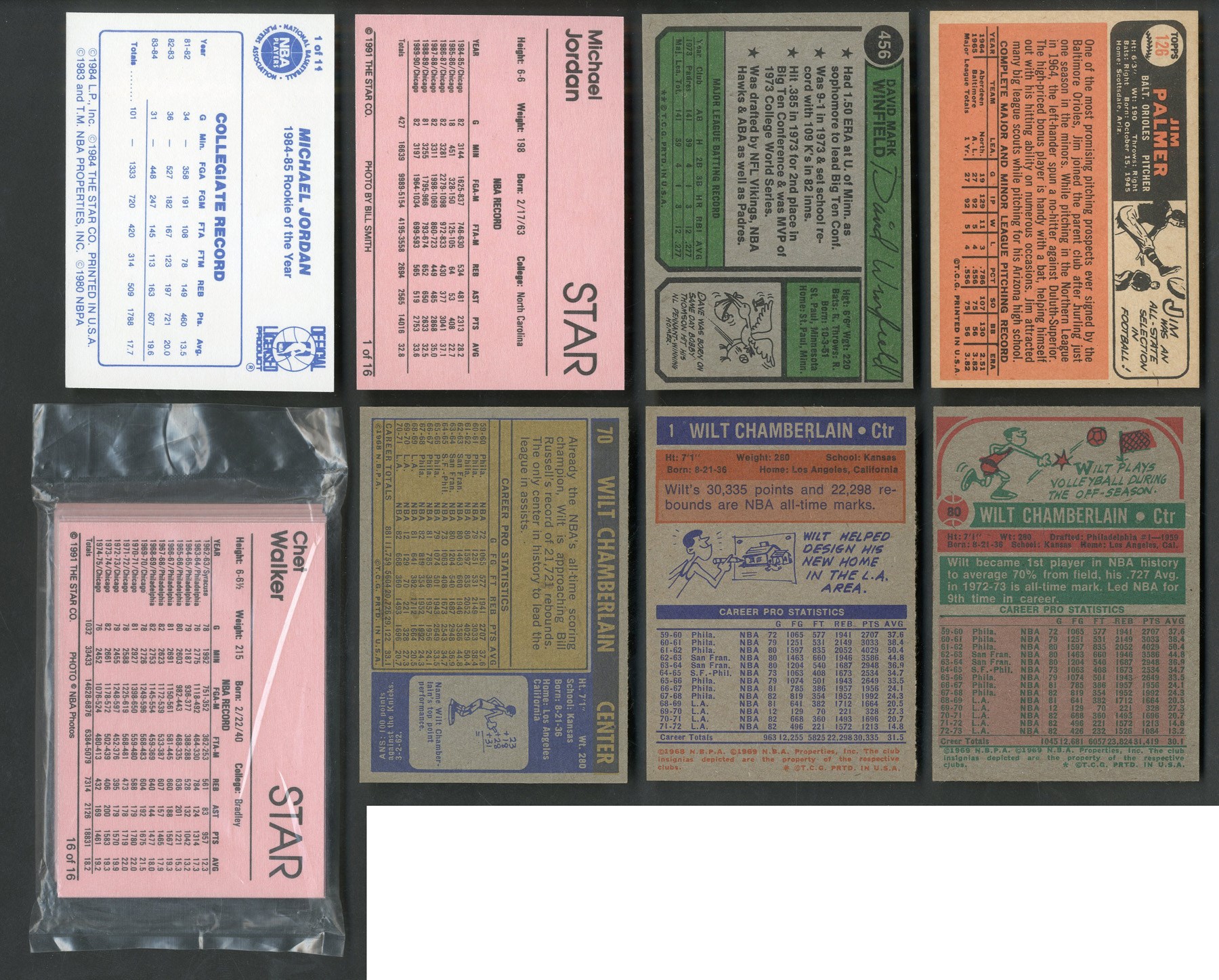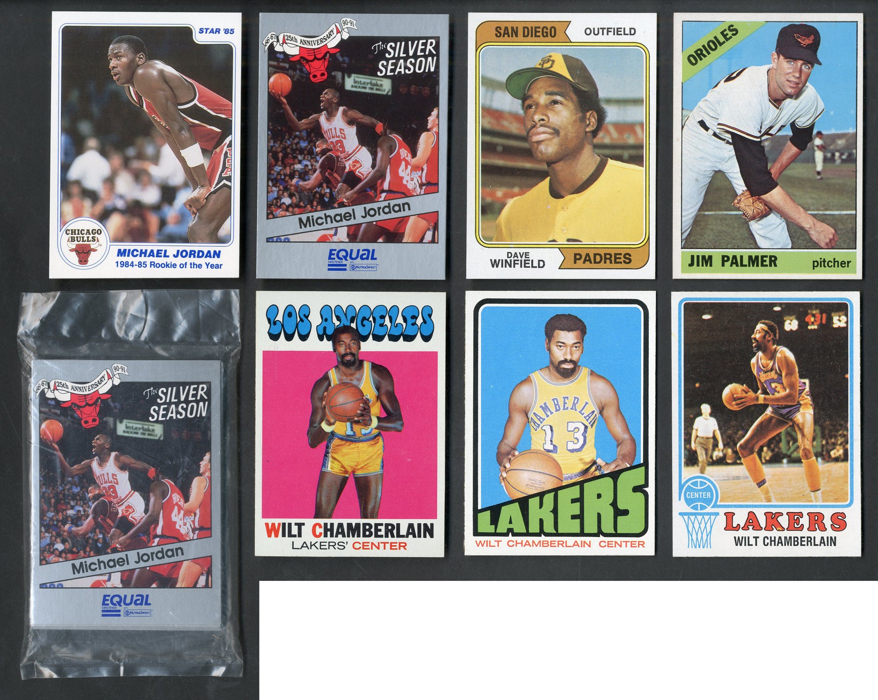 1985 Star Michael Jordan #1 of 11 (miscut, otherwise NM-MT), 1966 Topps Jim Palmer RC (NM+), 1971 Topps Wilt Chamberlain (NM-MT), 1973 Topps Wilt Chamberlain (NM), 1974 Topps Wilt Chamberlain (NM), 1974 Topps Dave Winfield RC (NM+), 1991 Equal Michael Jordan (NM-MT), 1991 Equal sealed pack with Michael Jordan.