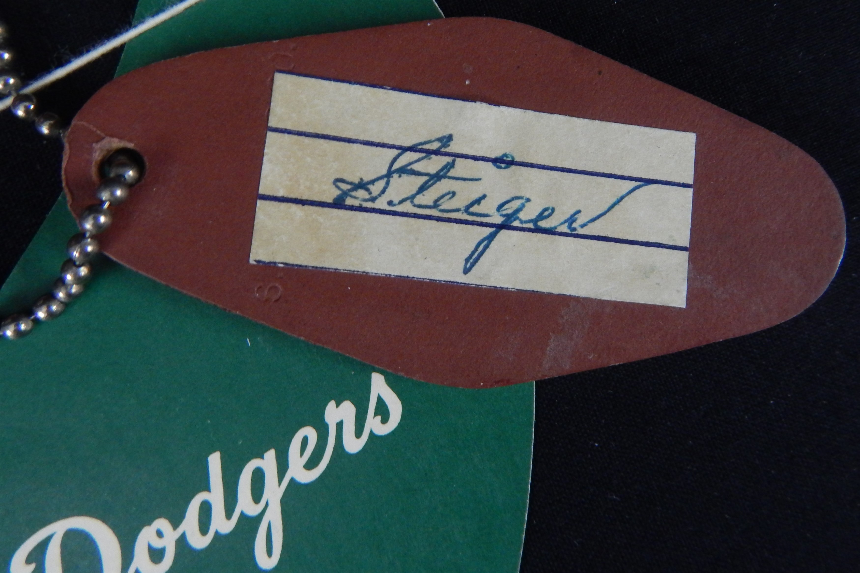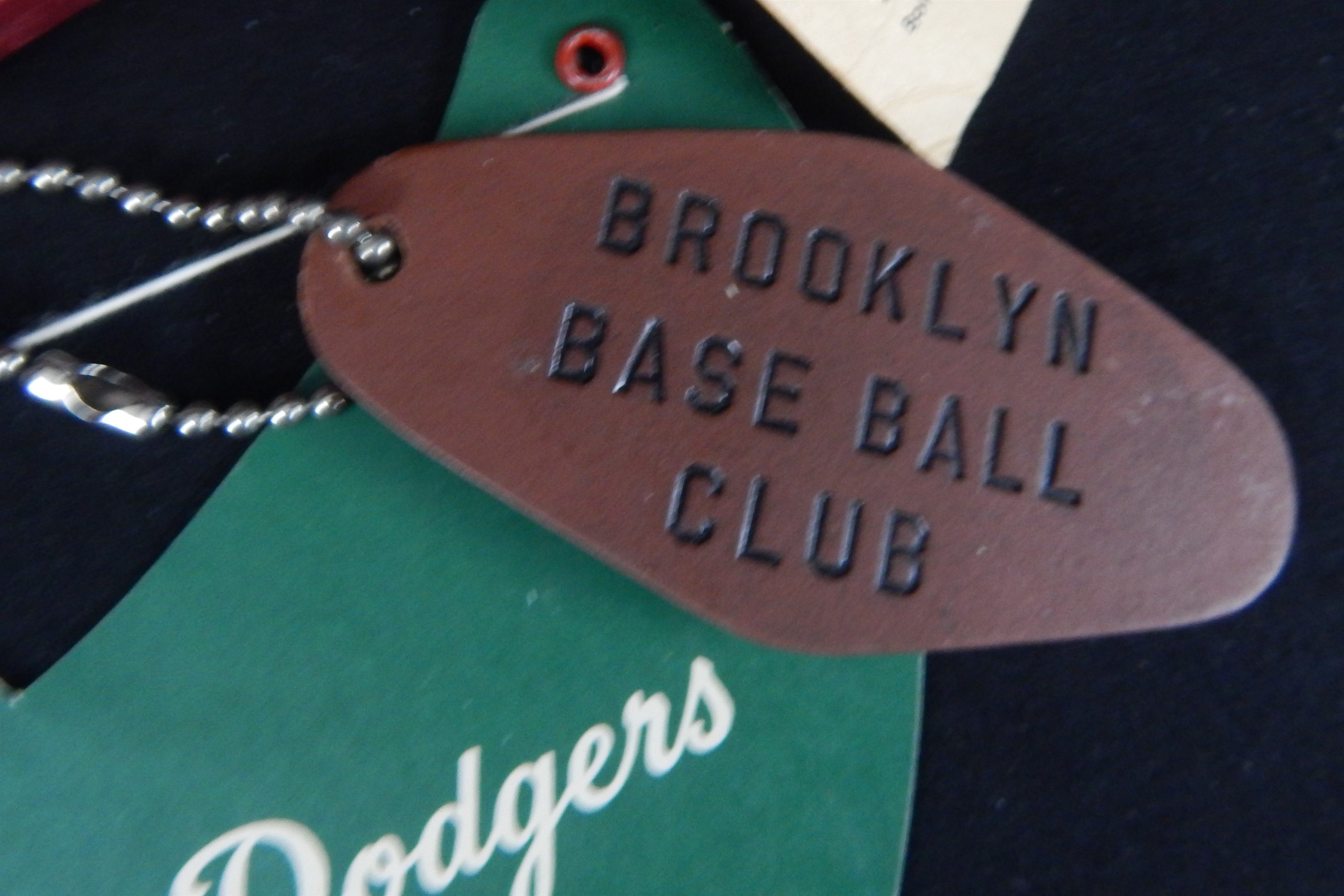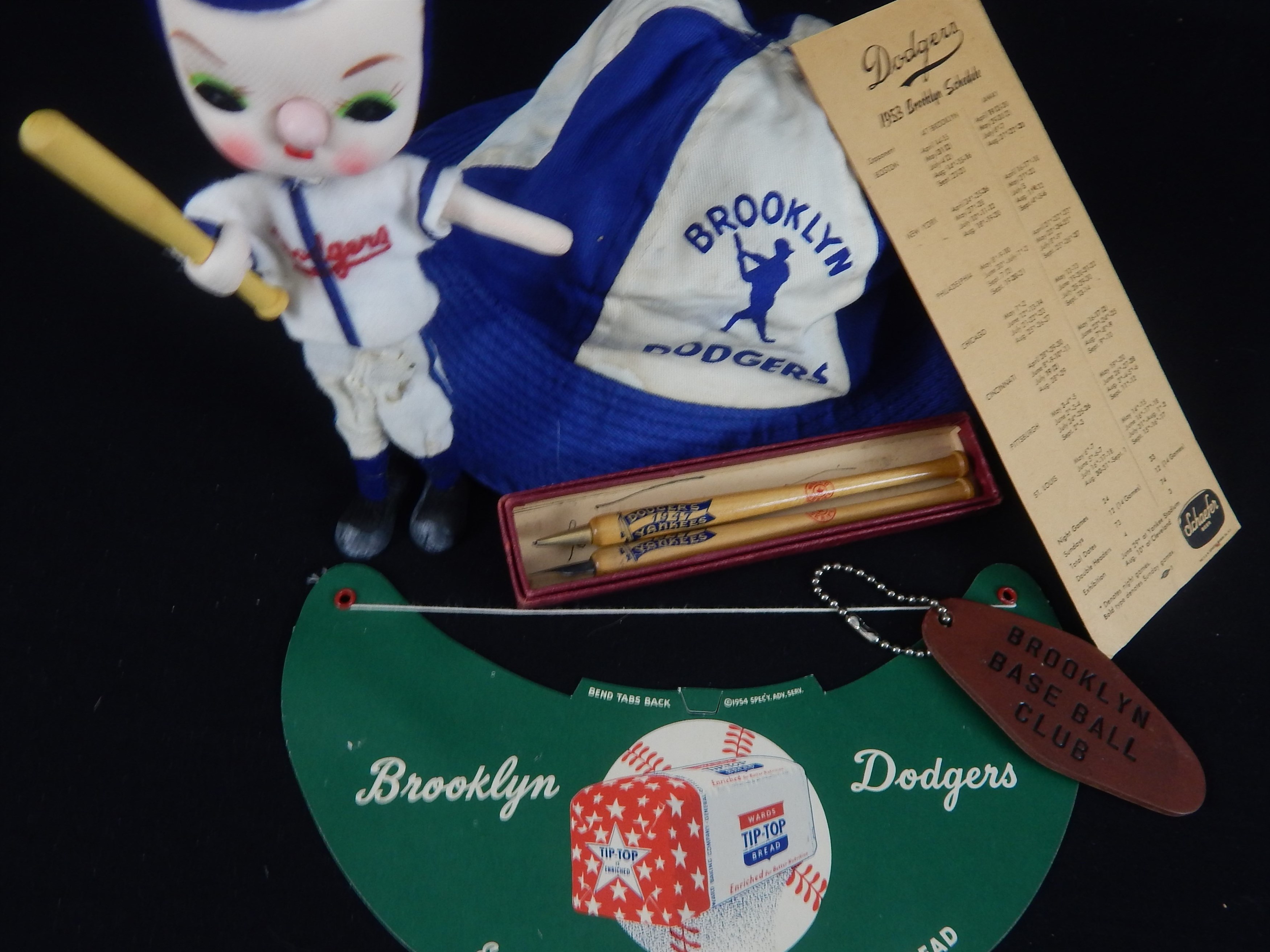 Neaty stuff here mostly from one early fan: 1) 1940s souvenir cap. 2) Dodger Dodgerette-type female fan doll (definitely Brooklyn). Bendy with some loss on pants. Wood hand-carved feet. 3) 1953 Shaeffer Beer cardboard oversized schedule. Creasing. 5) 1947 World Series pen &  pencil set in original box. Box has writing inside. 6) 1940s Tip Top Bread cardboard Premium Visor. NM. 7) BEST OF ALL: Leather "Brooklyn Baseball Club" keychain with signature of employee "Steiger" on verso. Rod?