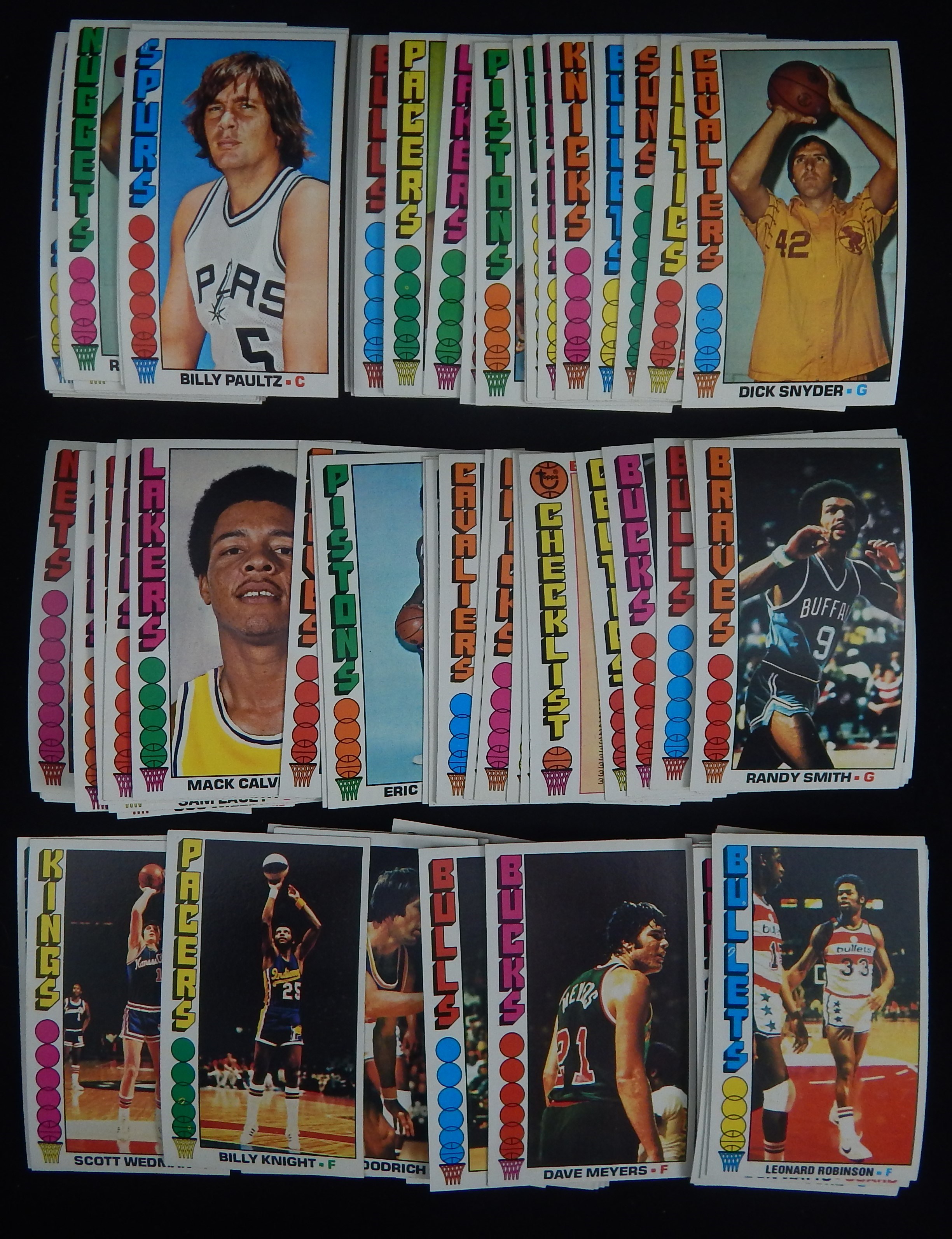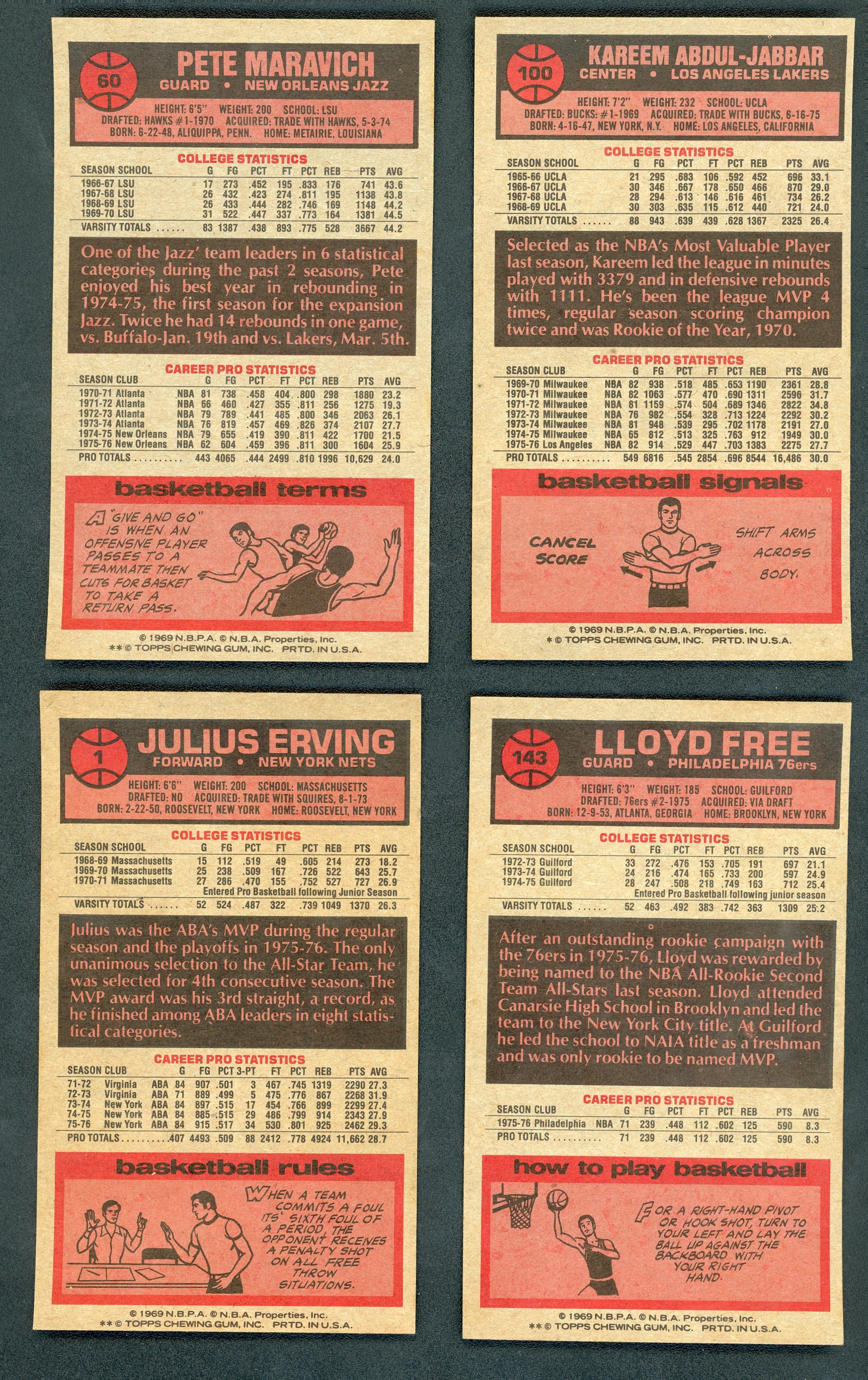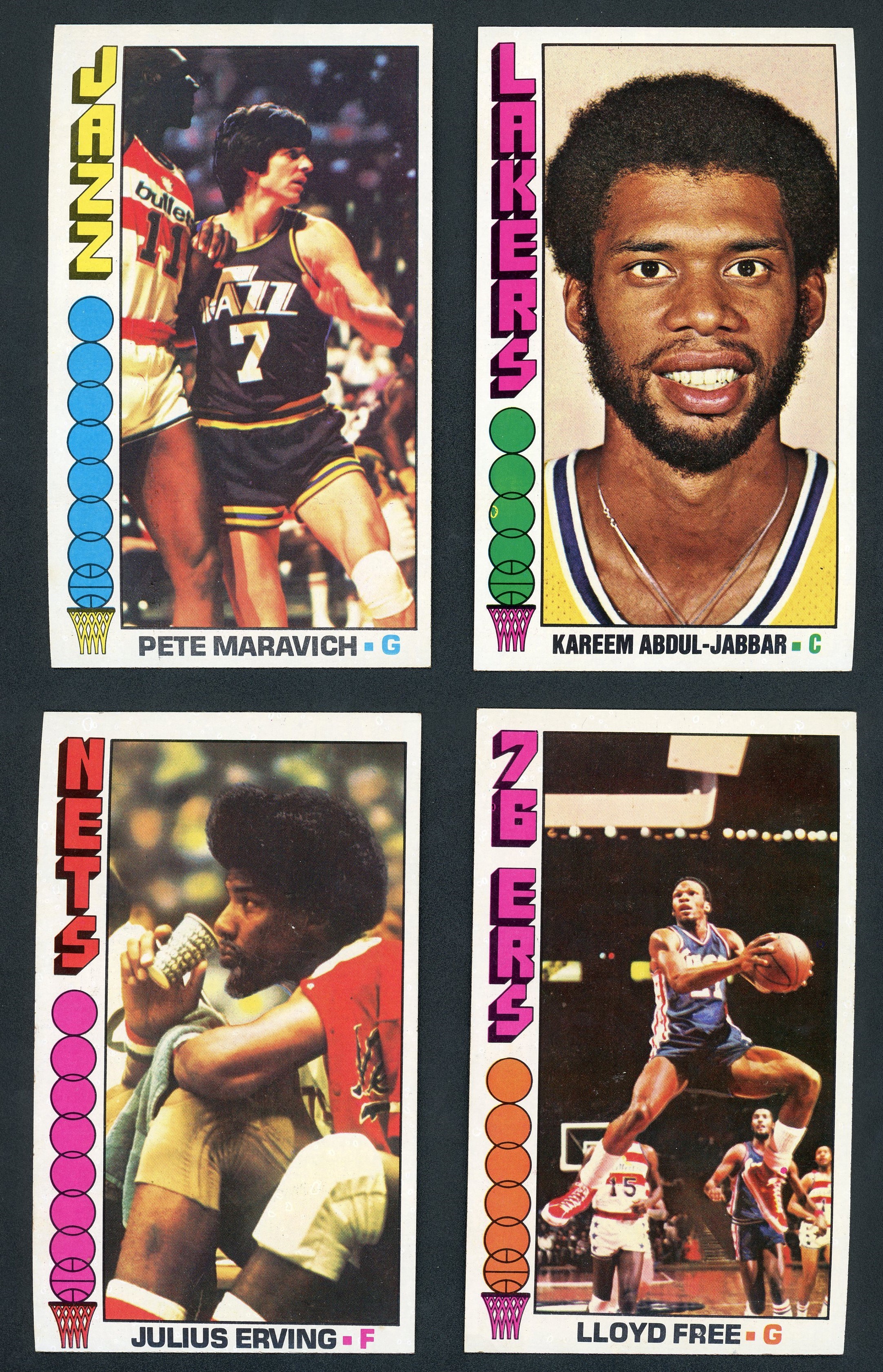 Fresh from vending complete set includes HOFers Kareem Abdul-Jabbar, Julius Erving, Pete Maravich plus the Rookie Cards of David Thompson and Lloyd. (World) B Free. Grades mostly NM to NM/MT.