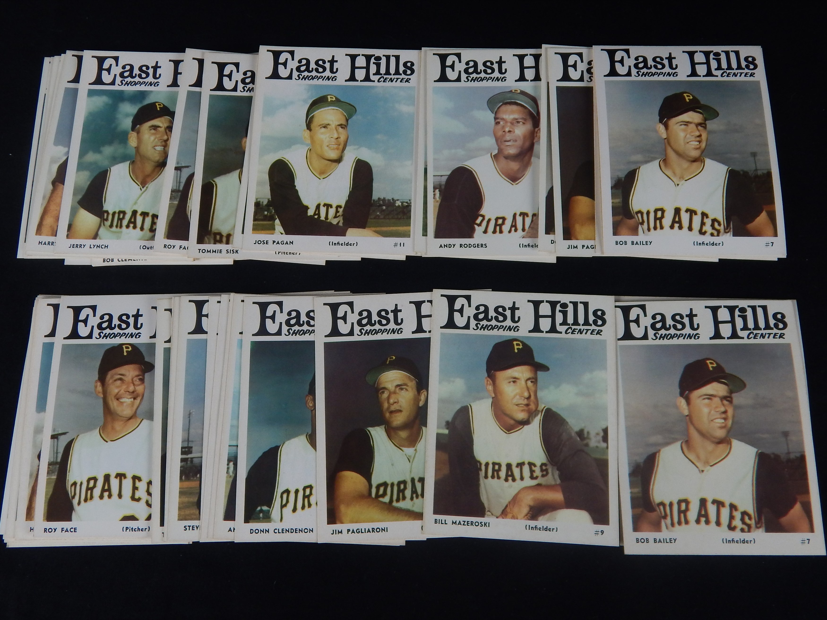 Collection of 11 complete sets from the popular 1966 East Hill Pittsburgh Pirates team sets. All sets include Roberto Clemente, Willie Stargell, Bill Mazeroski and all the other Pirates of that era. All sets are fresh and grade NM to NM/MT overall.
