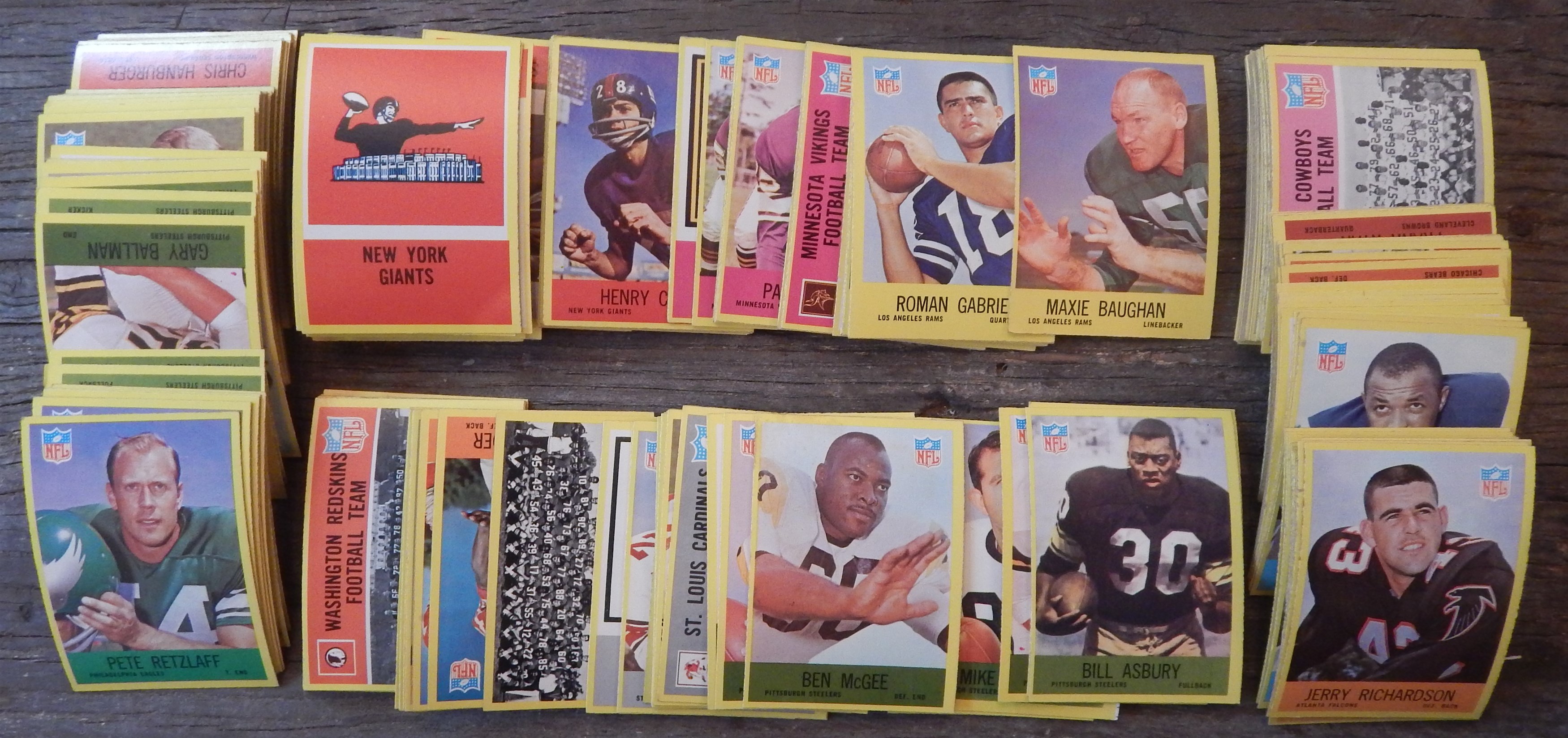 Large grouping of over 1,200+ cards from the 1967 Philadelphia football issue, the last of four sets issued by the Philadelphia Gum Co. No major stars but most other cards are here. Condition varies but ranges from VG to EX/MT, with many having light foxing and/or toning.
