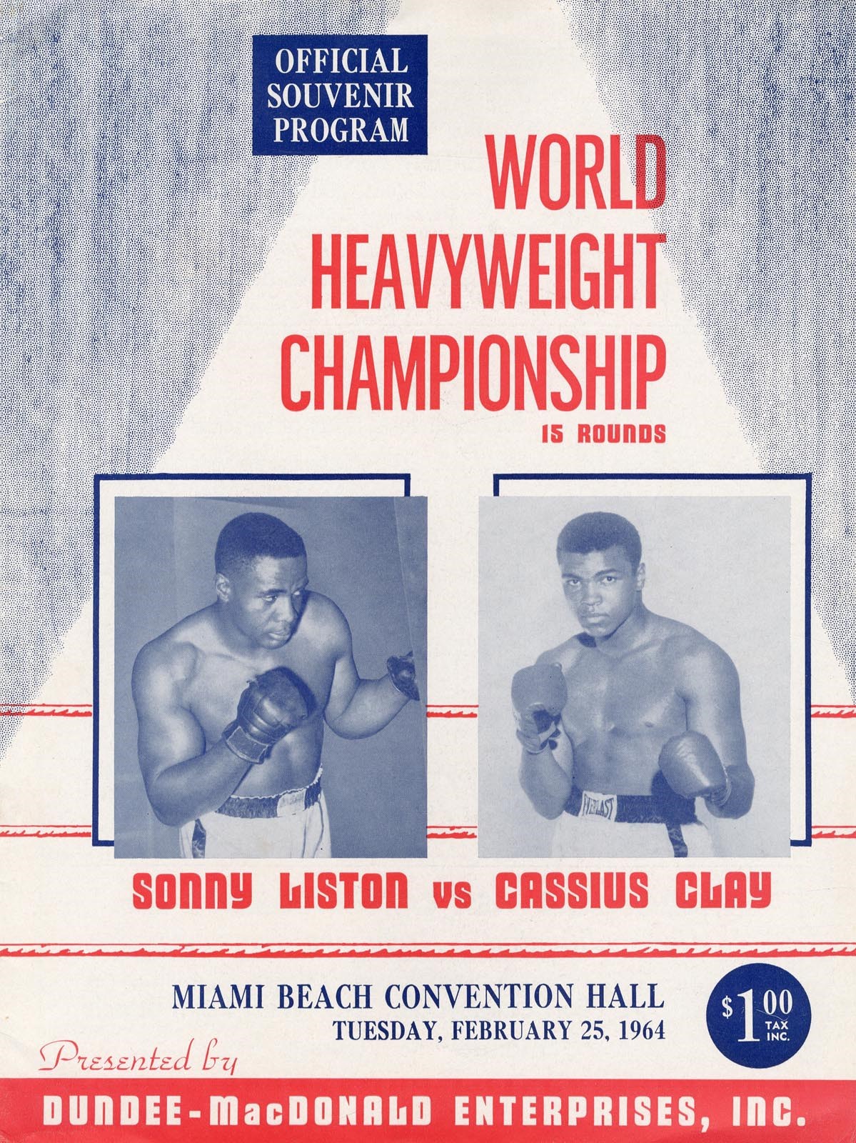 For the Heavyweight Championship of the World, 22 year-old Cassius Clay defeated Sonny Liston in this bout, held on February 25, 1964, at the Miami Beach Convention Hall. This scarce and desirable program is EX with minor corner creasing on cover. Program is not scored.