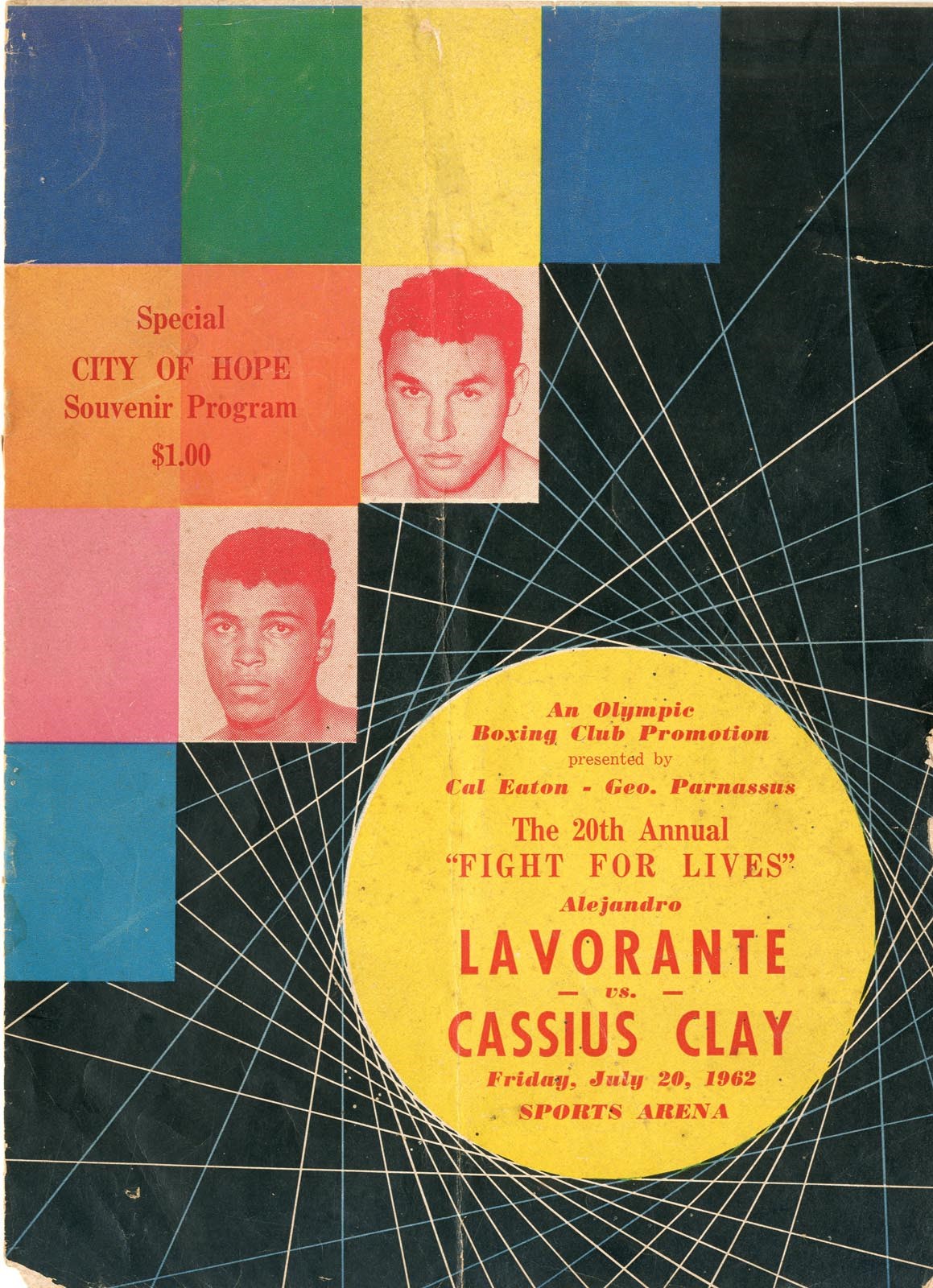 Very rare July 20th, 1962 Cassius Clay v. Alejandro Lavorante on-site fight program. Back page is detached and front cover has tear on binding but still attached. Few creases and tears to edges on cover, otherwise VG.