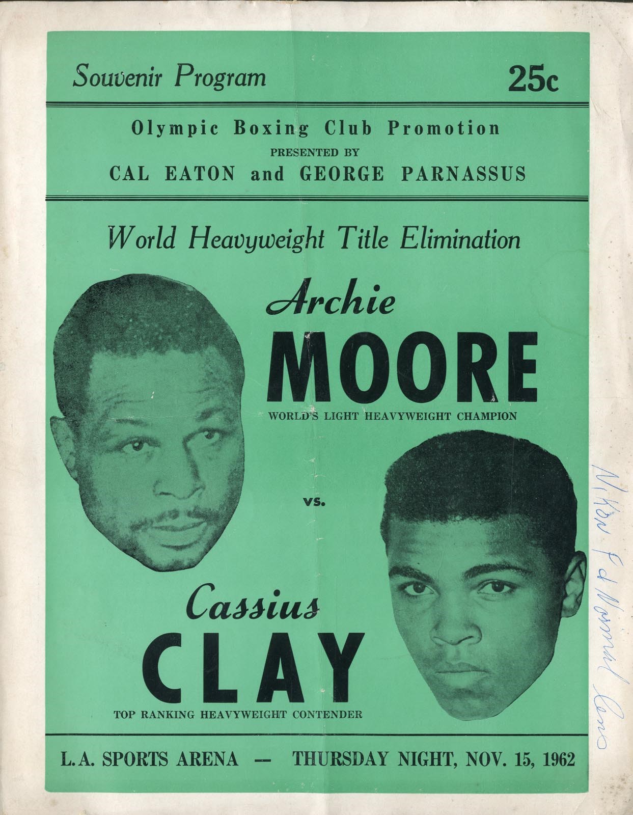 Cassius Clay fought Archie Moore on November 15, 1962, in Los Angeles, California at the Los Angeles Memorial Sports Arena. Clay knocked Moore out in the 4th round. Moore had been Clay's trainer for a time, but Clay became dissatisfied and left Moore because of Moore's attempts to change his style and his insistence that Clay do dishes and help clean gym floors. In the days before the fight, Clay had rhymed that "Archie Moore...Must fall in four." Moore replied that he had perfected a new punch for the match: The Lip-Buttoner. Nonetheless, as Clay predicted Moore was beaten by a knockout in four rounds. Offered here is a very rare original, official program for this fight. 4 pages complete. Has unknown writing on cover in pen, vertical fold and minor creasing to top right corner of cover. Unscored.