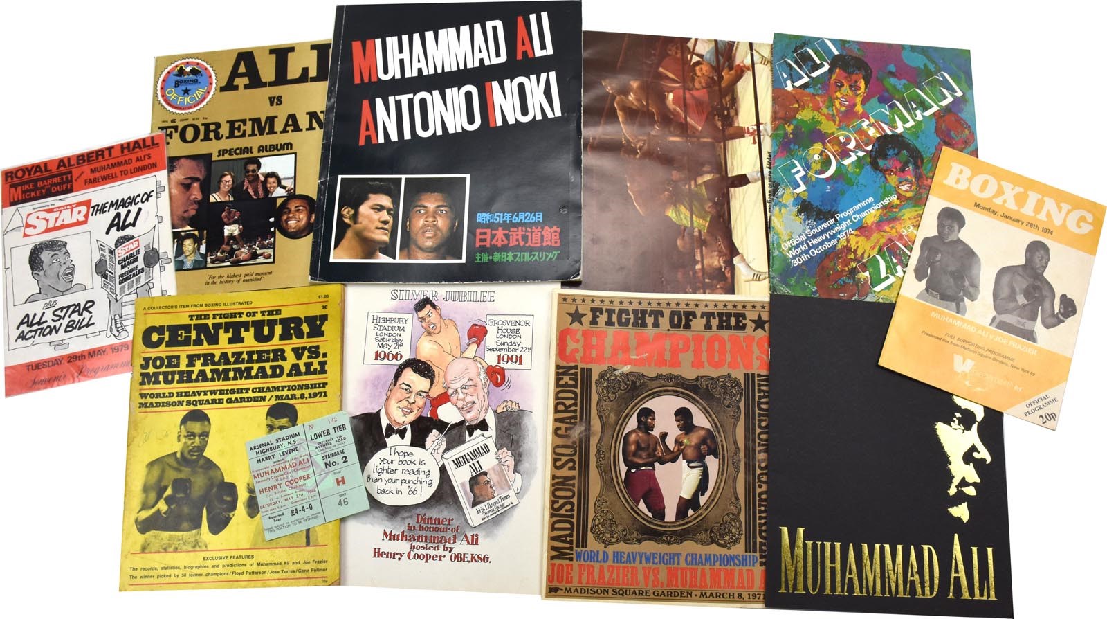 1992 50th Birthday dinner program, 1963 Ali v. Cooper II on-site program, 1966 Ali v. Cooper II ticket, 1979 London exhibition program, 1974 Thrilla in Manila closed circuit program, 1974 Ali v. Frazier II closed circuit program, 1971 Ali v. Frazier I publication, 1971 Ali vs. Frazier I closed circuit program, 1991 dinner program, Ali vs. Foreman special album publication, 1974 Ali vs. Frazier II program, 1976 Ali vs. Inoki program. Overall EX.