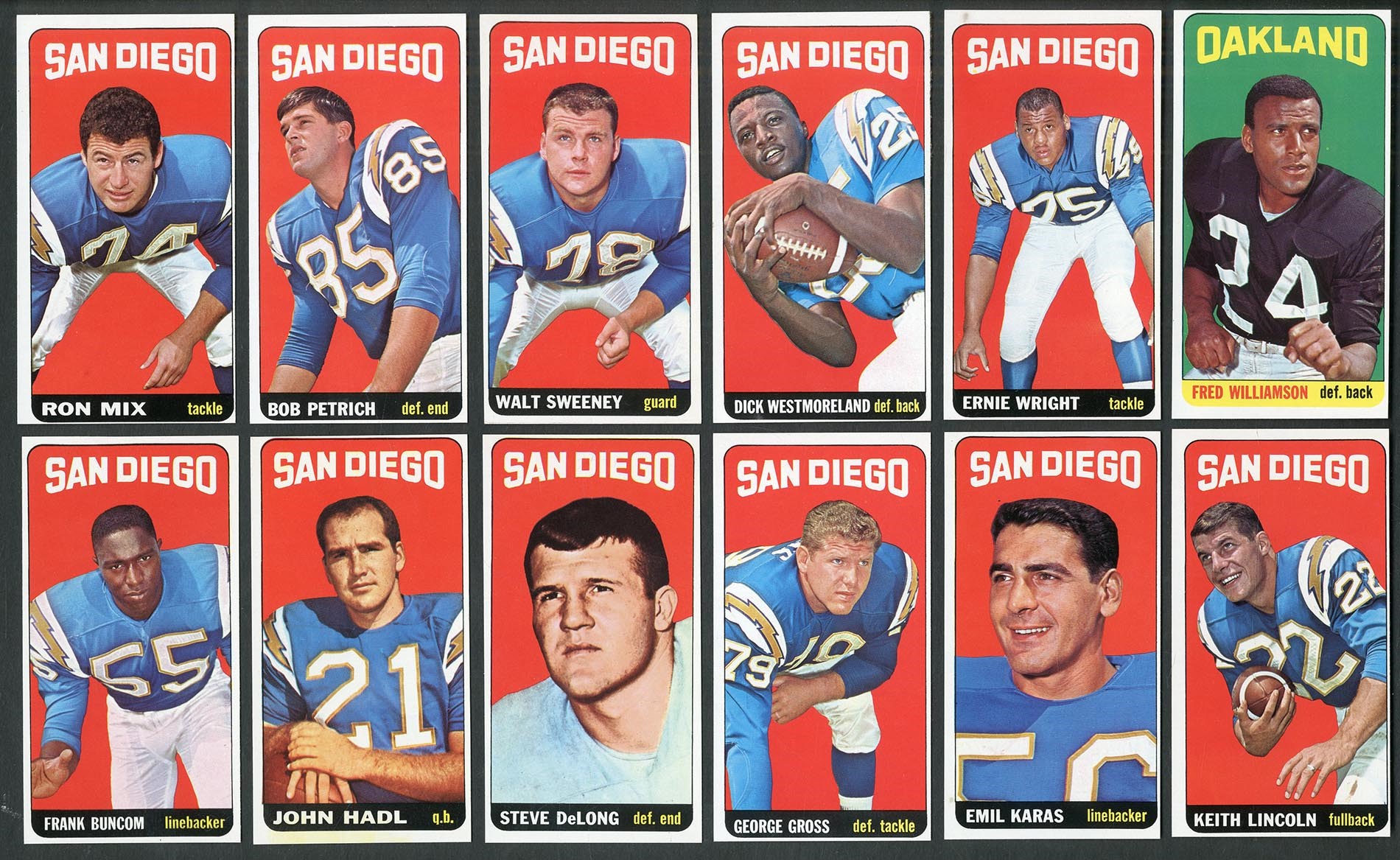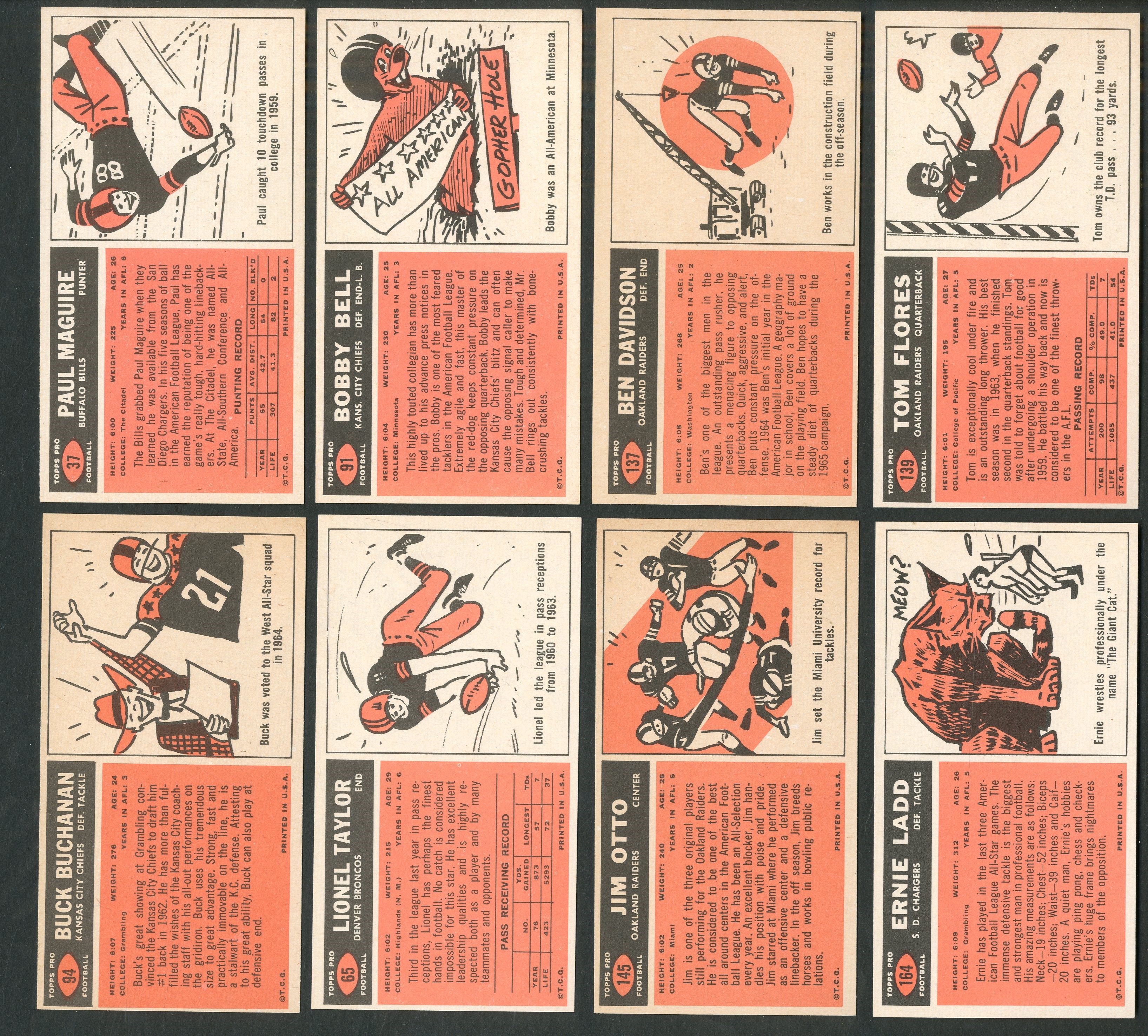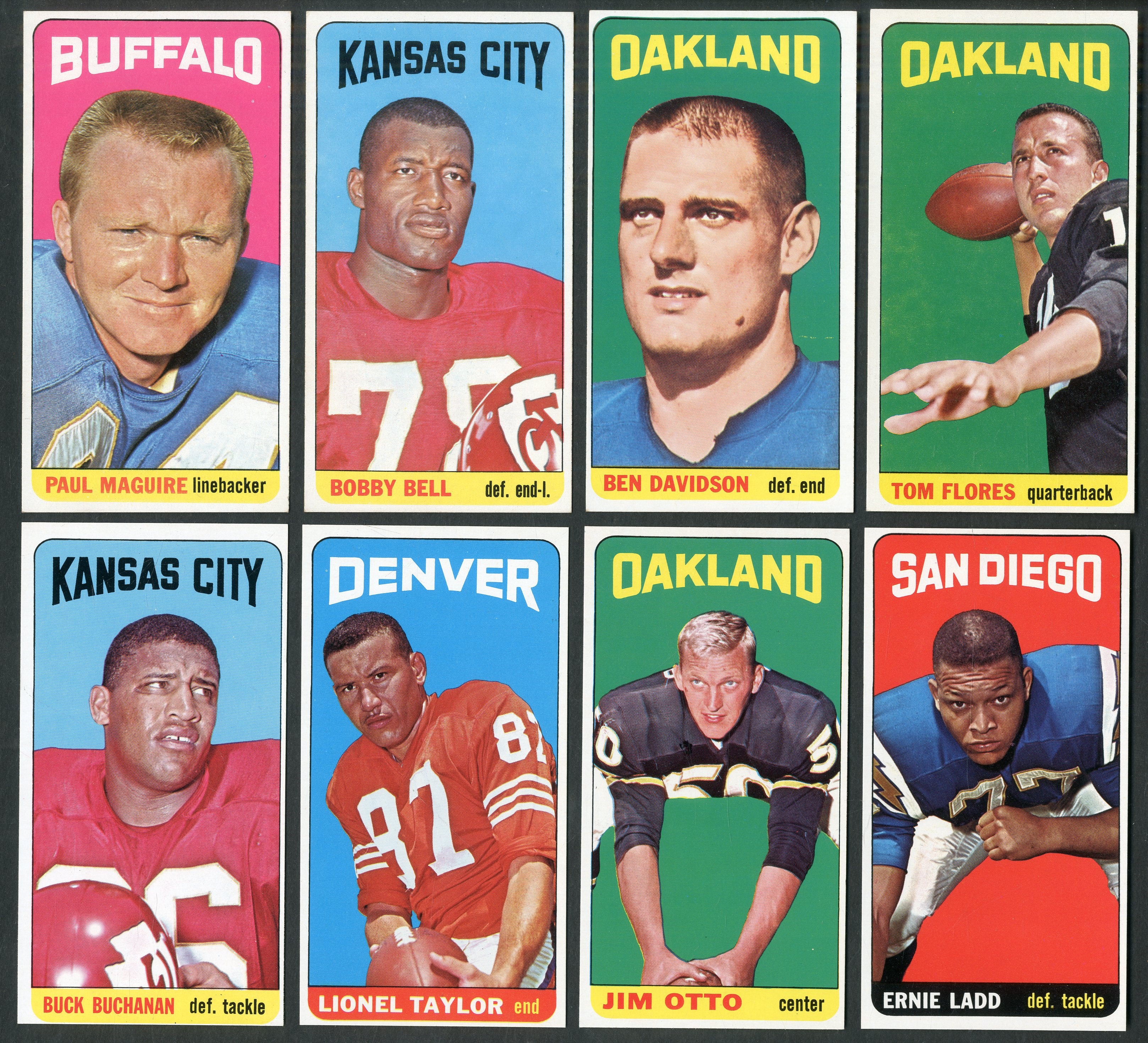 This is a fresh to the hobby near-set of tall boy 1965 Topps football issue, with 167/176 cards, missing #35 Kemp, 67 Blanda, 87 Checklist, 99 Dawson, 121 Maynard, 122 Namath, 133 Biletnikoff, 155 Alworth and 176 Checklist. Includes: #1 Addison (VG), 3 Buoniconti (EX/MT), 65 Taylor (NM), 91 Bell (EX/MT), 94 Buchanan RC (EX), 137 Davidson RC (EX/MT), 139 Flores (NM) and 145 Otto (NM/MT). Grades 20% NM/MT, 20% NM, 45% EX/MT, 15% EX - a few lesser, most with sharp corners, but with the usual centering issues for this set.