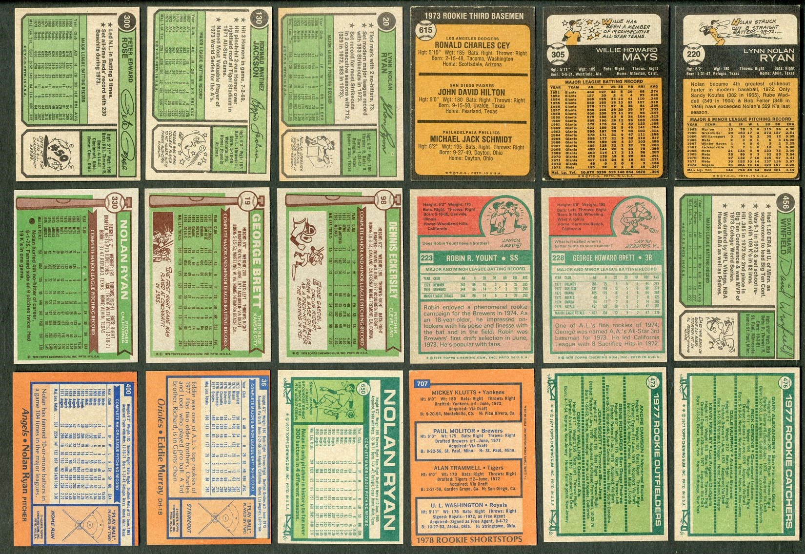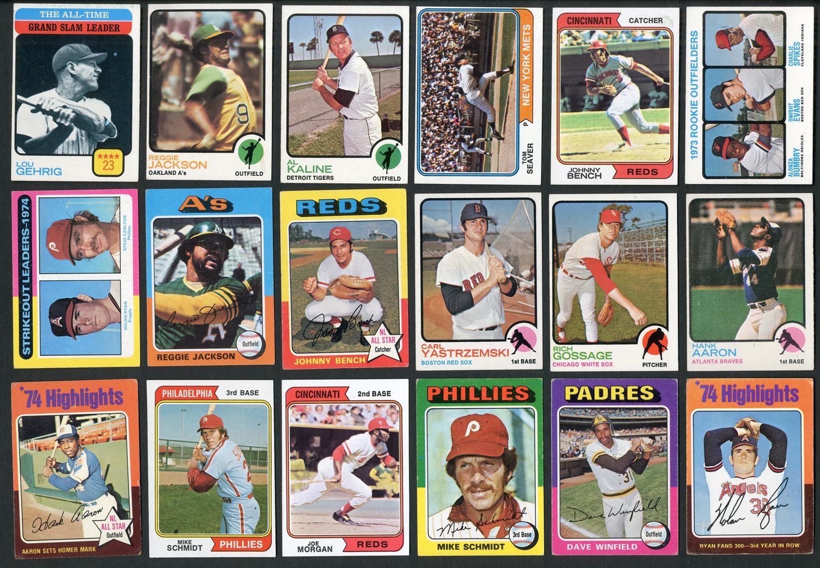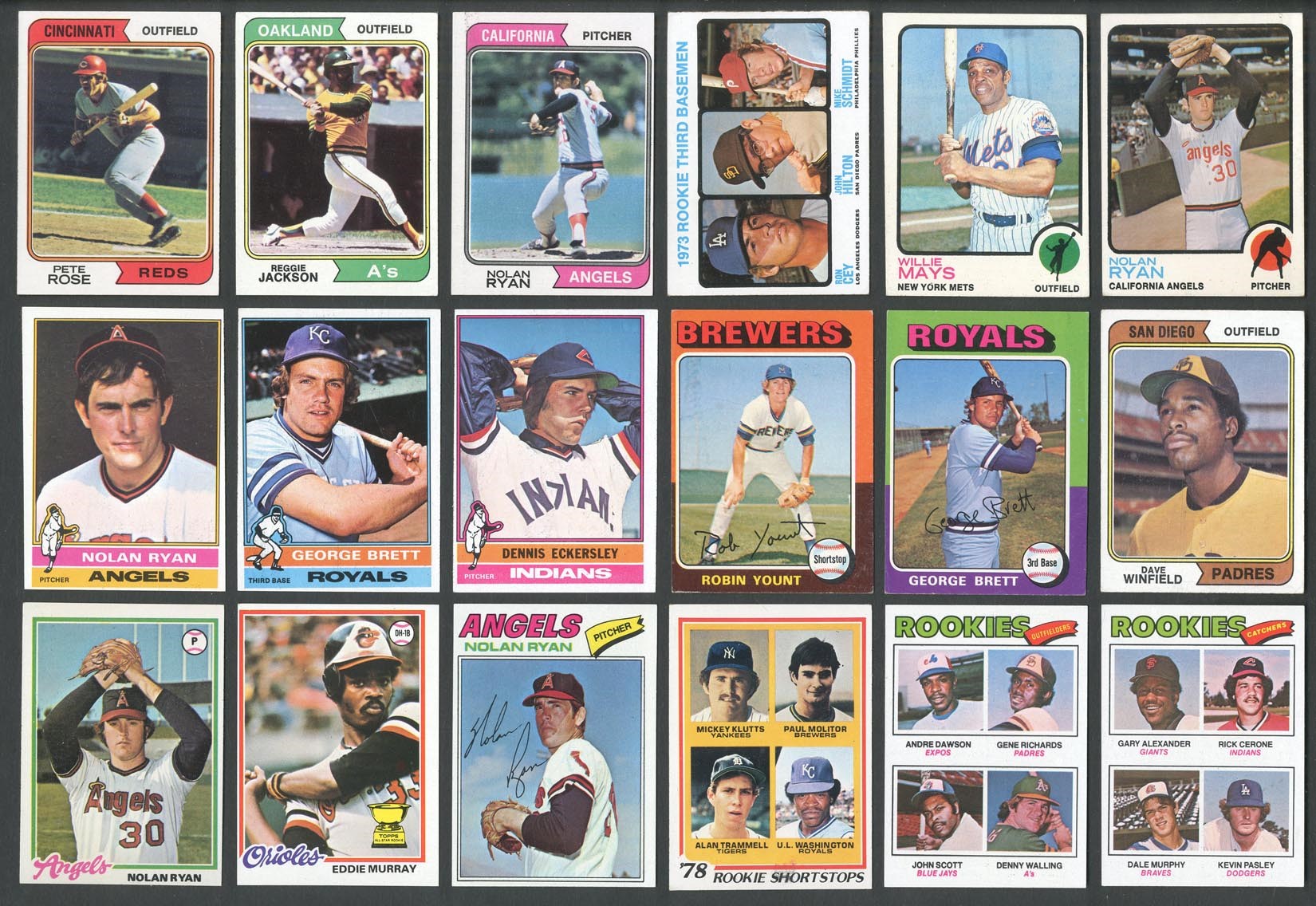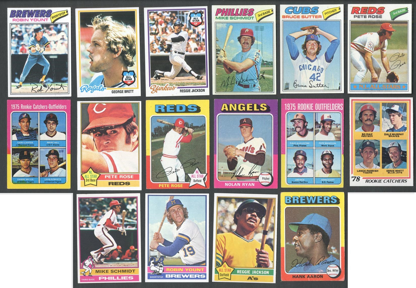 Original collection of complete and near-complete sets, with a high grade 1976 example. Includes: 1973 - near-set of (655/660 cards - missing #1, 50 Clemente, 473 Aaron ATL, 474 Ruth ATL & 588 CL) w/#100 Aaron (EX/MT), 130 Rose (EX), 174 Gossage RC (EX/MT), 220 Ryan (EX/MT), 245 Yastrzemski (NM), 255 Jackson (EX), 280 Kaline (EX/MT), 305 Mays (EX), 472 Gehrig (EX), 614 Evans RC (EX/MT) and 615 Schmidt RC (VG/EX). Grades mostly EX to NM, some lesser. 1974 - near-set of (653/660 cards - missing #1-6 Aarons & 215 Kaline) w/#s 10 Bench (EX/MT), 20 Ryan (EX), 80 Seaver (EX), 85 Morgan (NM), 130 Jackson (EX), 283 Schmidt (EX/MT), 300 Rose (NM) and 456 Winfield RC (EX). Grades mostly EX to NM. 1975 - complete set of 660 cards w/#s 1 Aaron HL (VG), 5 Ryan HL (VG), 61 Winfield (VG/EX), 70 Schmidt (VG/EX), 223 Yount RC (VG/EX), 228 Brett RC (VG), 260 Bench (VG/EX), 300 Jackson (EX), 312 Ryan/Carlton (EX), 320 Rose (VG/EX), 500 Ryan (VG/EX), 616 Rice RC (EX), 620 Carter RC (EX) and 660 Aaron (VG). Grades mostly VG to EX. 1976 - complete set of 660 cards w/#19 Brett (EX), 98 Eckersley RC (EX), 240 Rose (EX/MT), 316 Yount (NM), 330 Ryan (EX), 480 Schmidt (NM) and 500 Jackson (NM). Grades mostly EX/MT to NM, some lesser. 1977 – complete set of 660 cards w/#s 140 Schmidt (EX/MT), 144 Sutter RC (NM/MT), 450 Rose (NM), 473 Dawson RC (NM), 476 Murphy RC (NM), 635 Yount (EX/MT) and 650 Ryan (NM). Grades mostly EX/MT to NM, some lesser. 1978 – complete set of 726 cards w/#s 36 Murray RC (EX), 100 Brett (NM), 200 Jackson (EX/MT), 400 Ryan (EX/MT) and 707 Molitor/Trammell RC (EX). Grades mostly EX/MT to NM, some lesser.