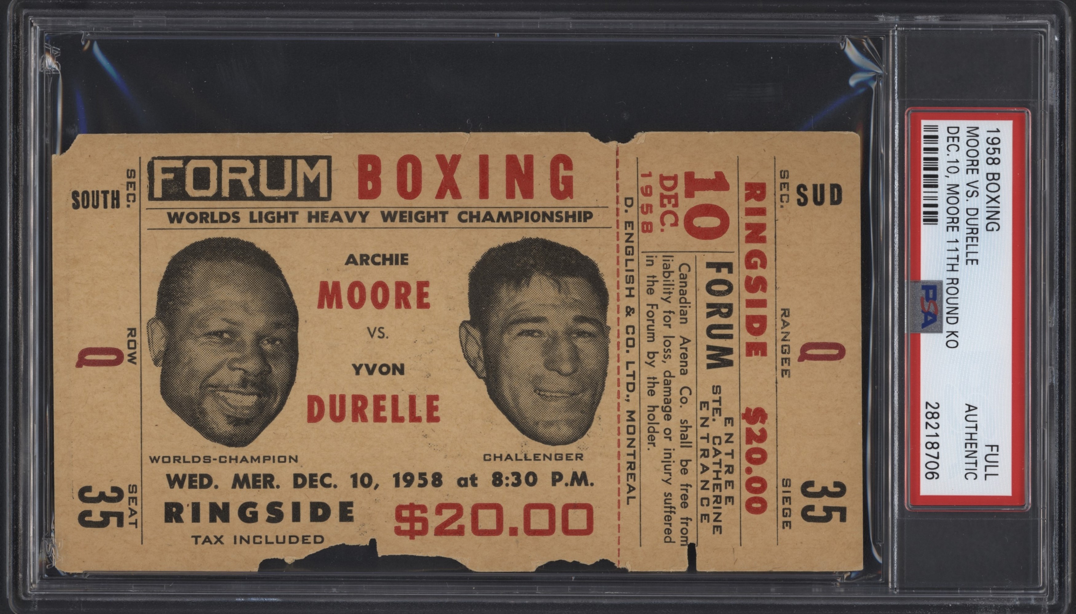 World Light Heavy Weight Championship fight of 1958 between Archie Moore and champion Yvon Durelle. Moore kept his title by way of KO in the 11th round. PSA grade A