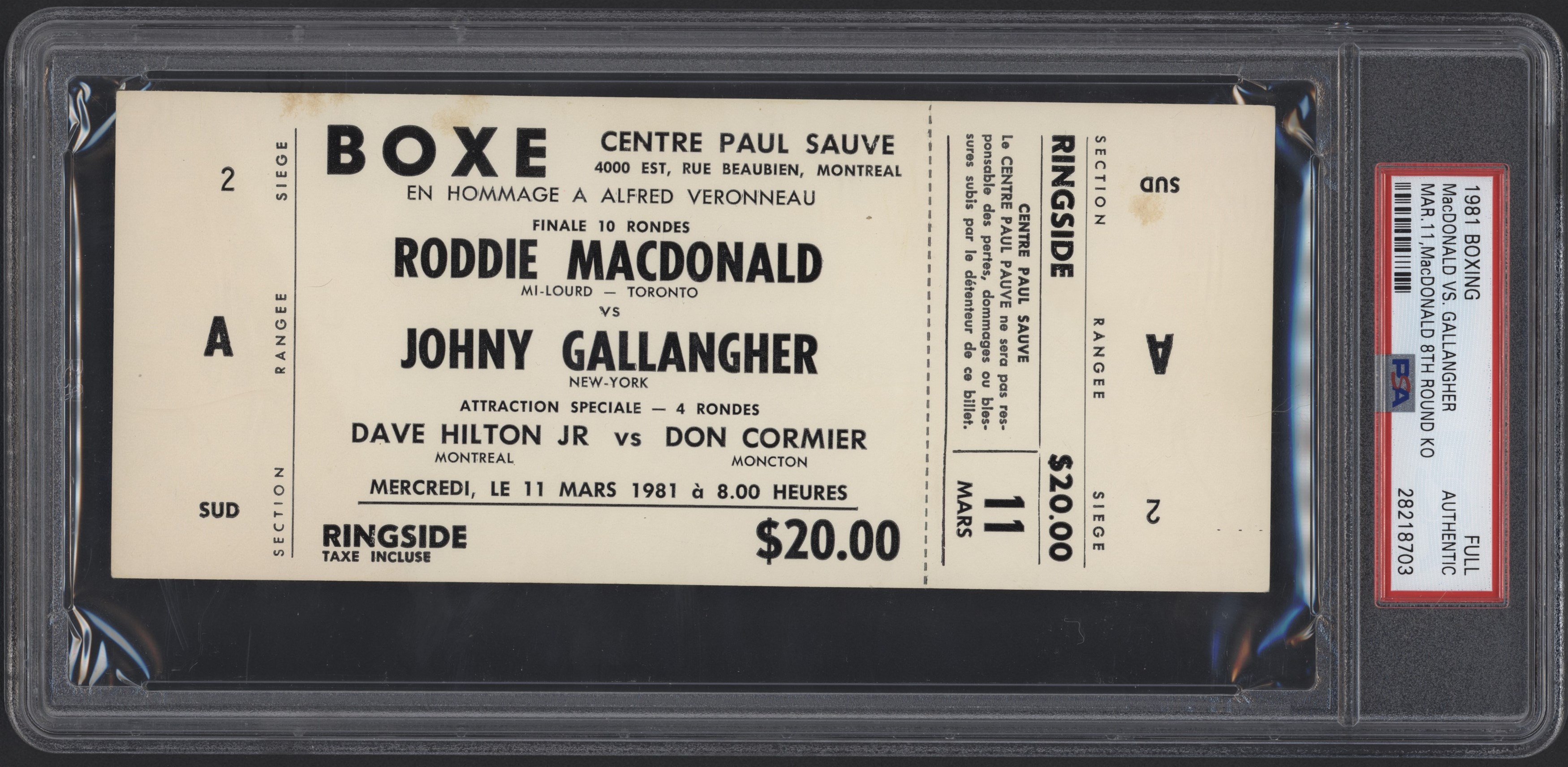 Roddy Macdonald vs. Johny Gallagher ticket from their second meeting in 1981. MacDonald won by way of KO in the 8th round. PSA grade A.