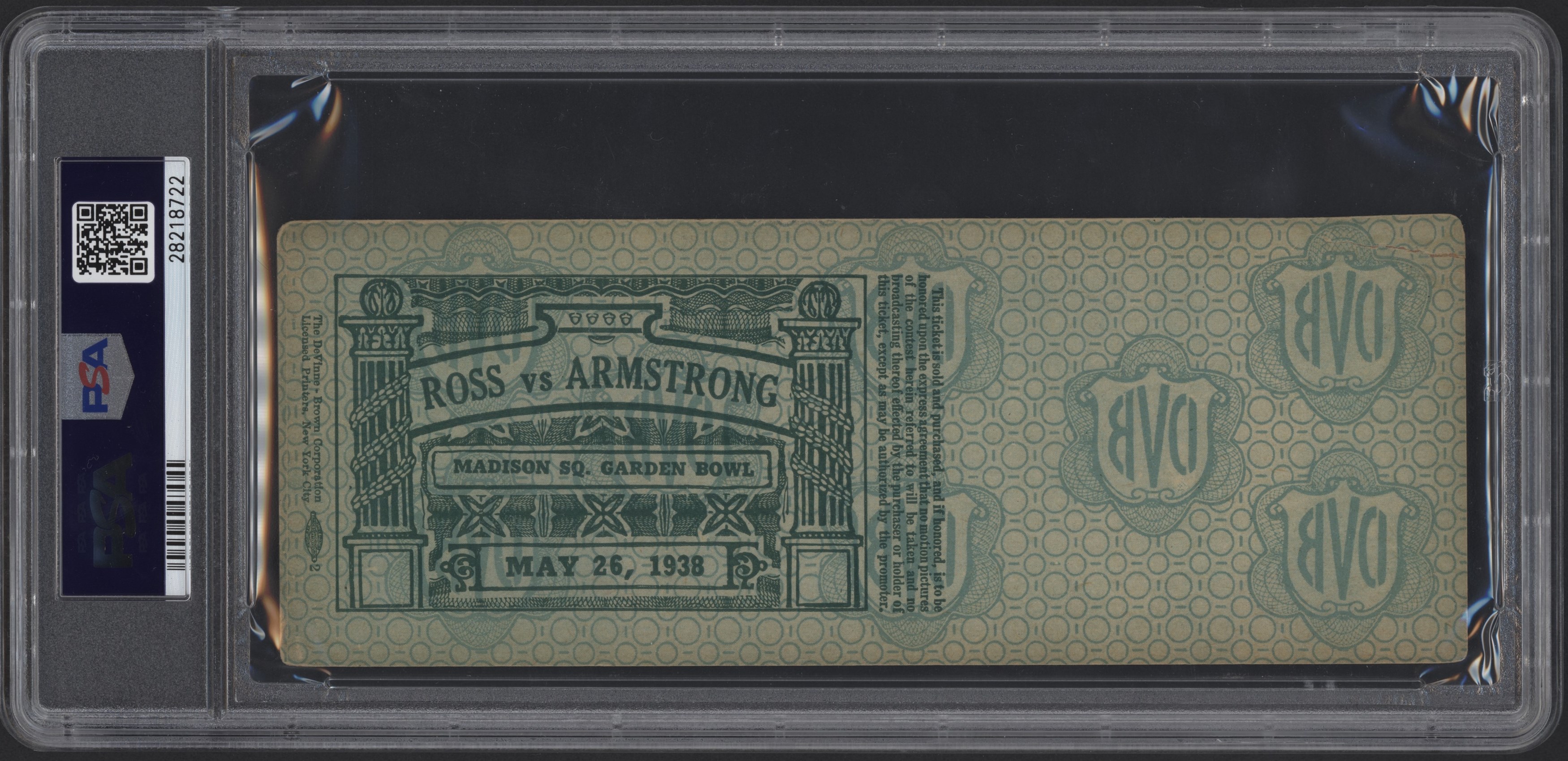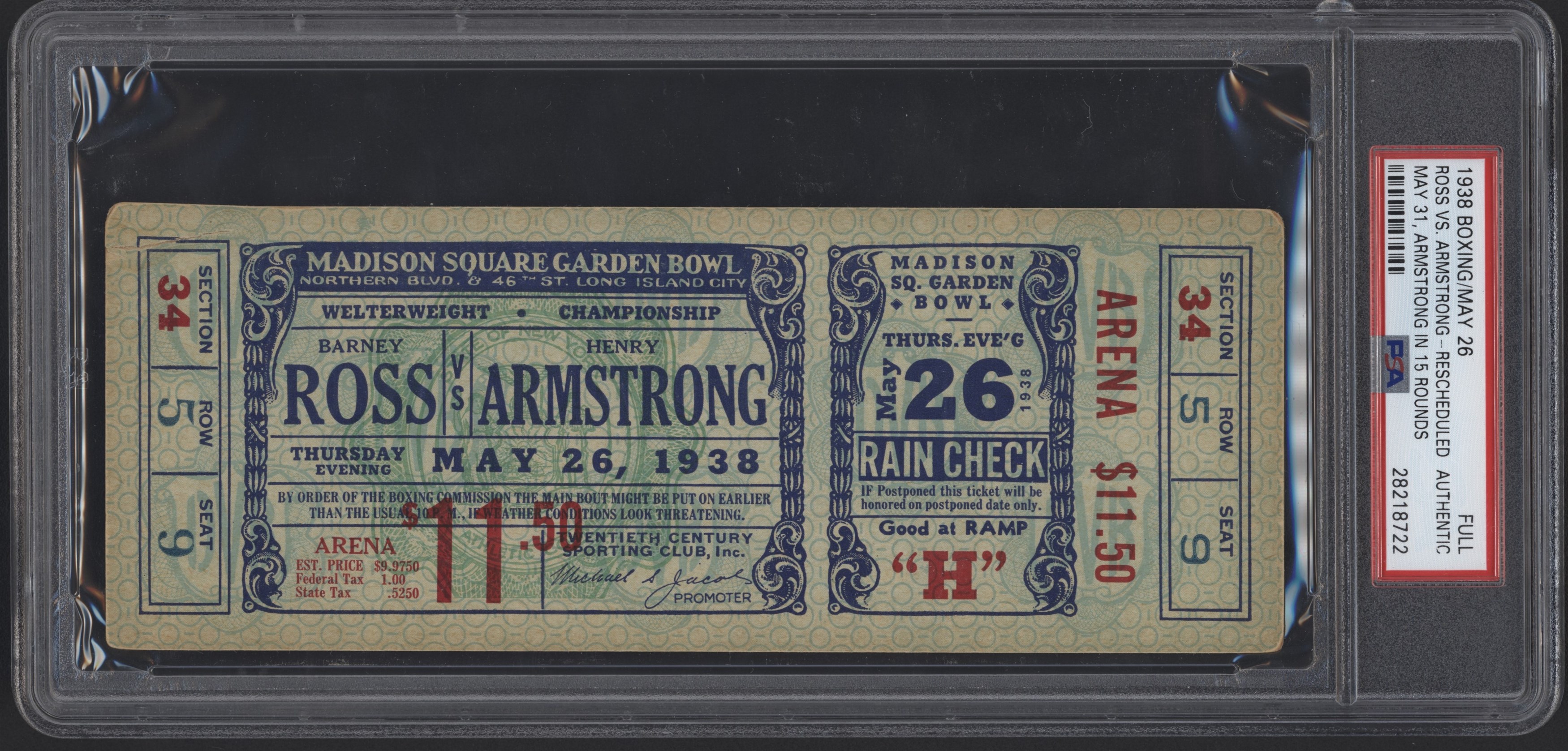 Welterweight championship fight held at Madison Square Garden between Barney Ross and Henry Armstrong. Armstrong won the fight by unanimous decision. PSA grade A.
