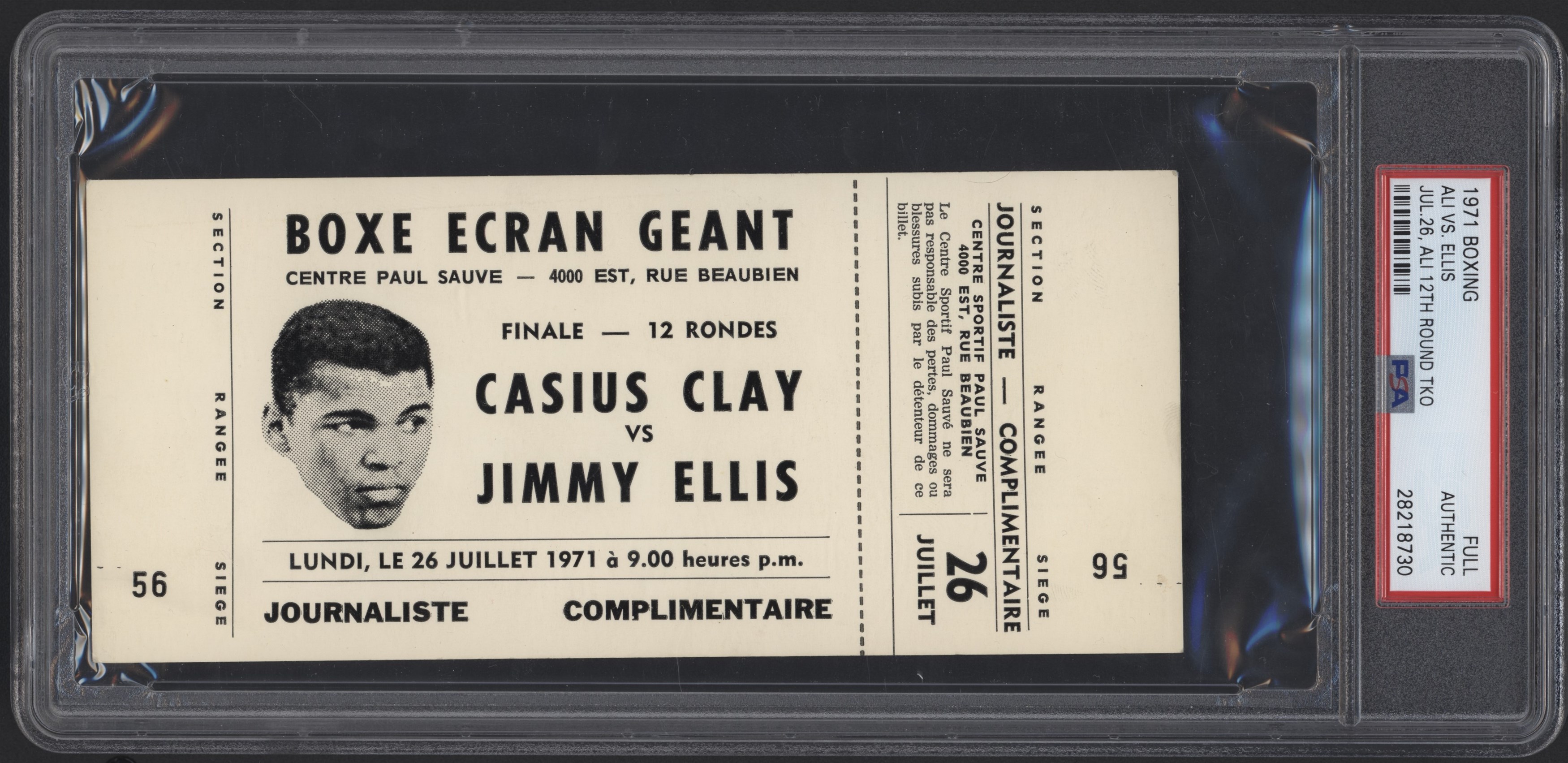 Muhammad Ali vs. Jimmy Ellis Press ticket. The ticket is written in French and refers to Ali as "Casius Clay". The fight went into the 12th and final round but Ali won by TKO before the final bell. PSA grade A.