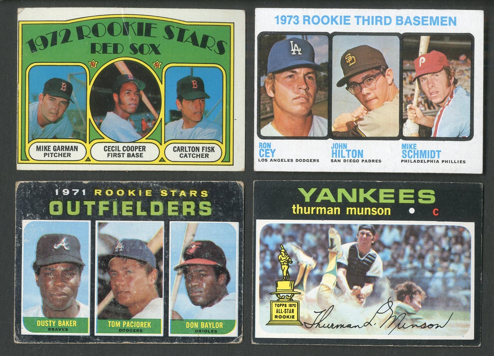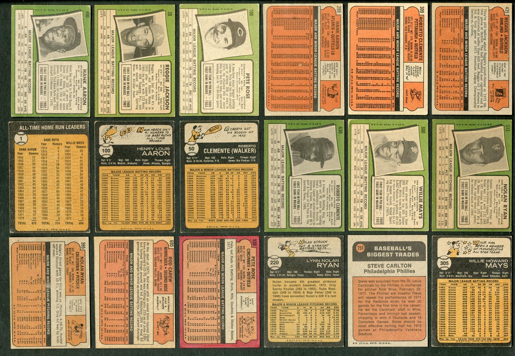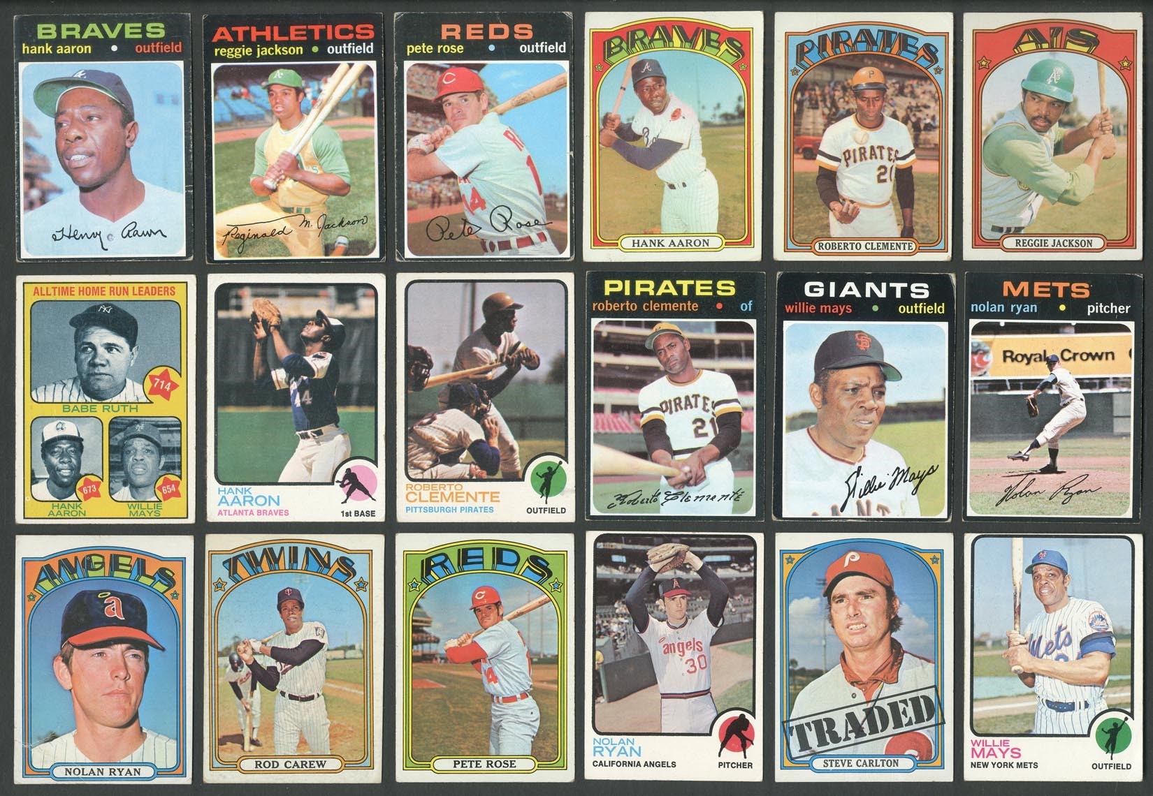 A trio of sets from the early 1970s, with 1971 and 1972 being two of the largest vintage sets Topps ever issued. Loads of stars, HOFers, rookie cards and high numbers. Includes: 1) 1971 complete set of 752 cards w/#5 Munson (VG/EX), 20 Jackson (VG/EX), 55 Carlton (VG/EX), 100 Rose (GD), 160 Seaver (VG/EX), 180 Kaline (VG), 210 Carew (EX/MT), 250 Bench (VG), 300 B. Robinson (VG), 341 Garvey RC (VG/EX), 400 Aaron (VG), 513 Ryan (VG/EX), 525 Banks (GD/VG), 530 Yastrzemski (EX), 550 Killebrew (VG/EX), 570 Palmer (RECOLORED), 600 Mays (VG), 625 Brock (VG/EX), 630 Clemente (EX), 640 F. Robinson (VG), 650 Allen SP (VG), 688 Anderson SP (VG), 700 Powell SP (GD/VG) and 709 Baylor/Baker RC (GD). Grades mostly VG to EX, with 25% lesser. 2) 1972 - complete set of 787 cards w/#37 Yaz (GD), 49 Mays (GD), 79 Fisk RC (GD/VG), 299 Aaron (VG), 300 Aaron IA (GD/VG), 309 Clemente (VG), 310 Clemente IA (GD/VG), 420 Carlton (EX), 433 Bench (VG), 435 Jackson (VG/EX), 445 Seaver (FR/GD), 559 Rose (VG), 560 Rose IA (VG), 595 Ryan (GD), 600 Kaline (EX/MT), 686 Garvey (EX), 695 Carew (VG), 751 Carlton TR (EX), 752 Morgan TR (GD/VG) and 754 F. Robinson TR (GD). Grades mostly VG/EX to EX/MT, with 20% lesser. 3) 1973 - complete set of 660 cards w/#1 Ruth/Aaron/Mays (GD/VG), 50 Clemente (VG/EX), 100 Aaron (VG), 130 Rose (VG/EX), 174 Gossage RC (EX), 220 Ryan (VG/EX), 245 Yastrzemski (EX), 255 Jackson (VG/EX), 305 Mays (VG), 472 Gehrig (VG), 474 Ruth (GD/VG), 614 Evans RC (EX) and 615 Schmidt RC (EX/MT). Grades mostly VG to EX, with 25% lesser.