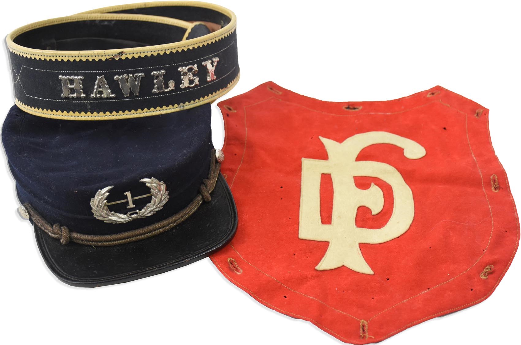 Yes, we are putting this is the baseball category because of the similar look to 19th century baseball uniforms. Three fine pieces emanate from the Hawley Fire Department of Hawley, Pennsylvania, right around the turn of the century if not earlier. 1) Special red wool flannel "bib" was once buttoned to a shirt front. Interestingly, has the felt letters F and D in white wool flannel sewn on which obviously stands for "Fire Department". About 11x14". Unmistakenly similar to baseball shirts of the 1870s-80s. 2) Leather belt difficult to separate from baseball belts of the 19th century. Wide outer belt has numeral "1" as well as "H A W L E Y" in cast metal, plus decorative edge and stitching. Inner belt is leather with buckle. Length is 42". 3) Visored cap, in wool with metallic braid, two "F.D." buttons. Sports cast metal laurel-wreath insignia bearing number "1" for department company. Size 7.5" and attractive markings inside, "Henderson & Co., Phila., "Band & Military Clothiers." Would look amazing along baseball artifacts of the period.