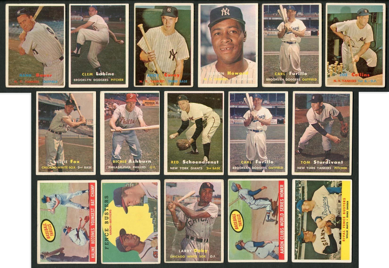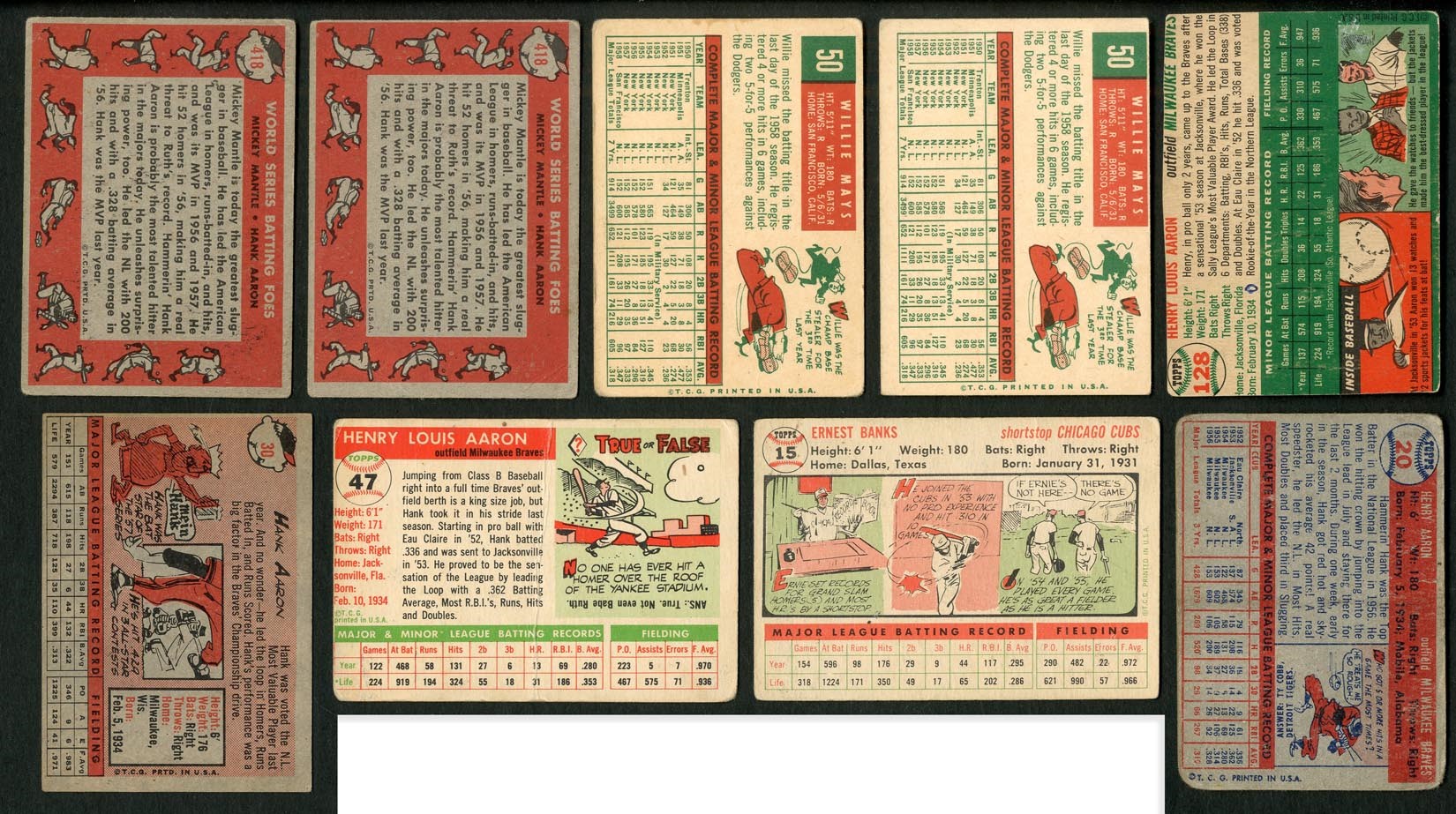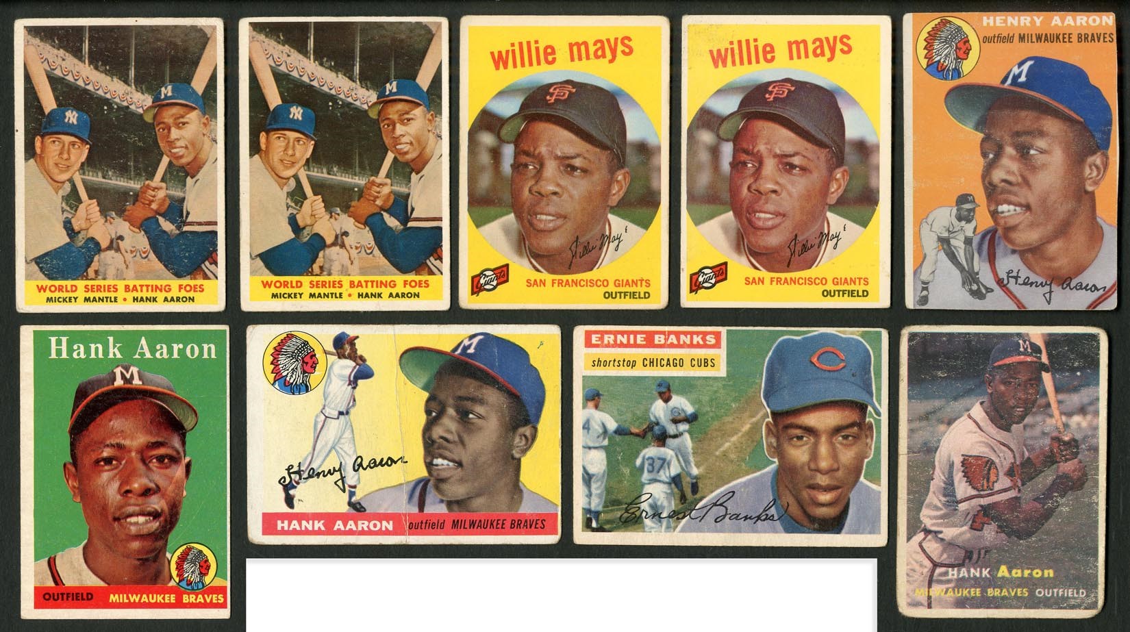 Nice group of late '50s cards, including several major stars including a 1954 Hank Aaron RC. Includes: 1954 - 1 card, #128 Aaron RC (TRIMMED). 1955 - 1 card, #47 Aaron (GD). 1956 - 8 cards w/#15 Banks WB (2, 1 EX & 1 GD) and 31 Aaron GB (EX). 1957 - 55 cards w/#1 Williams (EX), 20 Aaron (FR), 24 Mazeroski RC (VG), 38 Fox (FR/GD), 70 Ashburn, 85 Doby (PR), 154 Schoendienst plus Yankees/Dodgers and minor stars. 1958 - 9 cards w/#30 Aaron (EX), 418 Mantle/Aaron (2, both GD/VG) and 436 Mays/Snider (VG/EX). 1959 - 67 cards w/#50 Mays (2, both GD/VG), 212 Aaron/Mathews (GD/VG), 463 Kaline HL, 467 Aaron HL (GD/VG) plus 26 HIGH #s (all EX to NM). Total of 141 cards.