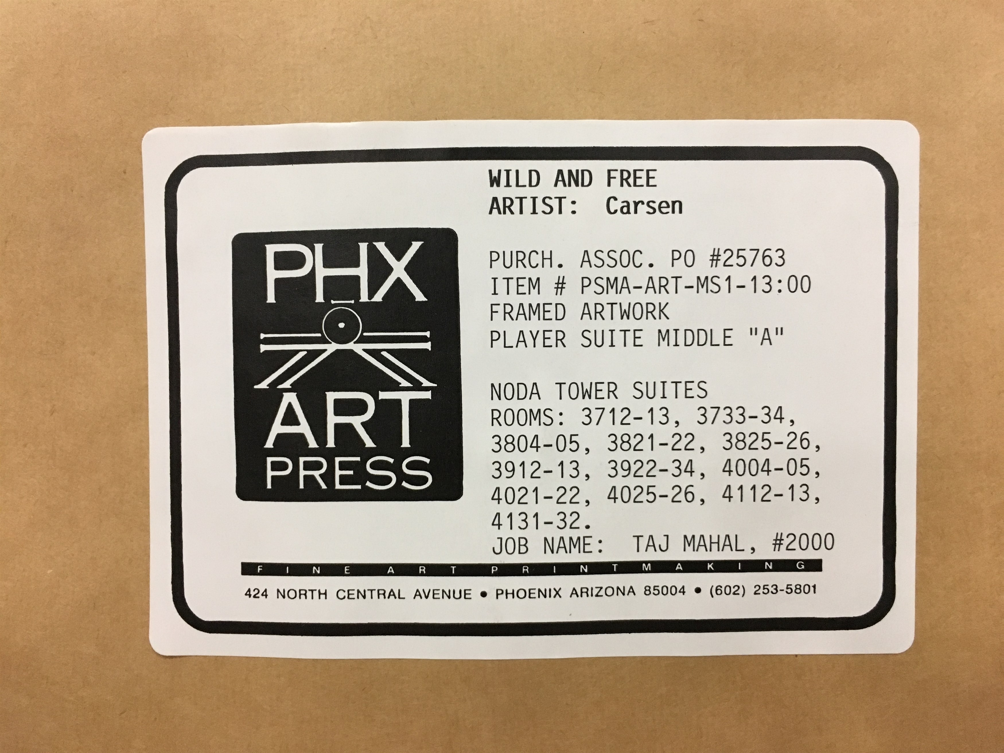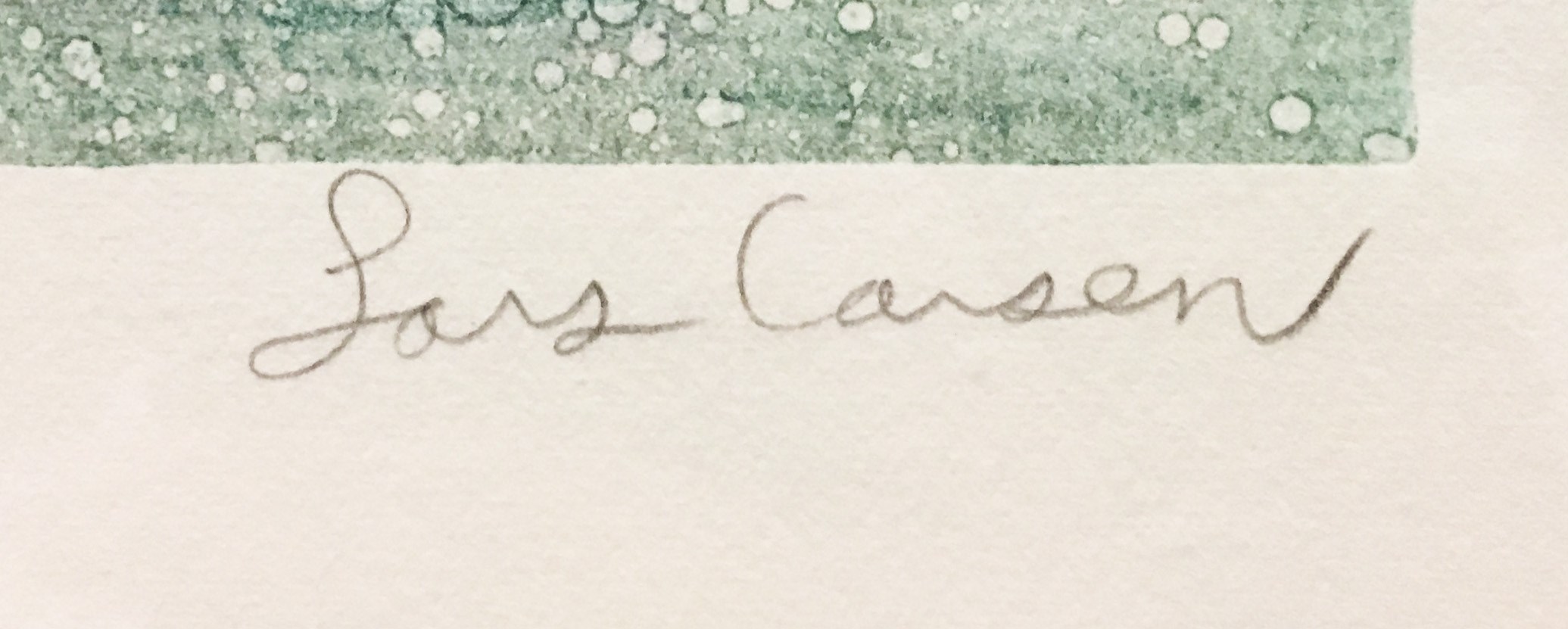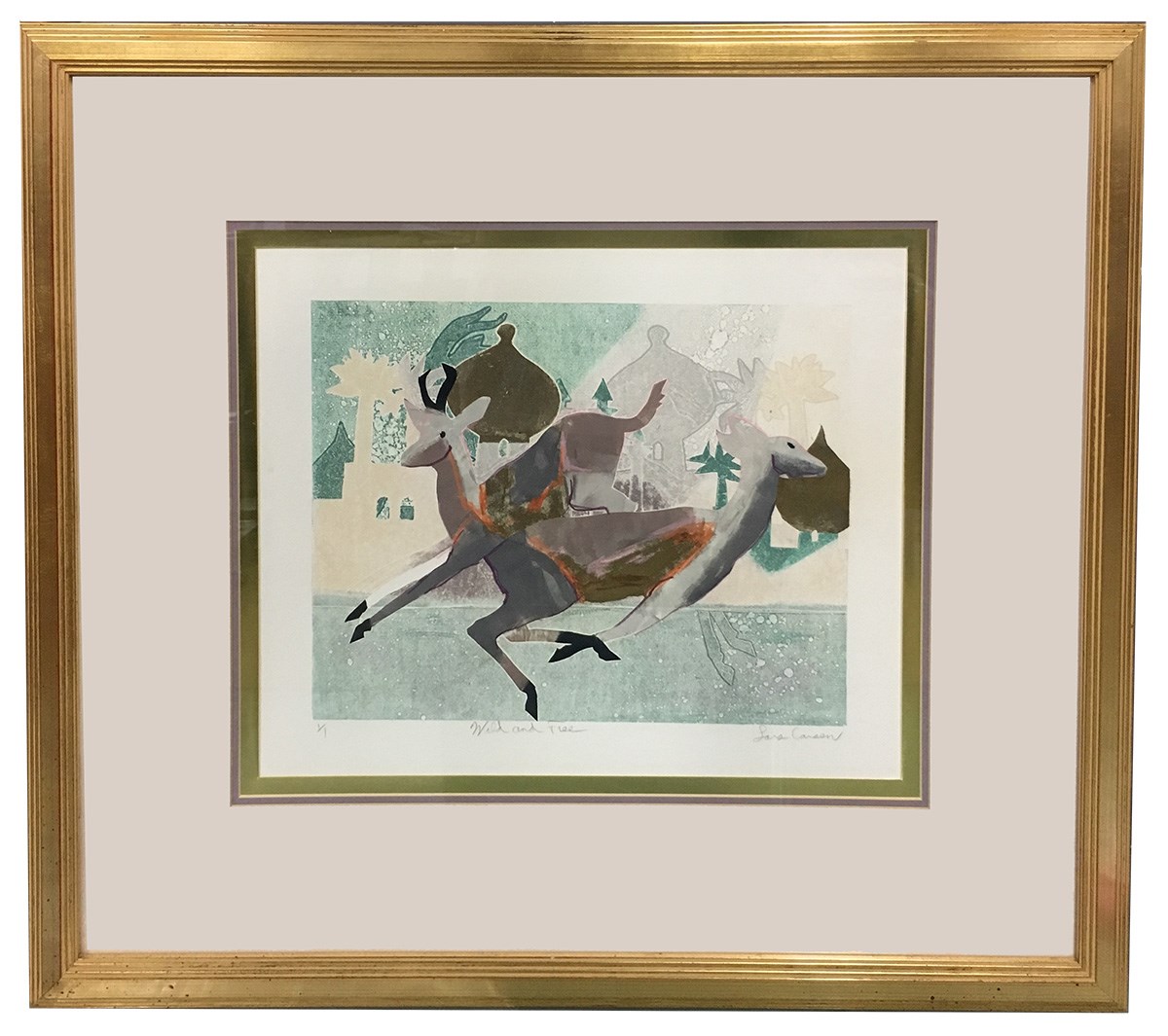 Fine work by Fred Tullis a.k.a Lars Carsen. Hand numbered "1/1" and signed by Carsen. Abstract lithograph of animals in front of two Taj Mahals. Hung in Taj Mahal Casino in Player Suite A in Atlantic City. Sticker on the back identifies it and is stating its origin and where it was hung. Museum framed to 28x30". Beautiful piece.