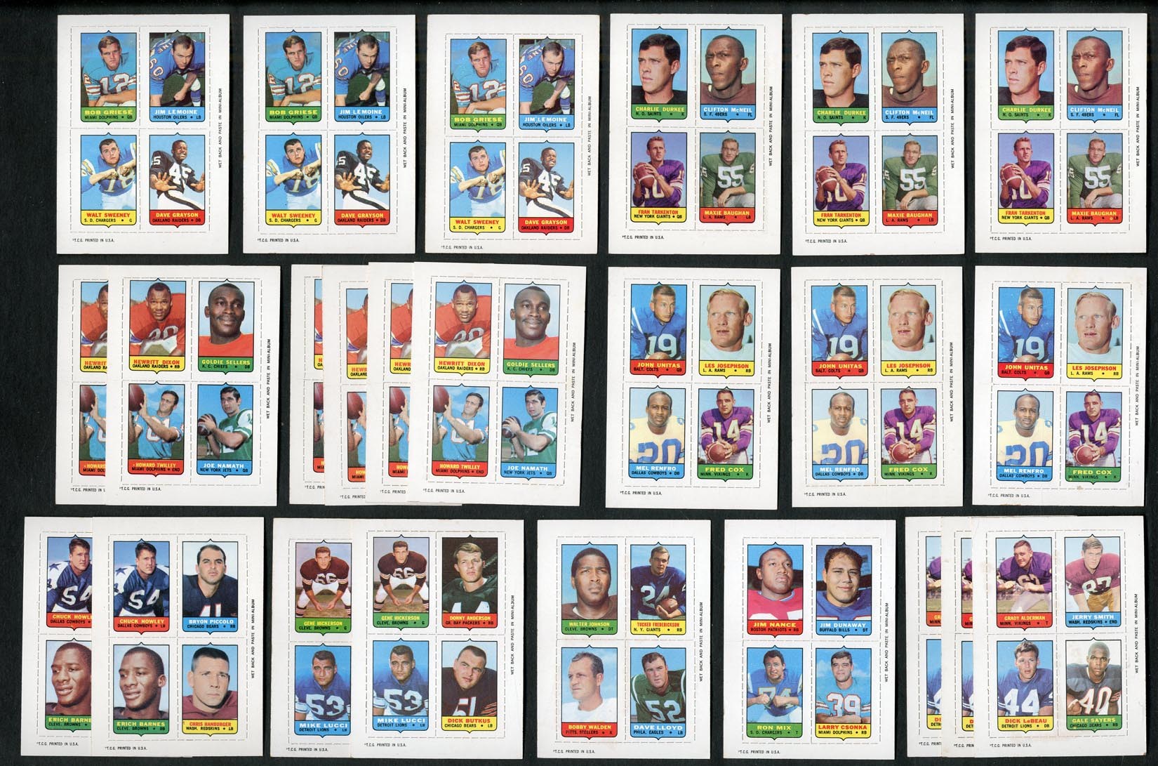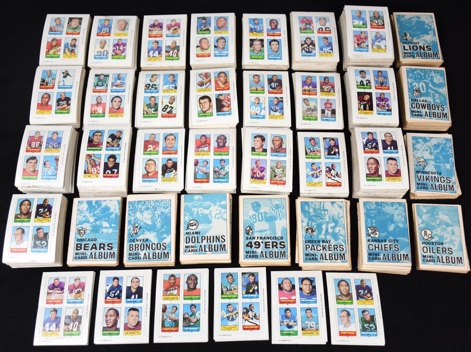 One of the more interesting Topps sets, their fragile nature and the proclivity for kids to "punch them" makes all the all unpunched examples a fun one. Shown here are the quantities we have for the major stars. They are identified by the "star" of these four-man troupes: Gale Sayers (22), Joe Namath (16), Fran Tarkenton (14), Bob Griese (16), Dick Butkus (10), Brian Piccolo rookie (15), Bart Starr (27), Larry Csonka (20), and Johnny Unitas (18). Total of over 1,500 cards are overall EX. Contains many nice EX-MT examples but about 20% have paper loss. Plus, there is a total of well over 500 of the matching Mini Card Albums. There is just the right mix of teams to make sets. They have some foxing so are overall VG+.