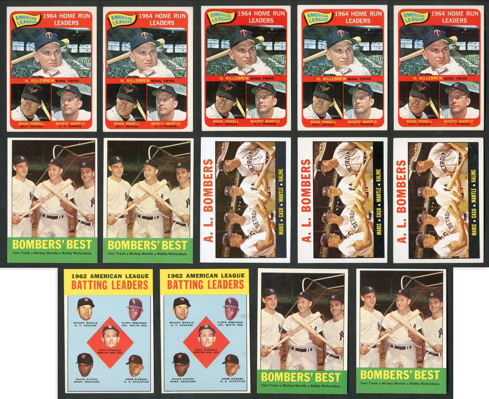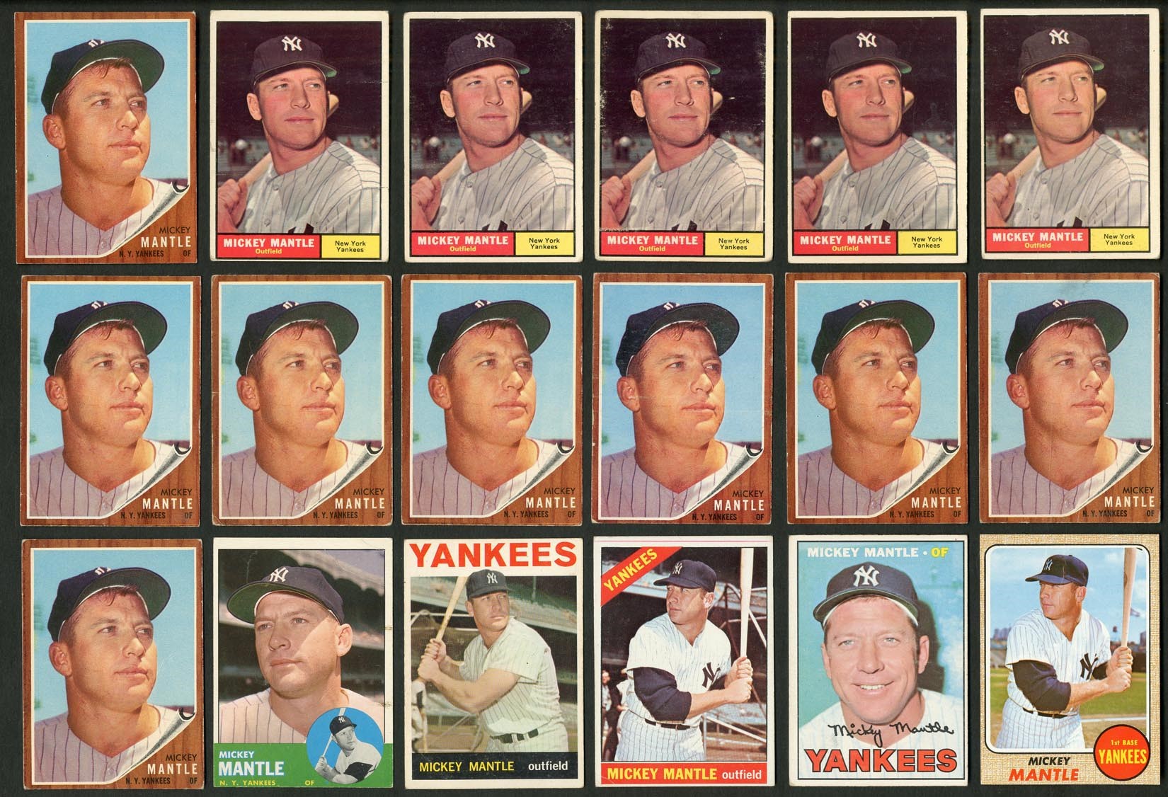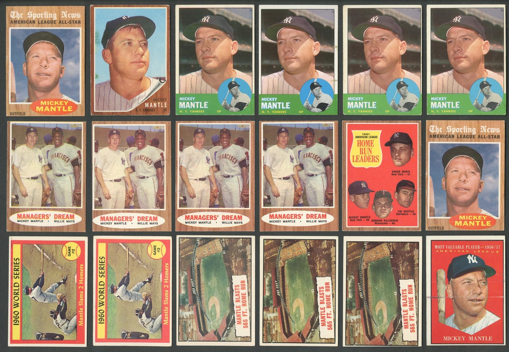 Total of 68 raw and fresh to the hobby Mickey Mantle cards from a long held collection. Ton of value here. Includes: REGULAR ISSUE (23) - 1961 Topps #300 (5, 2 VG/EX, 1 VG and 2 GD); 1962 #200 (9, 6 VG to VG/EX, 2 GD and 1 FR - back damage); 1963 #200 (5, 4 GD/VG to VG & 1 GD); 1964 #50 (VG); 1966 #50 (VG); 1967 #150 (GD/VG); 1968 #280 (GD/VG). SPECIALS (45) - 1960 #160 Rival A/S (GD); 1961 #44 LL (3, 2 EX & 1 GD); 1961 #307 WS HR (4, 2 EX & 2 VG); 1961 #406 HR (3, all EX to EX/MT); 1961 #487 MVP (EX, print); 1962 #18 Manager's Dream (4, VG to EX), 1962 #54 LL (VG/EX); 1962 #471 A/S (2, both EX); 1963 #2 LL (2, EX to EX/MT); 1963 #173 Bombers Best (4, EX to EX/MT); 1964 #331 A.L. Bombers (3, 2 EX - 1 miscut - & 1 VG); 1965 #3 AL HR LL (10, 7 EX to EX/MT & 3 VG to VG/EX); 1965 #5 AL RBI LL (5, VG/EX to EX); 1965 #134 WS HR (EX) and 1968 #490 Superstars (VG).