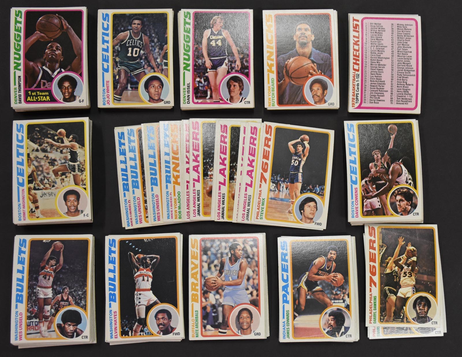 Includes: #3 Wilkes (12), 5 McAdoo, 7 Unseld (12), 13 Murphy, 20 Gervin (12), 25 Hayes (12), 26 Archibald (12), 27 Edwards (7), 34 Dawkins (12), 40 Cowens (12), 45 Monroe (12), 61 Bing (12), 63 Nixon (11), 67 Checklist (12), 73 Gilmore (12), 81 Issel (12), 83 Frazier (11), 85 Jo Jo White (11), 100 Thompson (11), 125 Lanier (12) and 132 Dantley (12). Total of 221 cards.