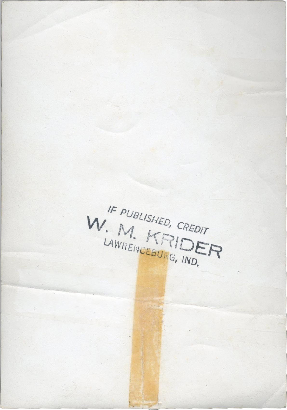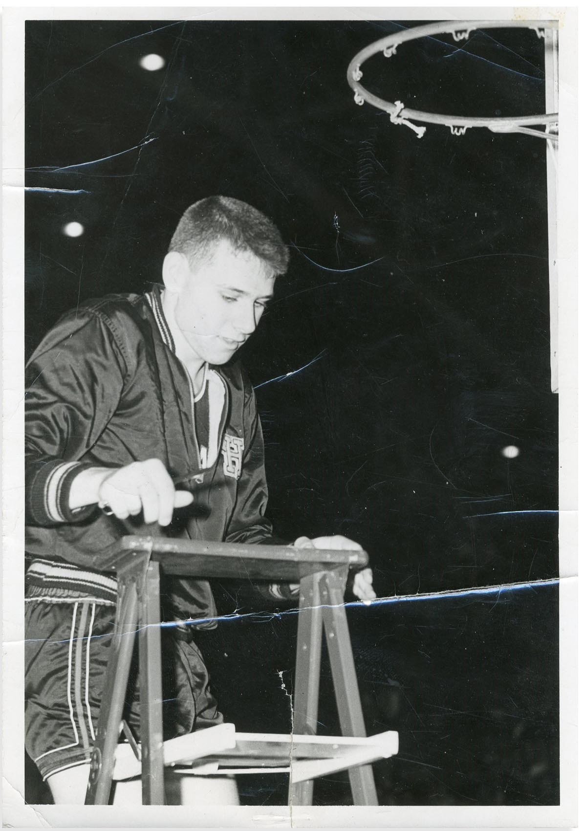 Penultimate image of Bobby Plump cutting down the net in the Indian State Finals. Immortalized by local photographer W.M. Krider with his stamp on verso. Obtained from 1954 Milan team member. Repaired tear and some creasing.