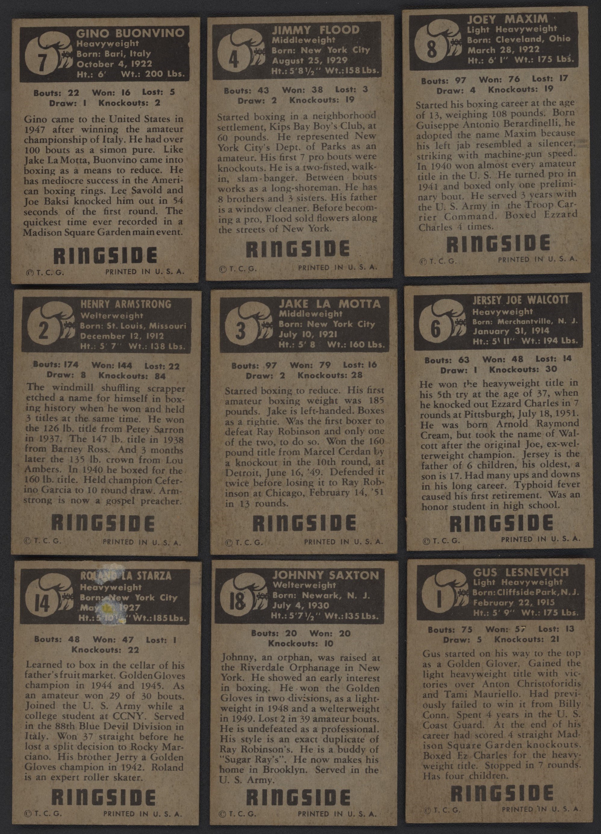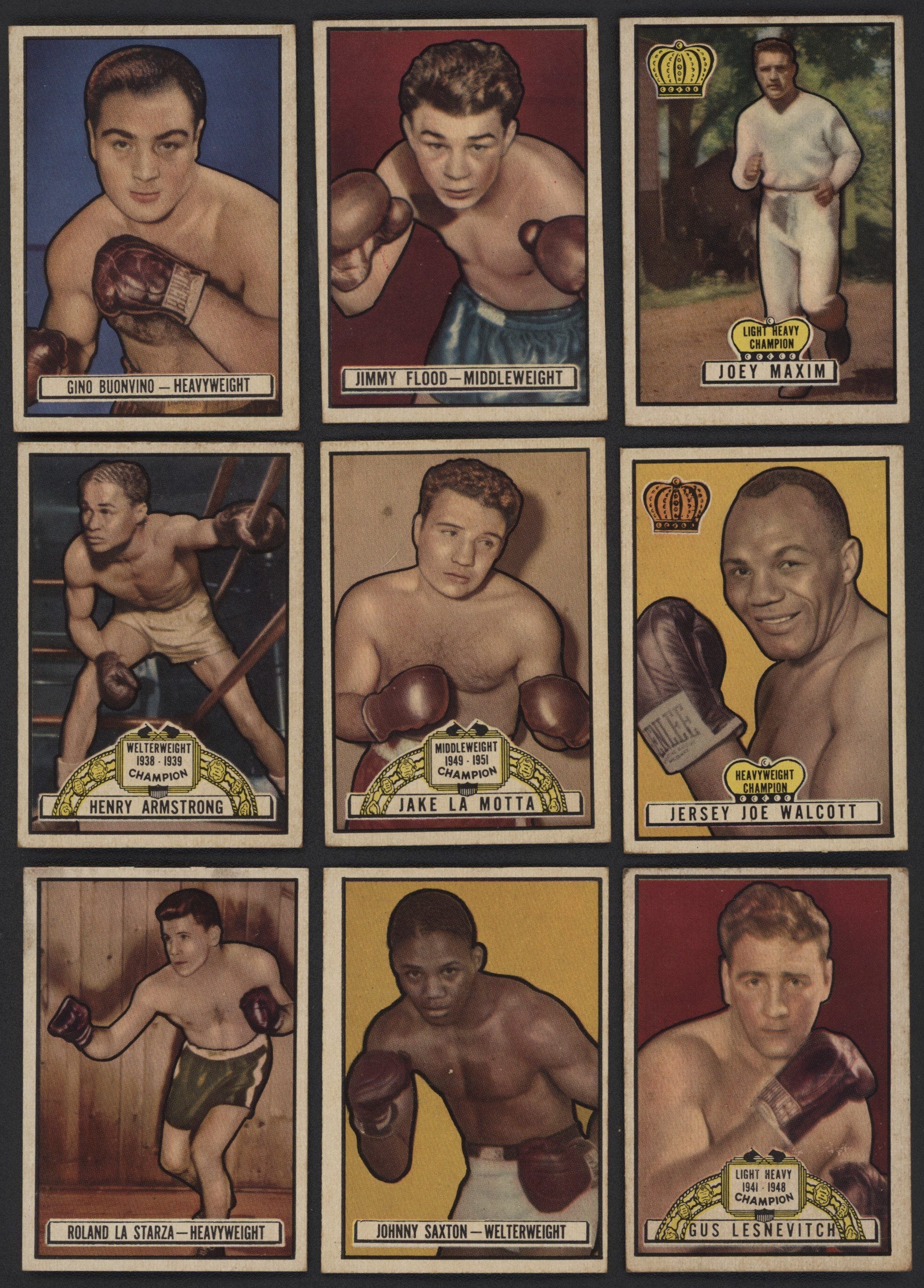 Near set of these popular boxing cards including Louis and LaMotta. Missing only #'s 37-45 and #49 Murphy for completion. Grades VG to EX/MT.