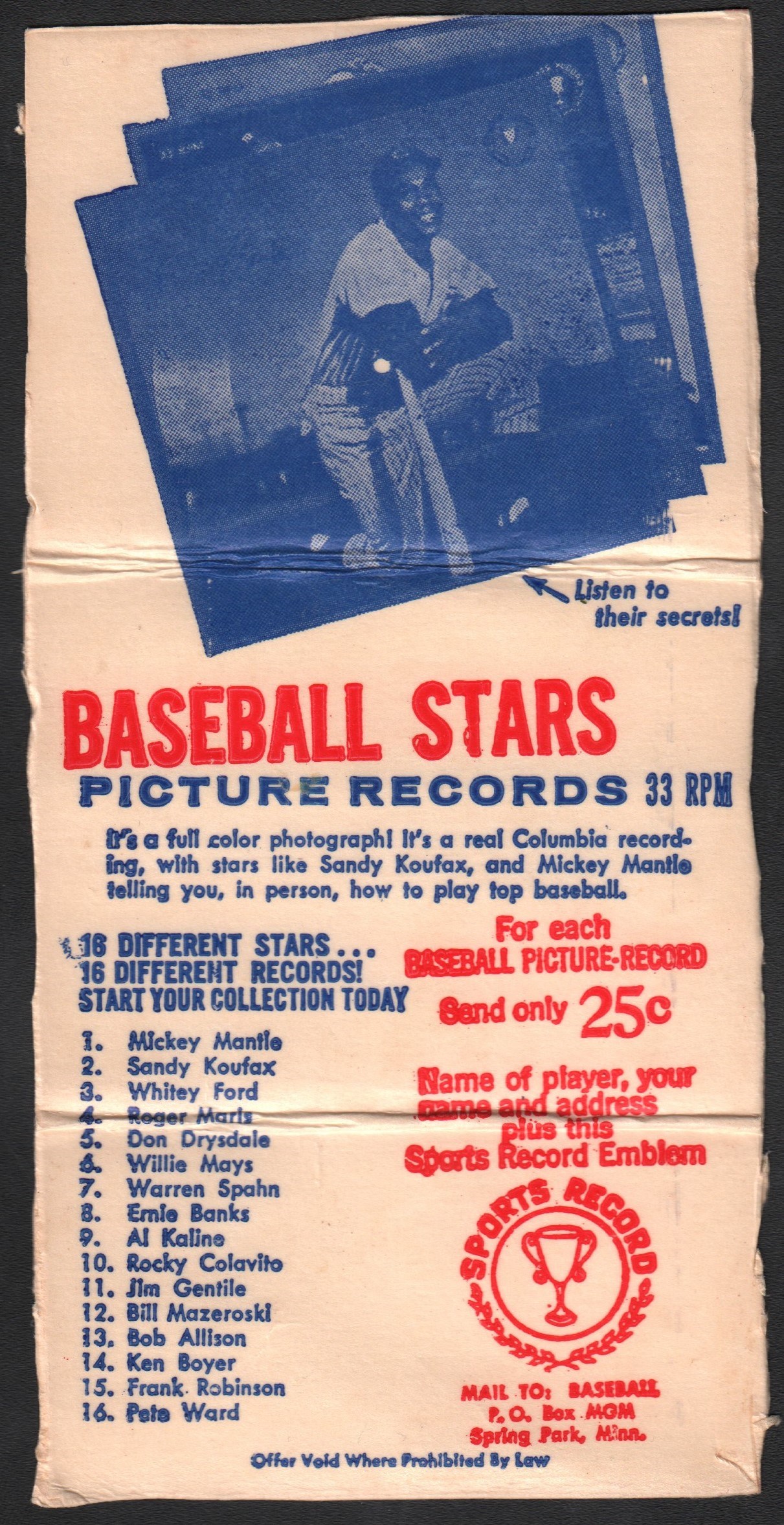 The 1964 Auravision records were a popular item of actual record albums with player images, with a recorded interview of the player. This milk carton style advertising piece features the Ernie Banks record to sell "BASEBALL STARS picture records" for 25 cents each. Checklist of 16 records is also featured. Excellent condition overall with a slight jagged cut along right hand side. Two product folds across middle.