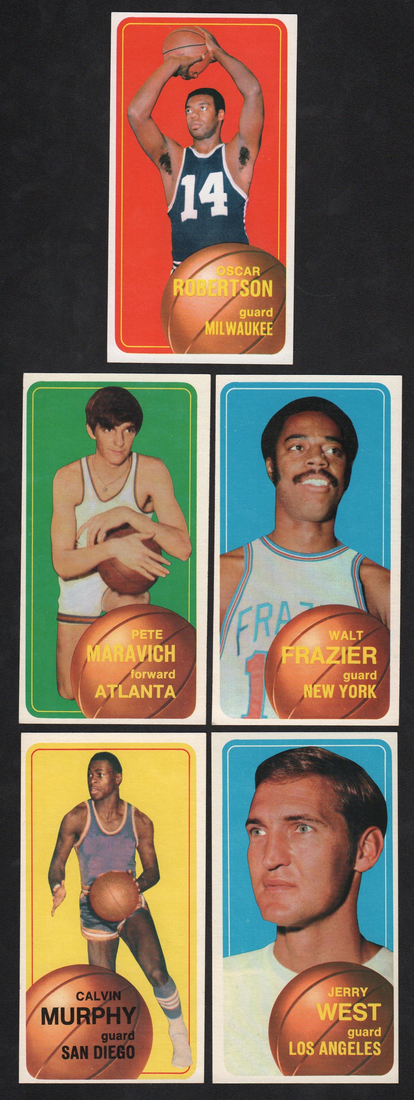 Baylor (EX/MT), 75 Alcindor (EX/MT), 100 Robertson (NM), 101 Checklist (NM), 120 Frazier (EX/MT), 123 Maravich RC (EX/MT), 137