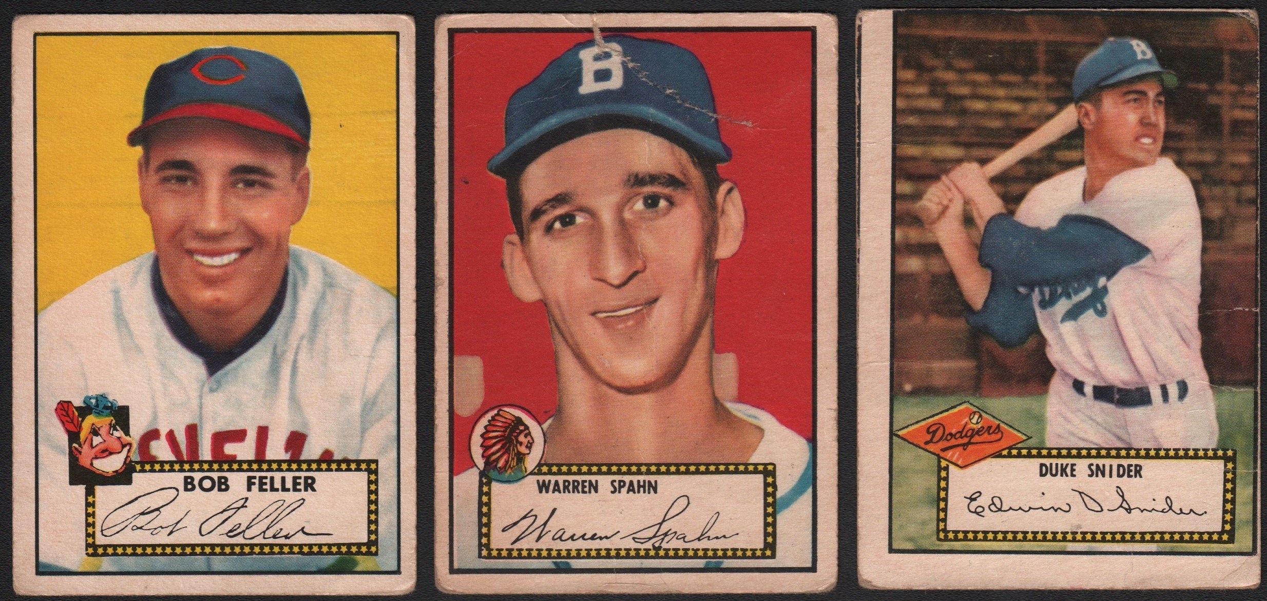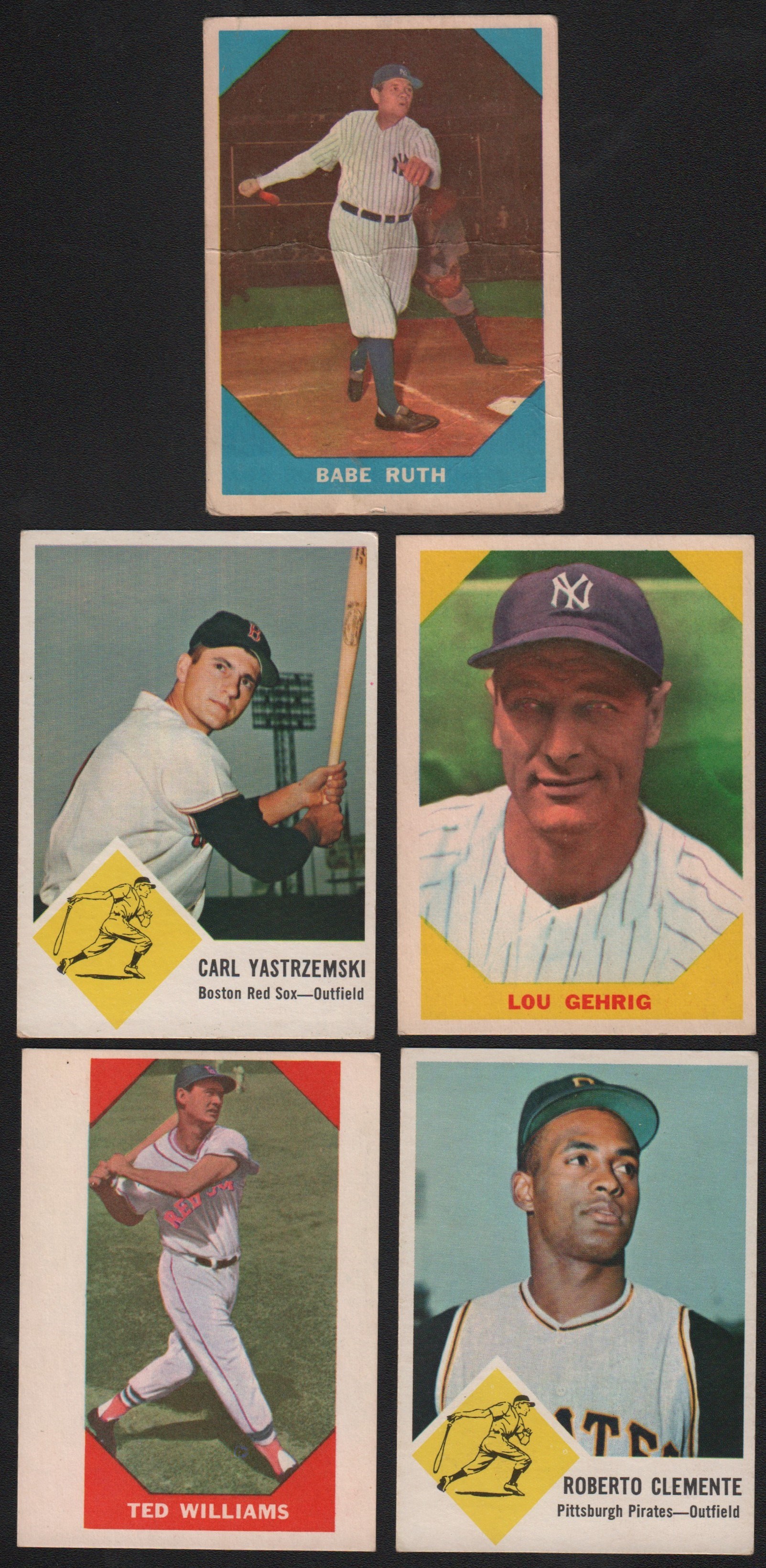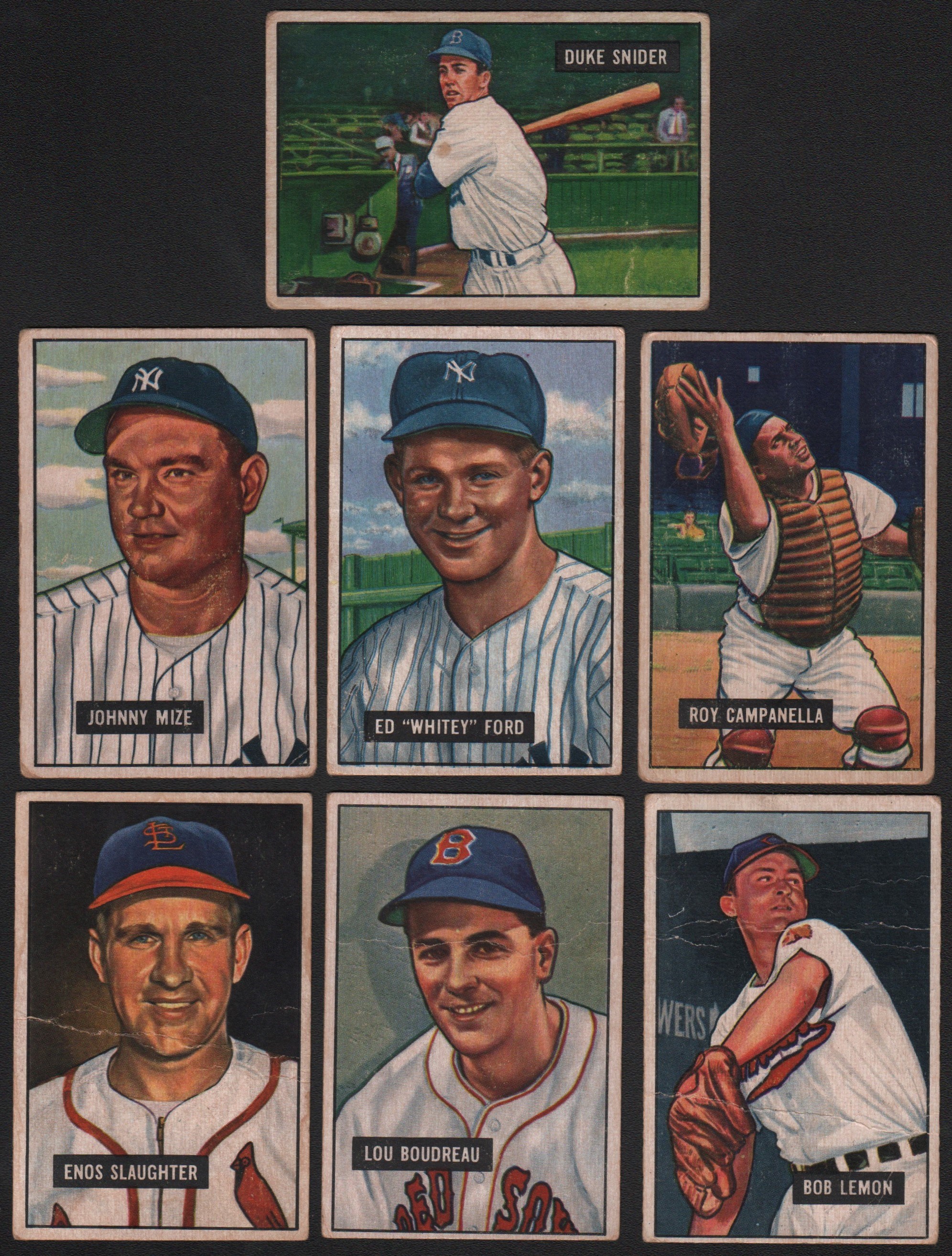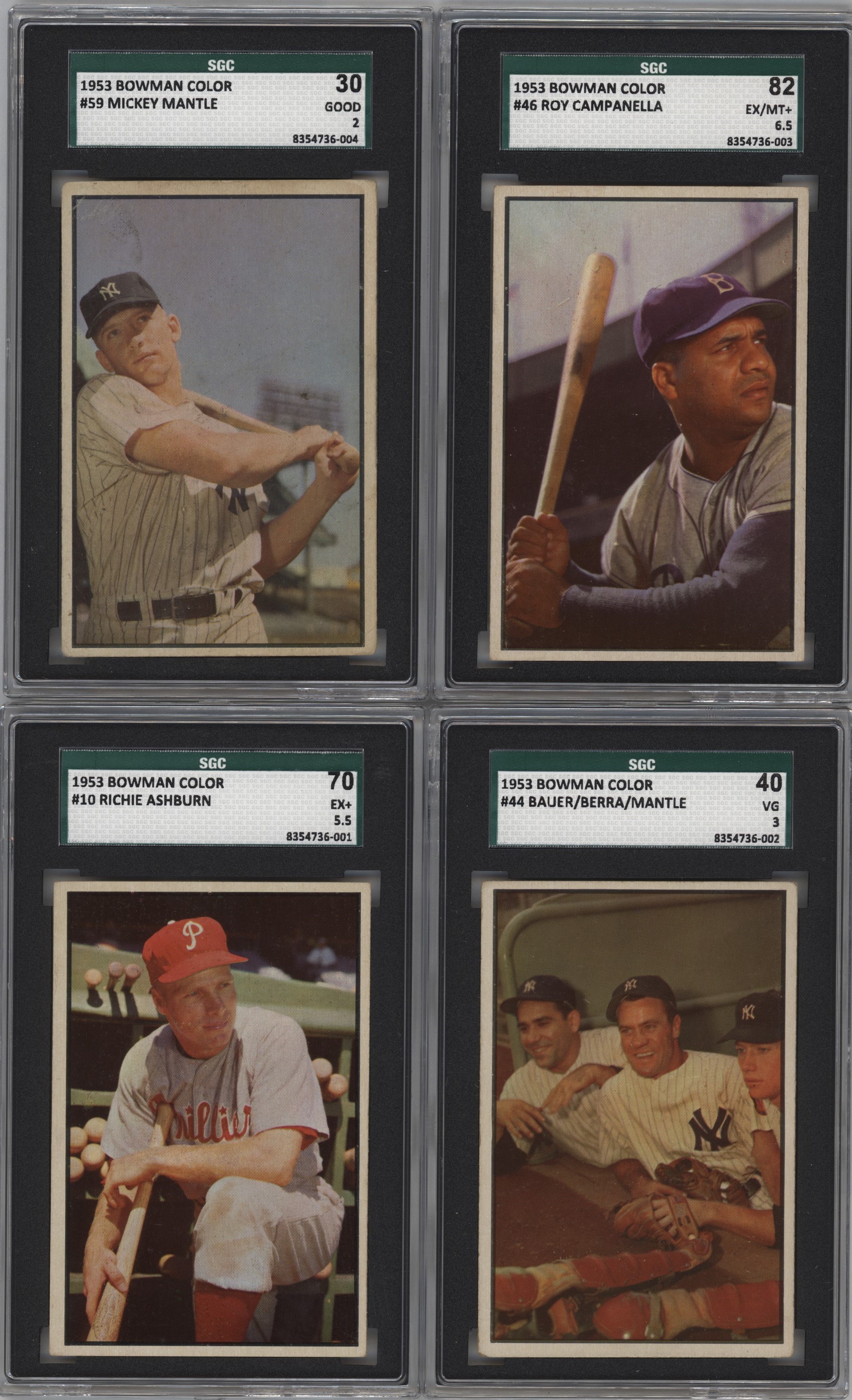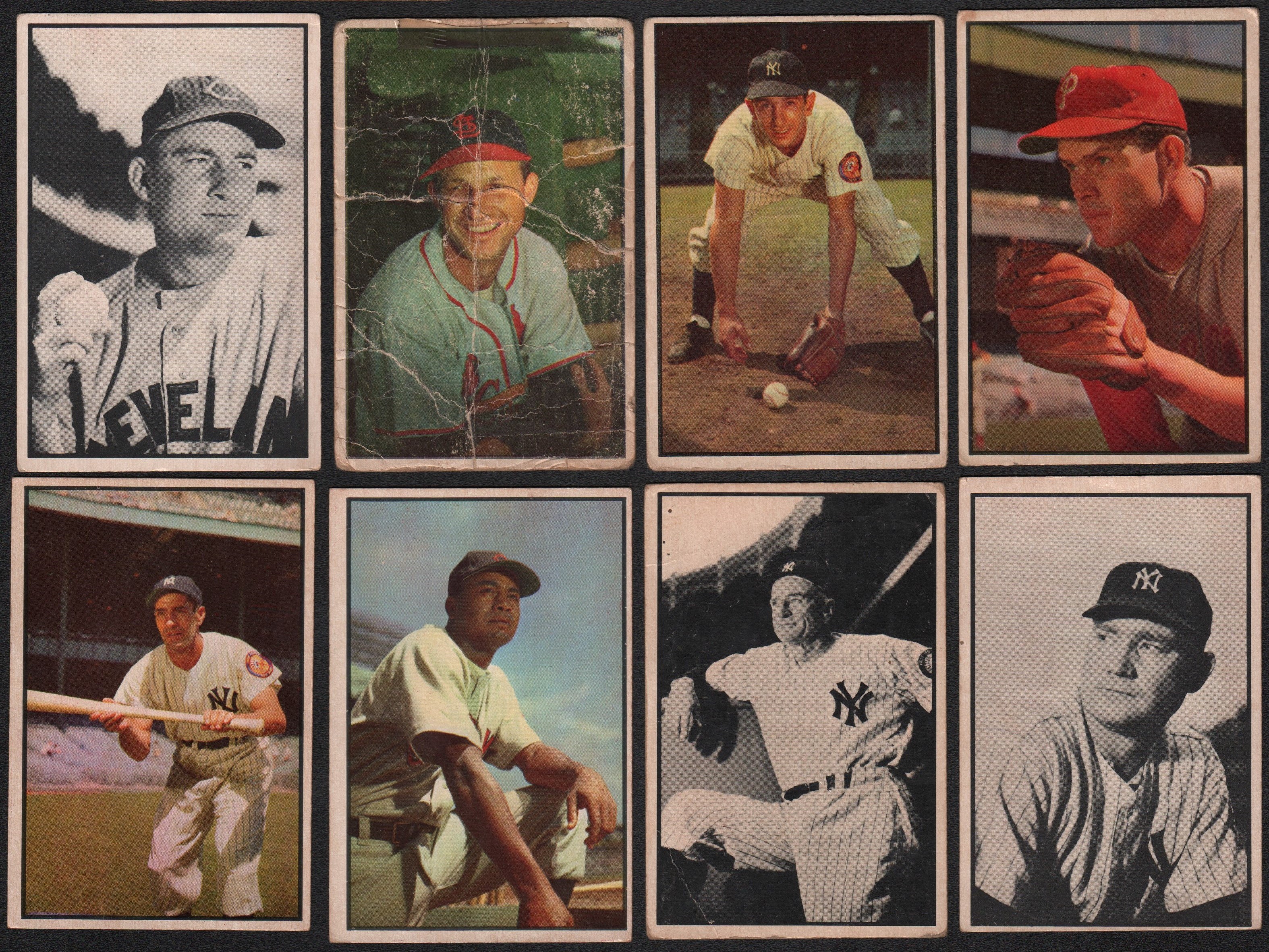 Includes: BOWMAN - 1951: 111 cards w/#1 Ford RC (FR, back damage), 31 Campanella (VG), 32 Snider (GD/VG), 50 Mize (GD/VG), 53 Lemon (GD), 58 Slaughter (GD) and 62 Boudreau (VG), 13 high #s. Mostly lower to mid-grade. 1953 B&W: complete set of 64 cards w/#15 Mize (VG), 27 Lemon (VG) and 39 Stengel (GD). Grades mostly VG to VG/EX, 30% lesser. 1953 Color: partial set of 99 cards w/#9 Rizzuto (VG), 10 Ashburn (SGC- EX+ 5.5), 18 Fox (EX), 32 Musial (PR), 40 Doby (VG), 44 Bauer/Berra/Mantle (SGC- VG 3), 46 Campanella (SGC- EX/MT+ 6.5), 59 Mantle (SGC- GD 2 - scuffing), 65 Roberts (GD/VG), 81 Slaughter (GD), 118 Martin (GD), 11 other high #s (GD to VG). Grades mostly GD to VG/EX (some lesser), a few better. 1954: 75 different. Grades EX or better. TOPPS - 1952: 29 different w/#33 Spahn (PR/FR), 37 Snider (FR/GD) and 88 Feller (GD/VG). 1955 Double Headers: 38 different - no major stars. Grades mostly VG/EX to EX, some lesser. 1969 Deckle Edge: complete set of 33. FLEER - 1960: near complete set (78/79, missing #42 Cobb) w/#3 Ruth (GD), 28 Gehrig (EX/MT), 62 Wagner (FR, ink) and 72 Williams (NM). Grades mostly EX to EX/MT, some lesser. 1963: near-complete set (65/67, missing #5 Mays & 42 Koufax) w/#4 B. Robinson (VG/EX), 7 Yaz (EX), 32 Santo (EX/MT), 41 Drysdale (VG), 43 Wills (GD/VG), 45 Spahn (VG/EX), 46 Adcock (TRIMMED), 56 Clemente (EX), 59 Mazeroski (EX), 61 Gibson (GD/VG), 64 Cepeda (EX) and NNO Checklist (CHECKED). Grades mostly VG to EX, some lesser and a few better.