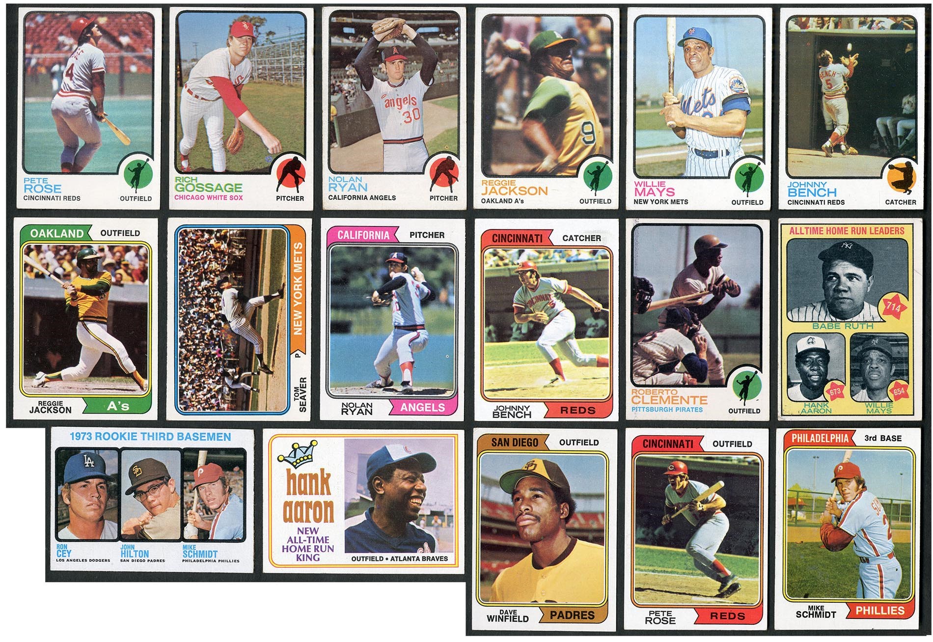 Pair of high grade complete sets, all fresh to the hobby from a long time collector. Includes: 1973 - complete set of 660 cards w/#1 Ruth/Aaron/Mays (VG), 50 Clemente (EX), 100 Aaron (NM), 130 Rose (EX/MT), 174 Gossage RC (VG/EX), 193 Fisk (EX/MT), 220 Ryan (VG), 245 Yastrzemski (VG/EX), 255 Jackson (VG/EX), 305 Mays (EX), 350 Seaver (NM), 380 Bench (NM), 472 Gehrig (EX), 474 Ruth (EX/MT), 614 Evans RC (EX) and 615 Schmidt RC (EX). Grades 25% NM to NM/MT, 60% EX to EX/MT, 15% lesser. 1974 - complete set of 660 cards PLUS WASH NL cards and Red Checklists w/#s 1 Aaron (VG/EX), 10 Bench (EX), 20 Ryan (EX/MT), 80 Seaver (EX), 130 Jackson (EX/MT), 283 Schmidt (VG/EX), 300 Rose (EX) and 456 Winfield RC (GD/VG). Grades 25% NM to NM/MT, 60% EX to EX/MT, 15% lesser.