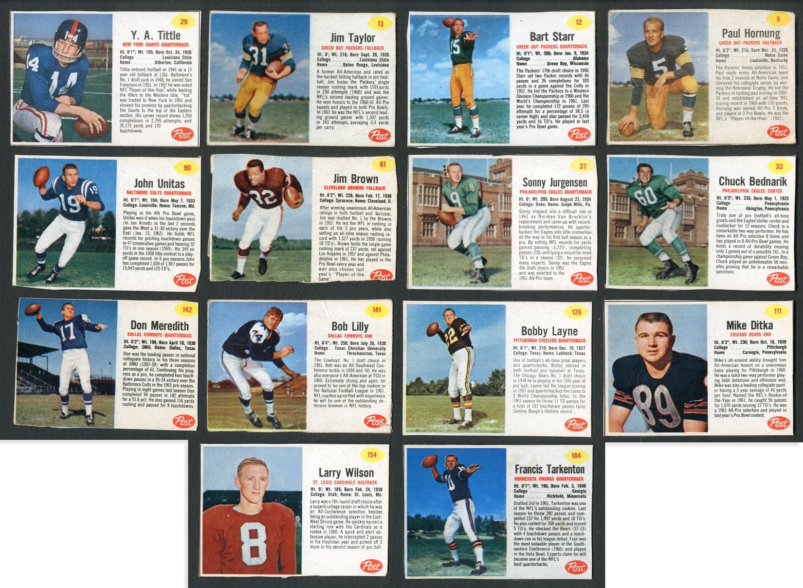Near-set of (187/200) cards w/#1 Currie (VG/EX), 6 Hornung (GD), 8 Kramer (EX), 12 Starr (VG/EX), 13 Taylor (GD), 29 Tittle (EX/MT), 33 Bednarik (VG/EX), 37 Jurgensen (VG/EX), 61 Brown (GD, short), 90 Unitas (VG), 111 Ditka (VG/EX), 126 Layne (EX), 141 Lilly (FR), 142 Meredith (GD/VG), 154 Wilson (VG/EX) and 184 Tarkenton (EX). Grades GD to EX, averaging VG, with most cards cut along or inside the black line. MISSING #s 2, 24, 25, 44, 59, 62, 74, 93, 103, 110, 139, 153 and 169.