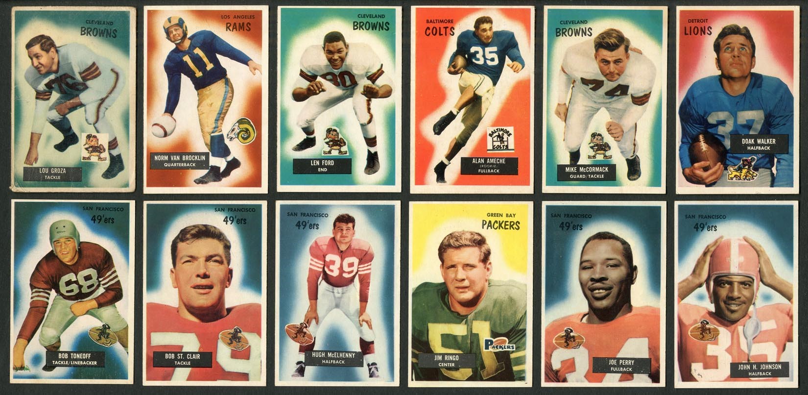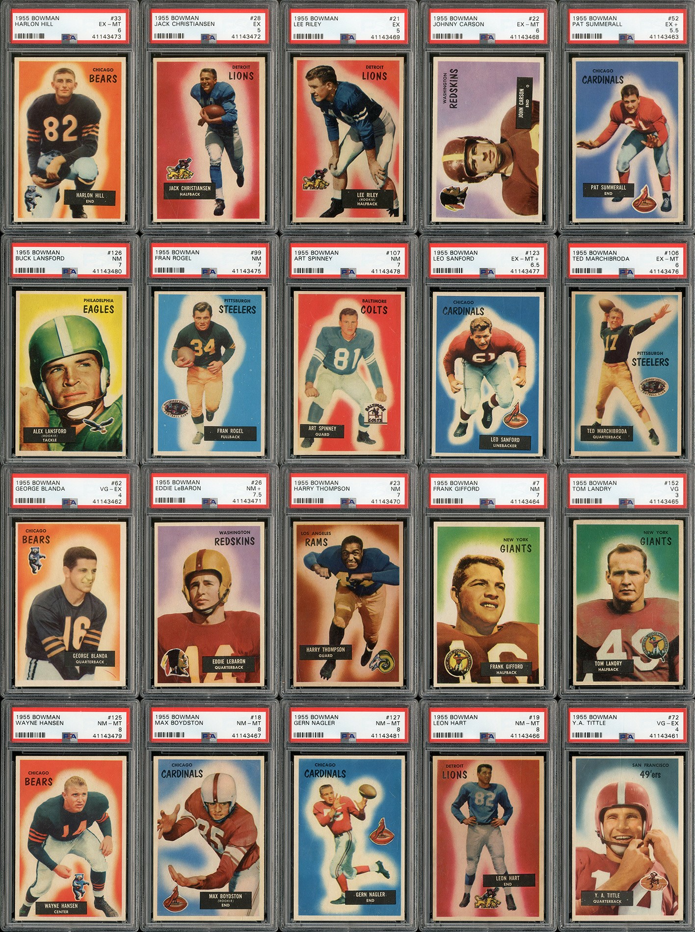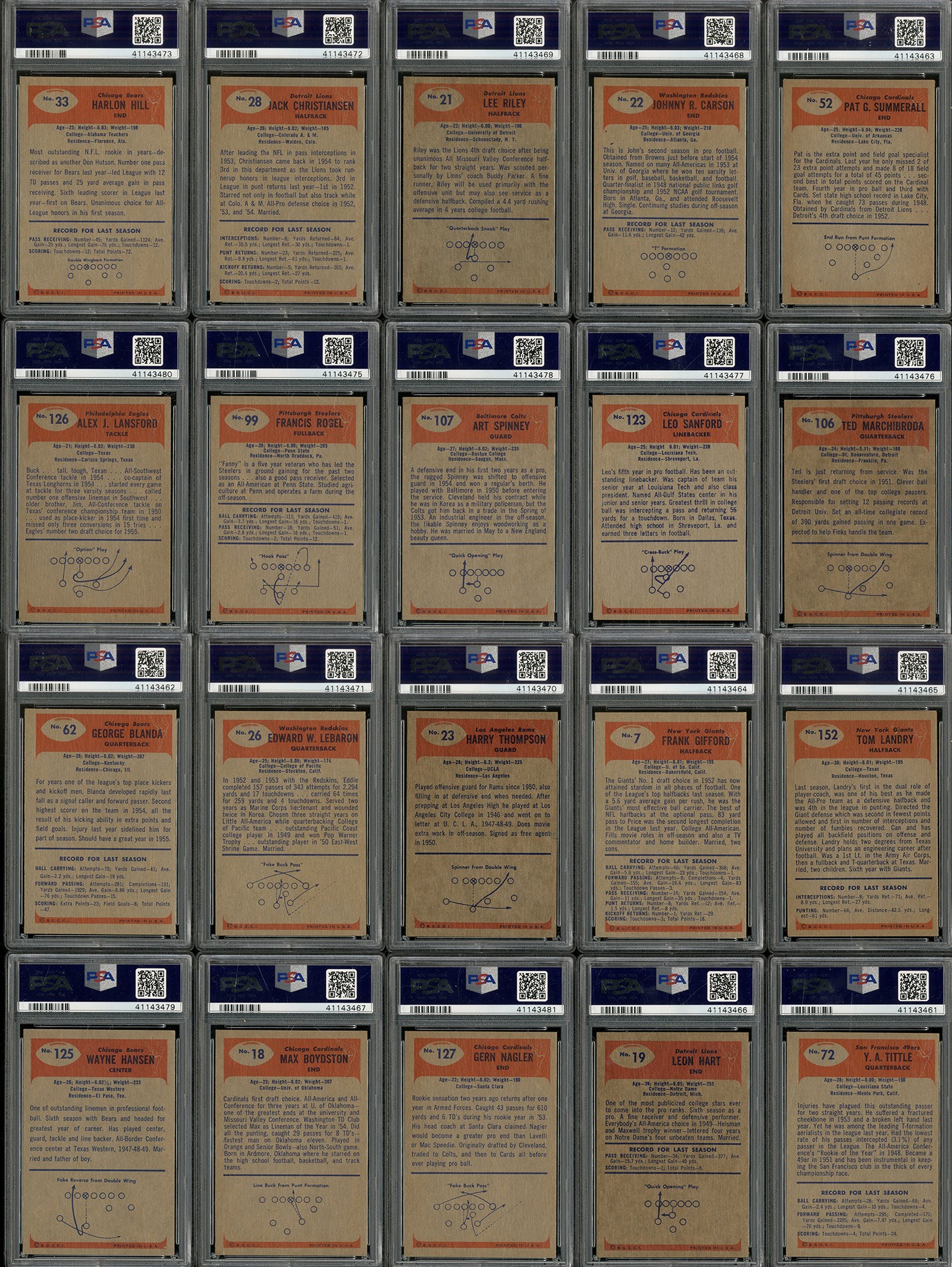 Complete 160-card set of 1955 Topps football with 21 PSA graded. Keys: Landry (PSA 3), Gifford (PSA 7), Summerall (PSA 5.5), Blanda (PSA 4). The following have also been PSA graded Tittle (PSA 4), Hart (PSA 8), Boydston (PSA 8), Carson (PSA 6), Riley (PSA 5), Thompson (PSA 7), LeBaron (PSA 7.5), Christiansen (PSA 5), Hill (PSA 6), Toogood (PSA 4), Rogel (PSA 7), Marchibroda (PSA 6), Sanford (PSA 6.5), Spinney (PSA 7), Hansen (PSA 8), Lansford (PSA 7), Nagler (PSA 8). Set rates a conservative EX-MT overall with centering being the determining factor. There is great potential for grading commons as there are many NM or better.
