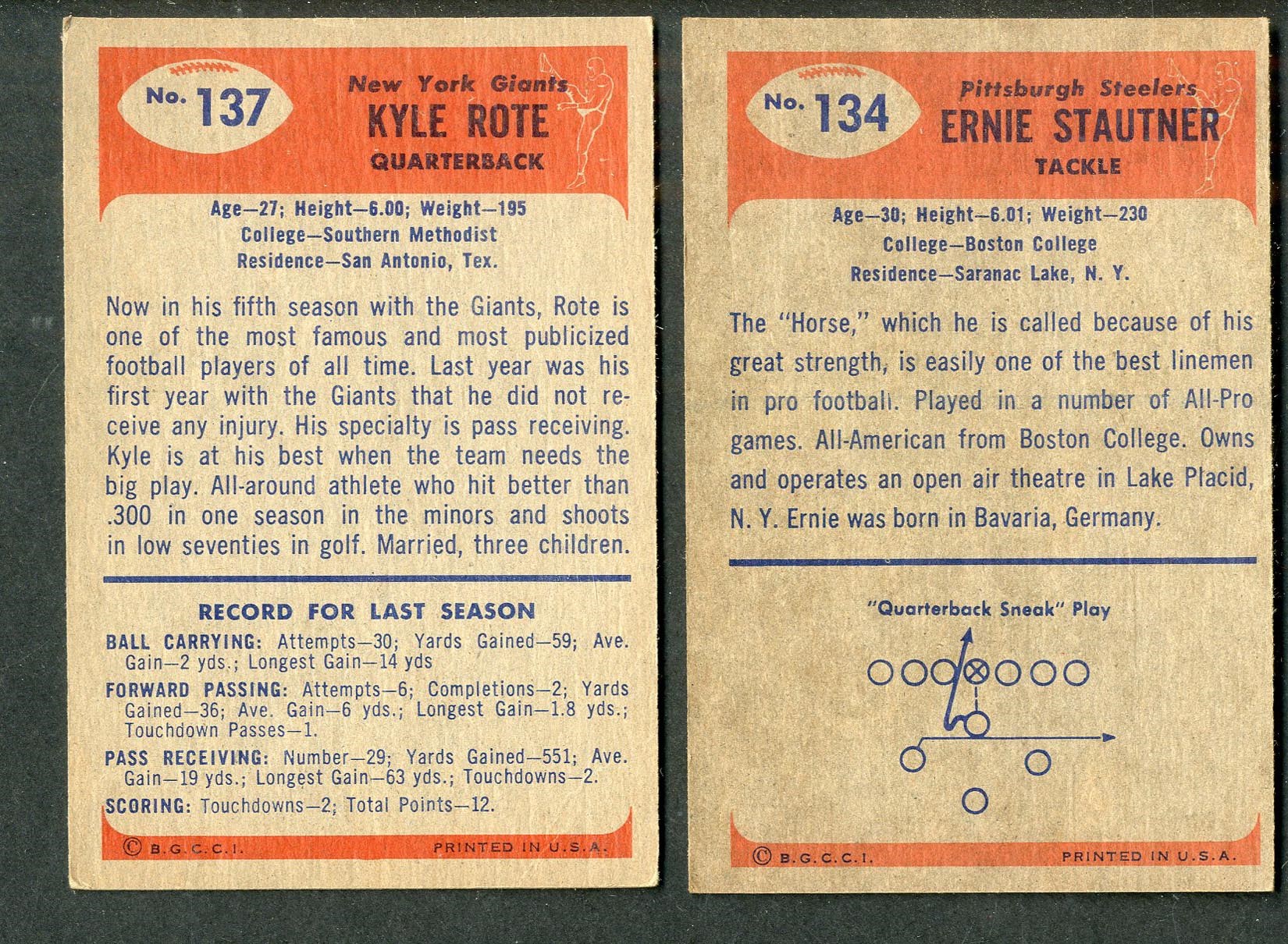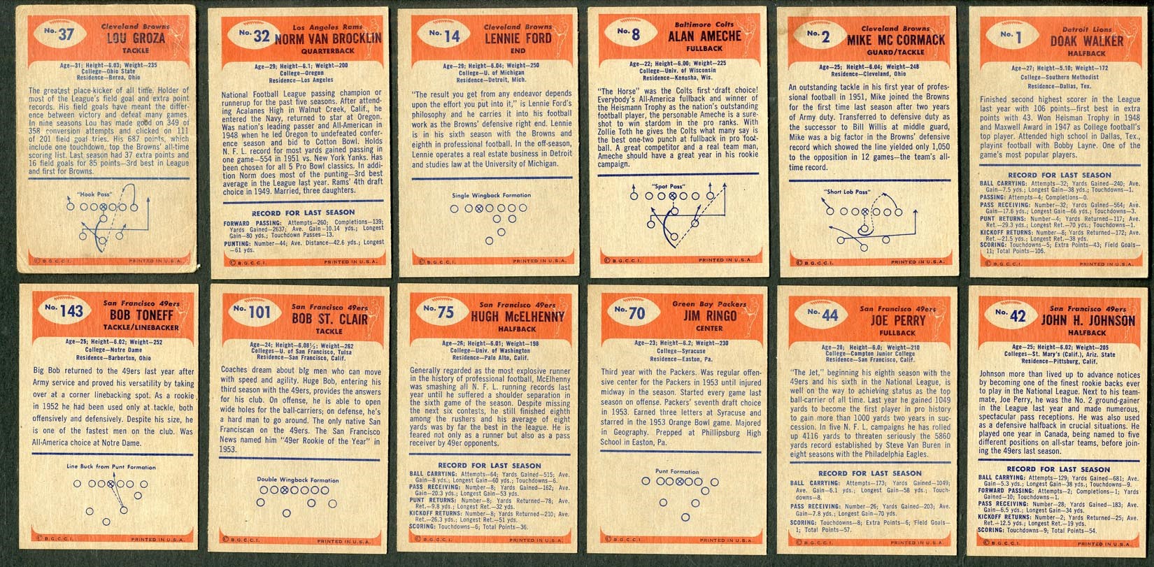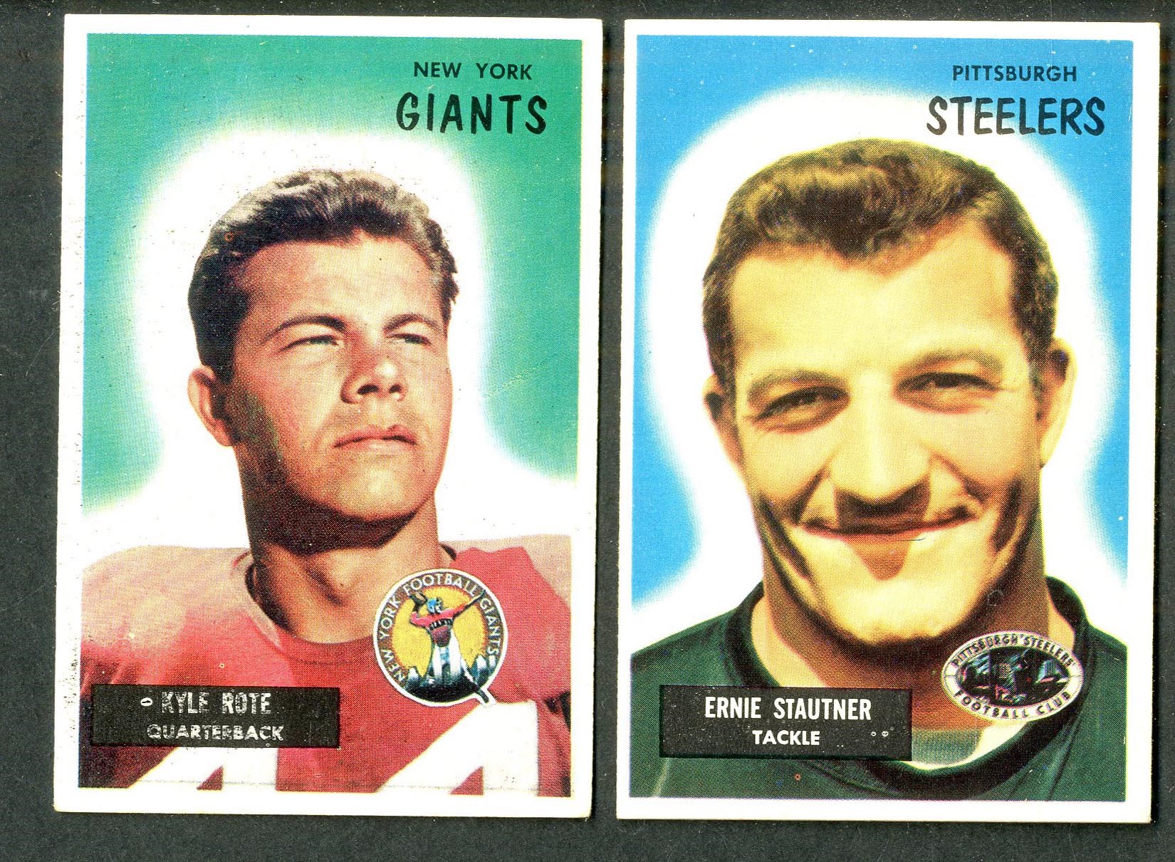 Complete 160-card set of 1955 Topps football with 21 PSA graded. Keys: Landry (PSA 3), Gifford (PSA 7), Summerall (PSA 5.5), Blanda (PSA 4). The following have also been PSA graded Tittle (PSA 4), Hart (PSA 8), Boydston (PSA 8), Carson (PSA 6), Riley (PSA 5), Thompson (PSA 7), LeBaron (PSA 7.5), Christiansen (PSA 5), Hill (PSA 6), Toogood (PSA 4), Rogel (PSA 7), Marchibroda (PSA 6), Sanford (PSA 6.5), Spinney (PSA 7), Hansen (PSA 8), Lansford (PSA 7), Nagler (PSA 8). Set rates a conservative EX-MT overall with centering being the determining factor. There is great potential for grading commons as there are many NM or better.